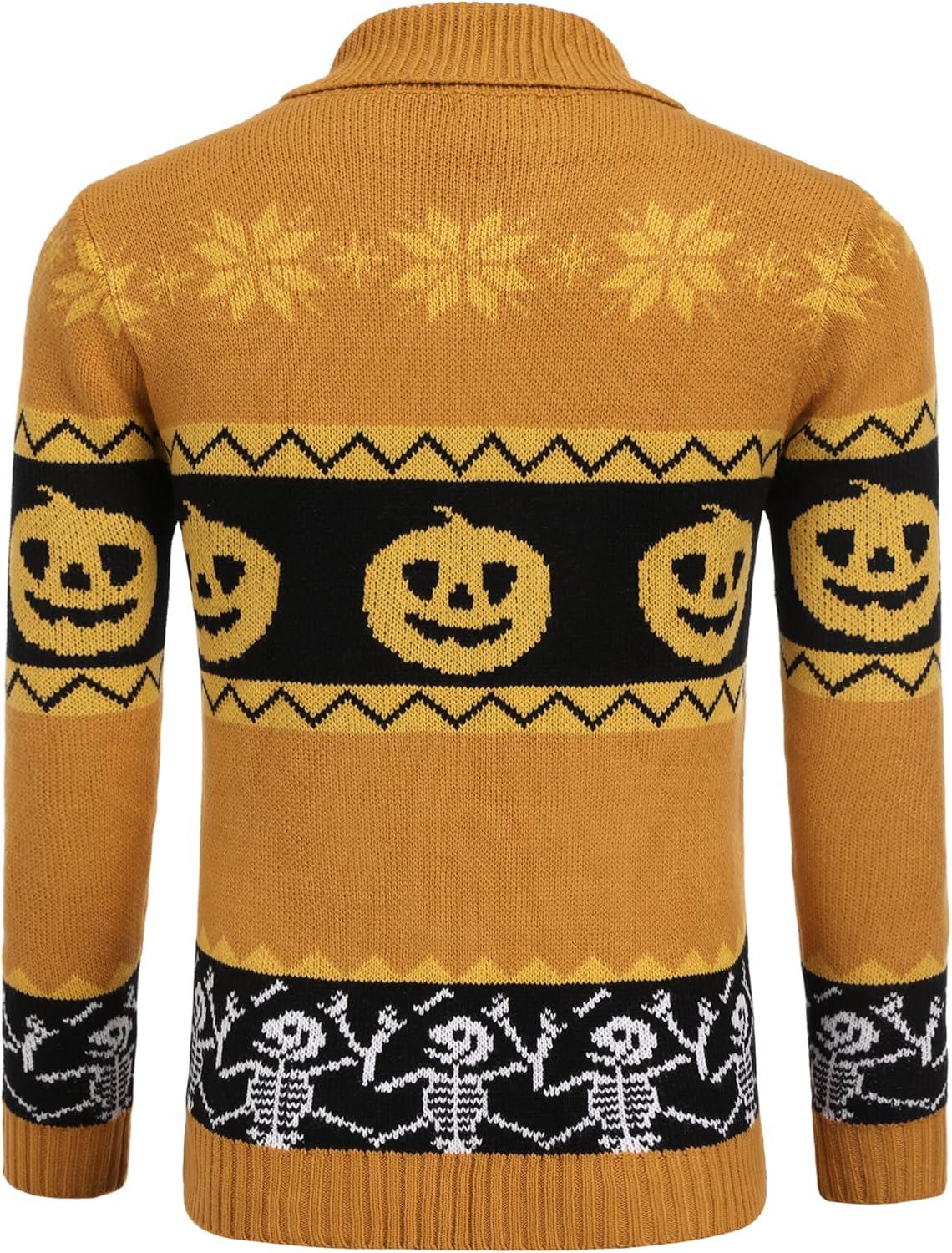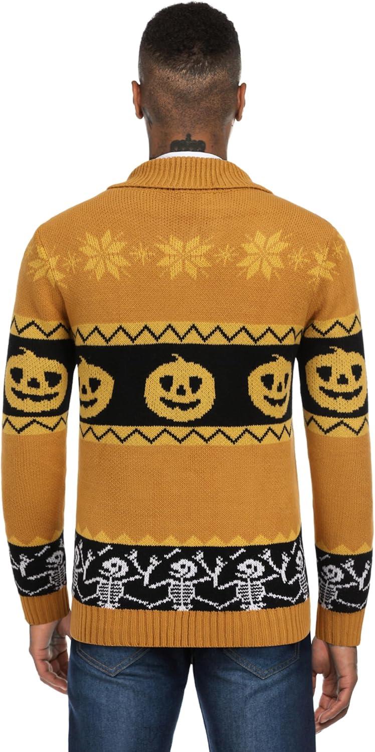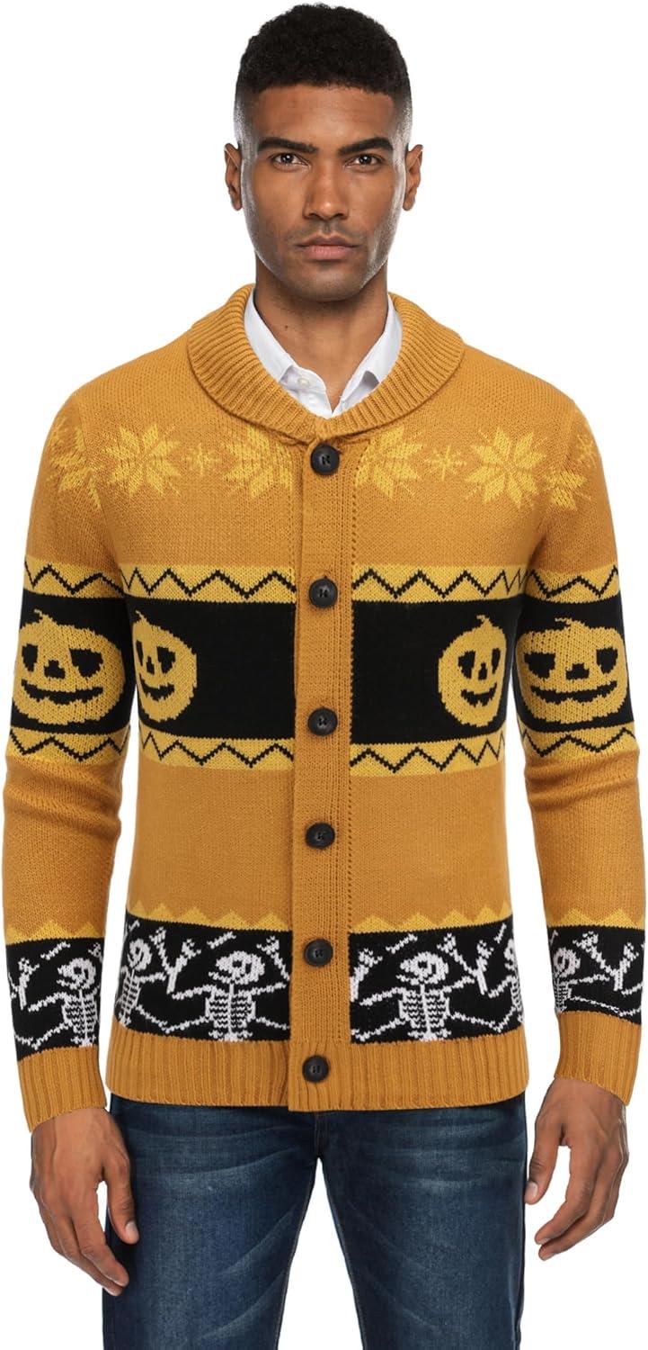 COOFANDY Men’s Christmas Cardigans Ugly Xmas Sweaters Reindeer Snowflake Shawl Collar Knitted Cardigan Sweater(Pumpkin)