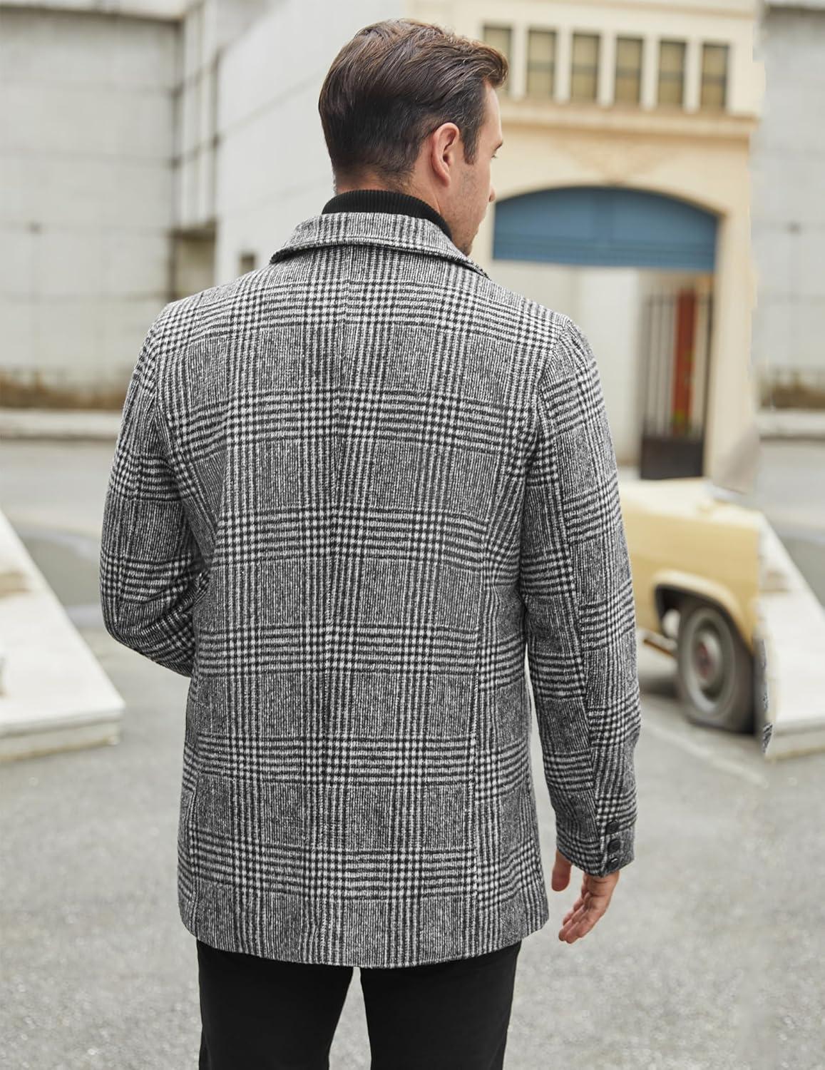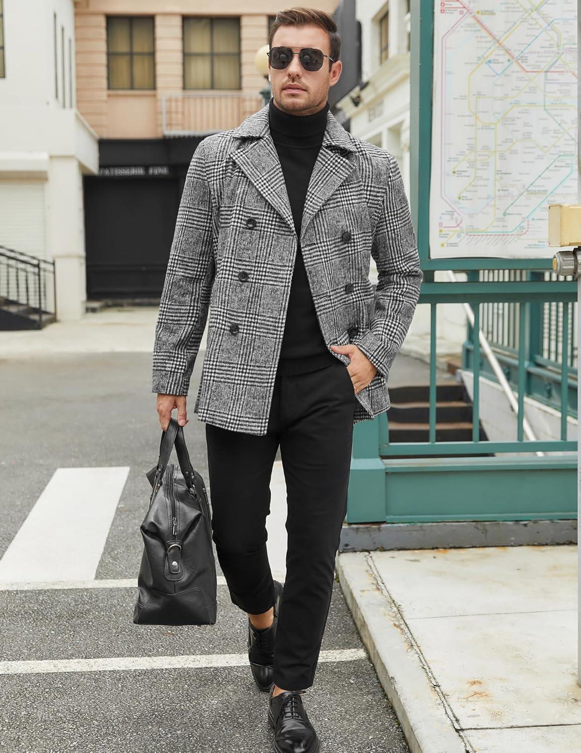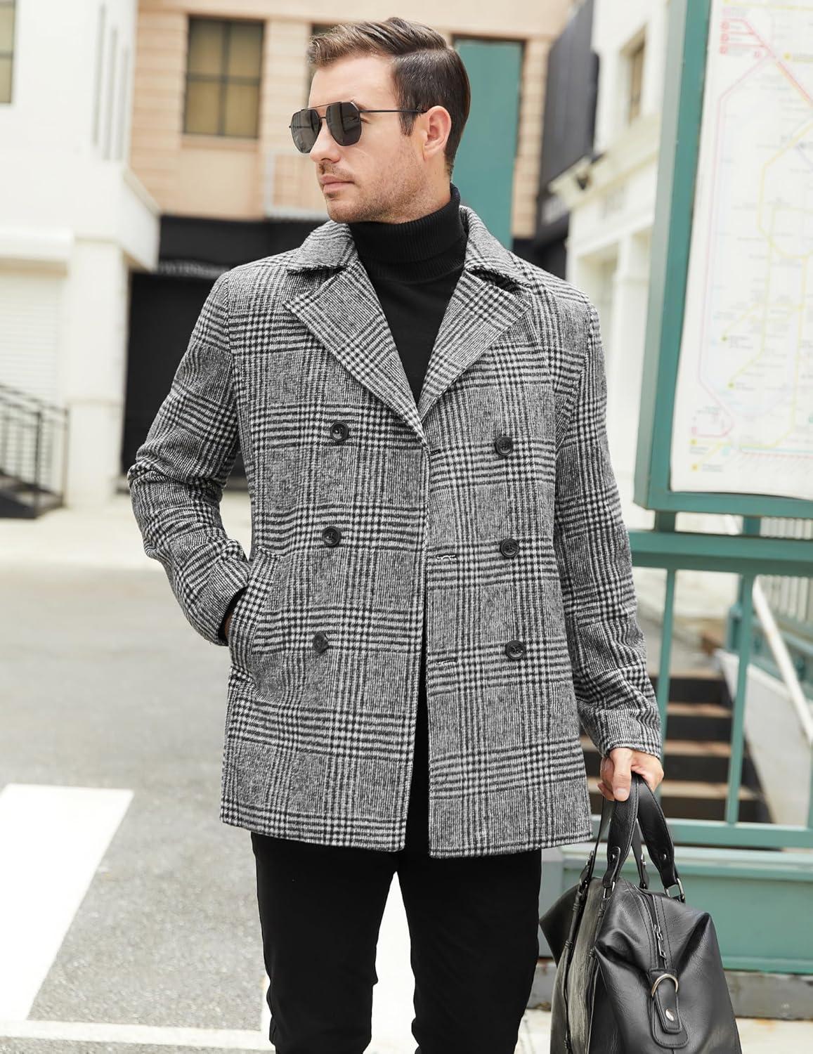 COOFANDY Men’s Double Breasted Pea Coat Winter Overcoat Short Trench Coat Notched Collar(Grey Plaid)