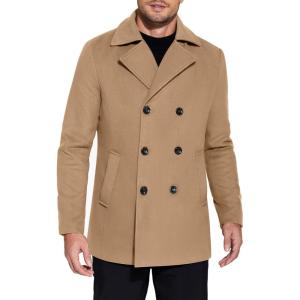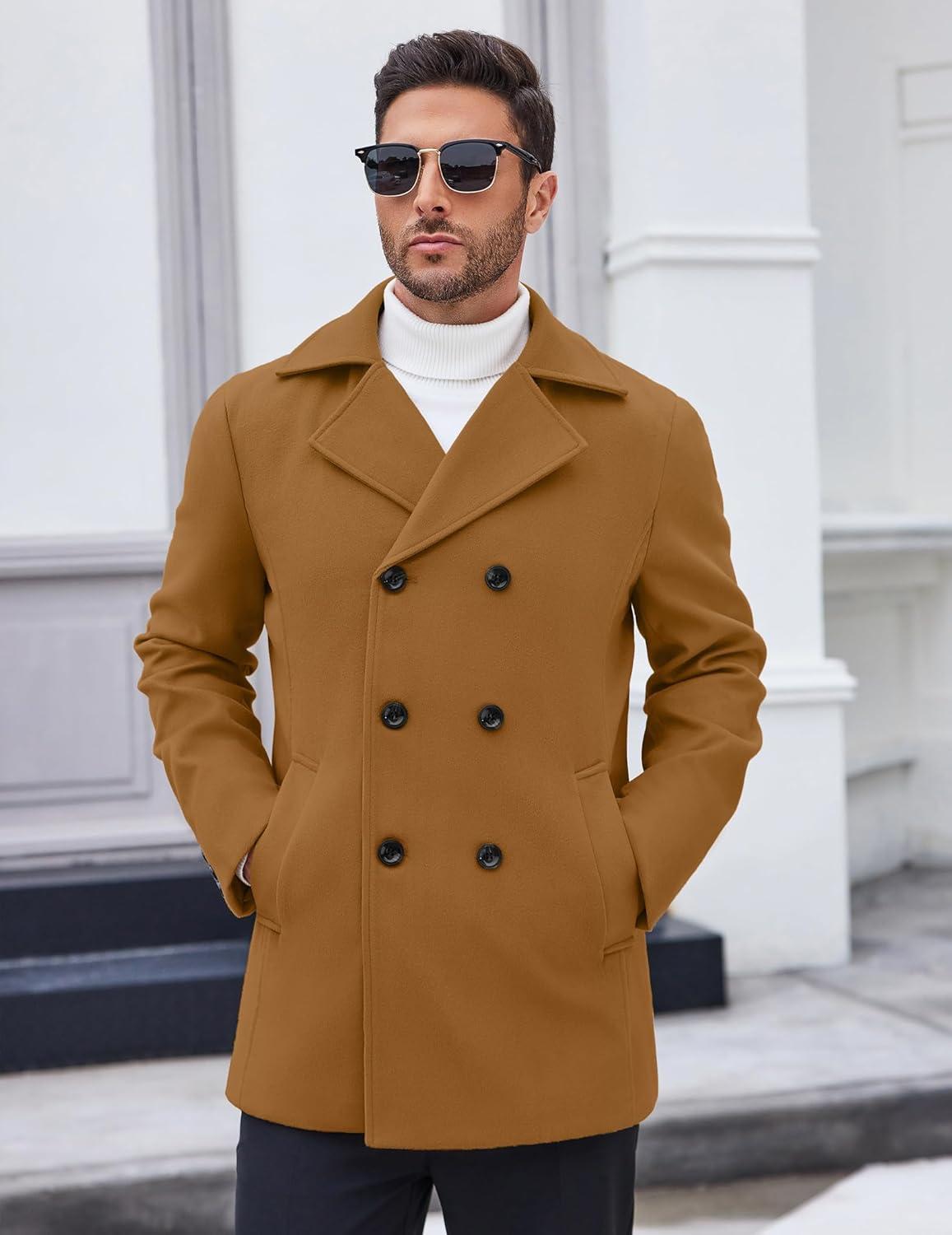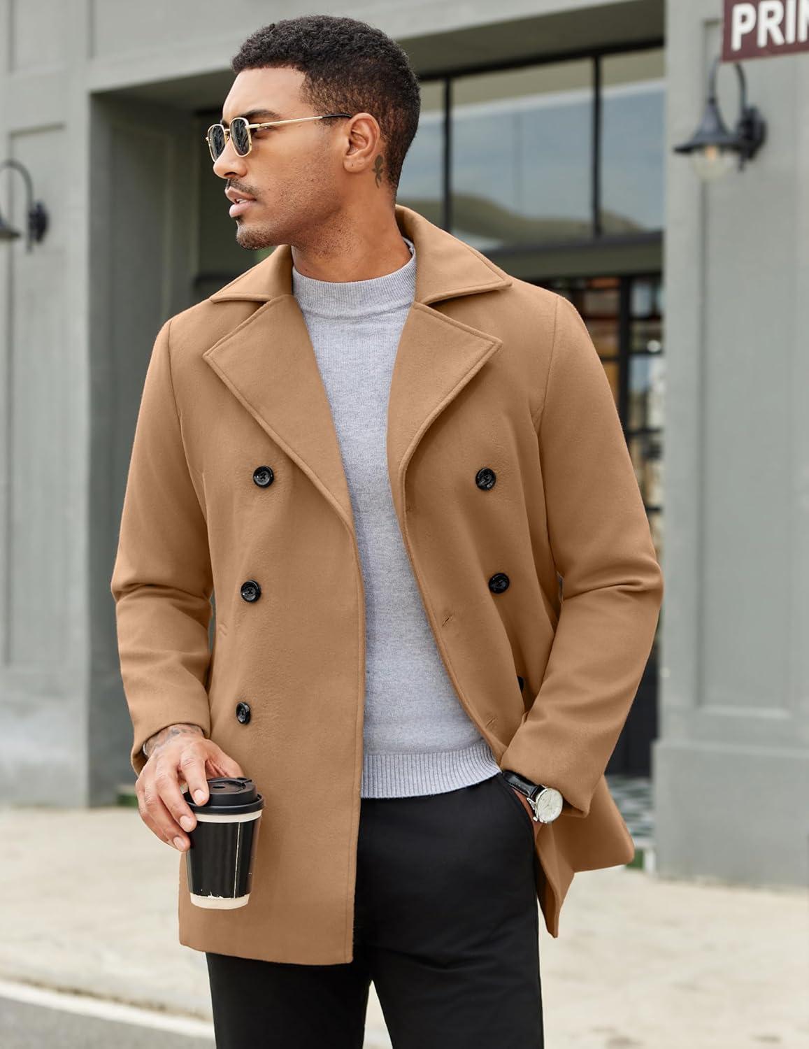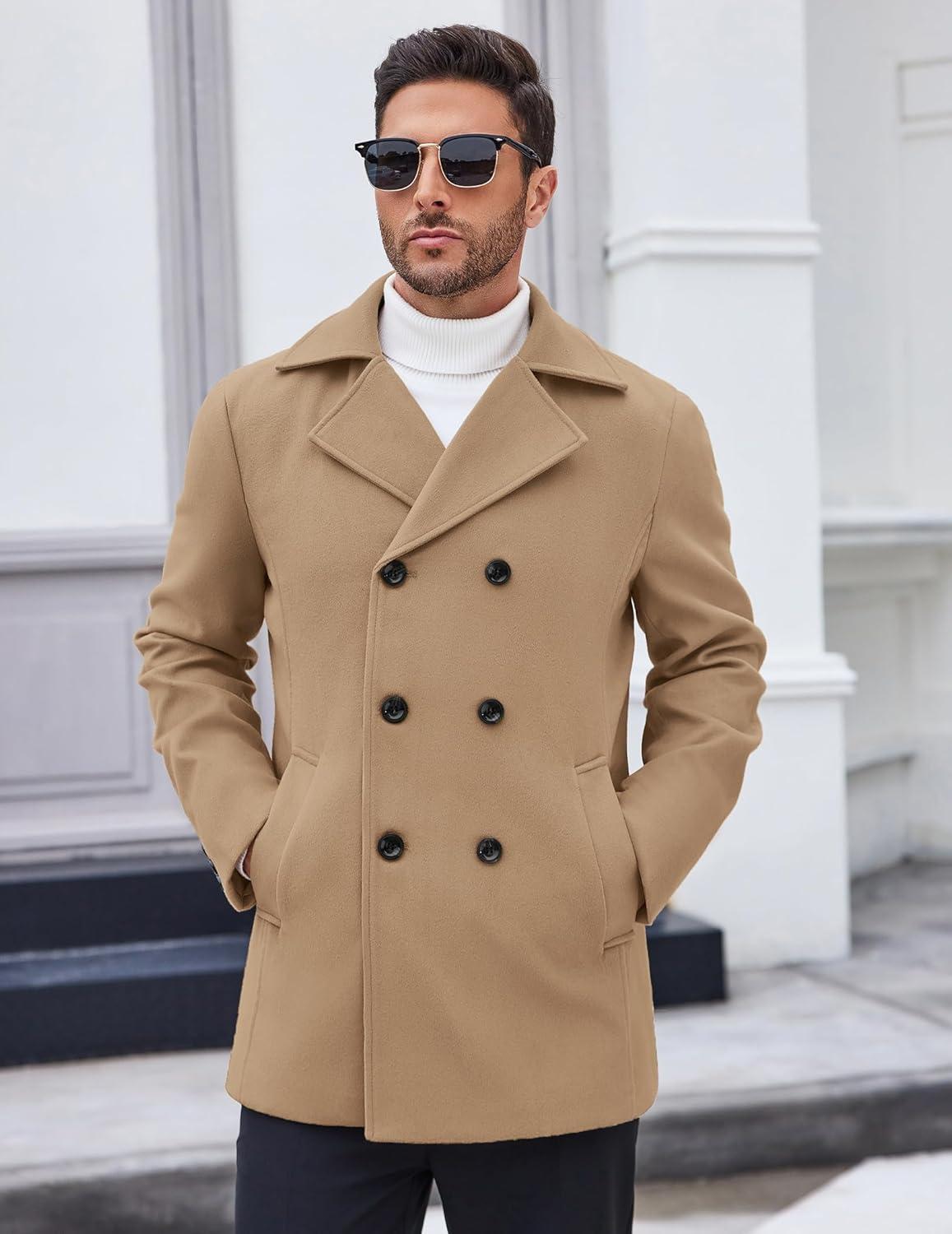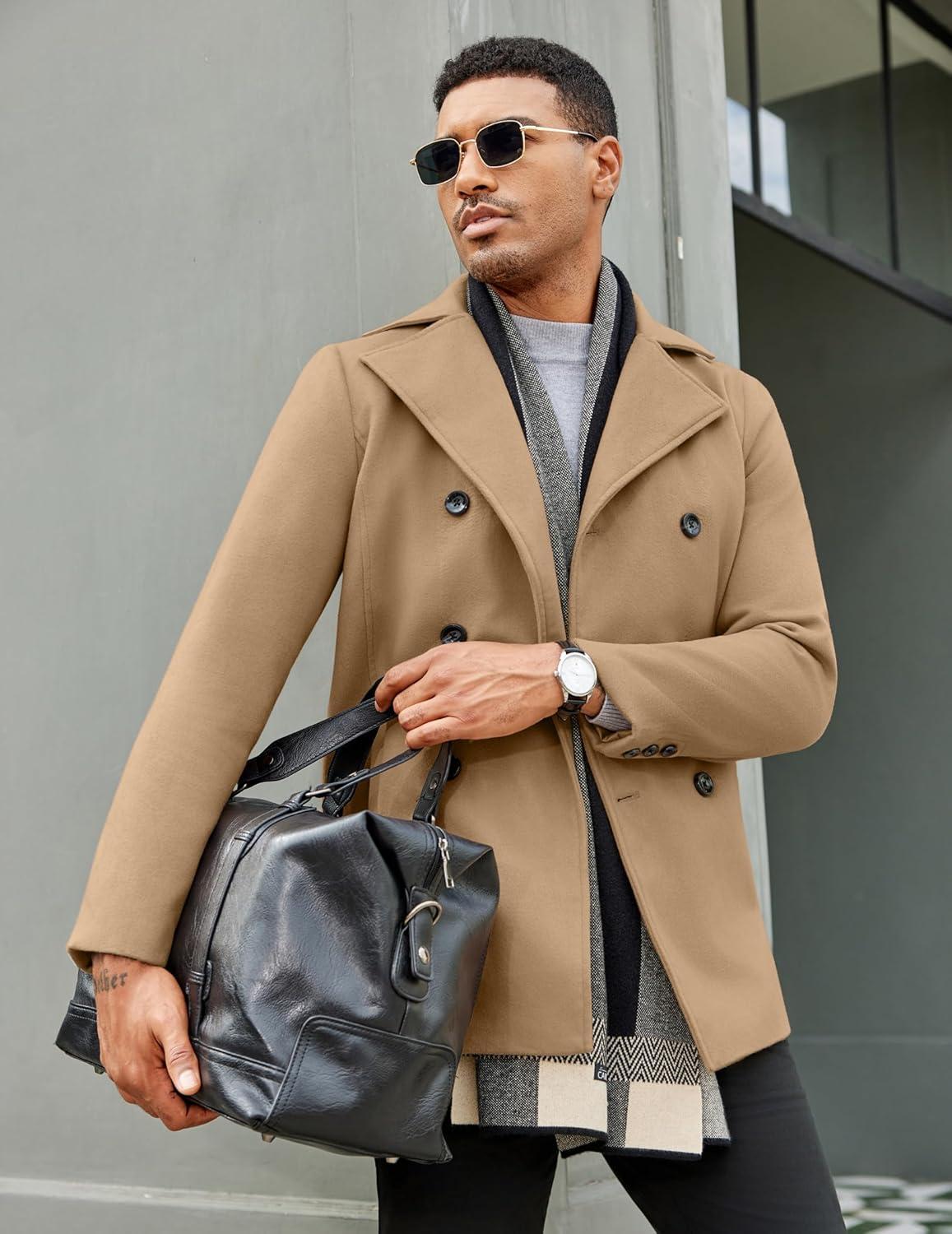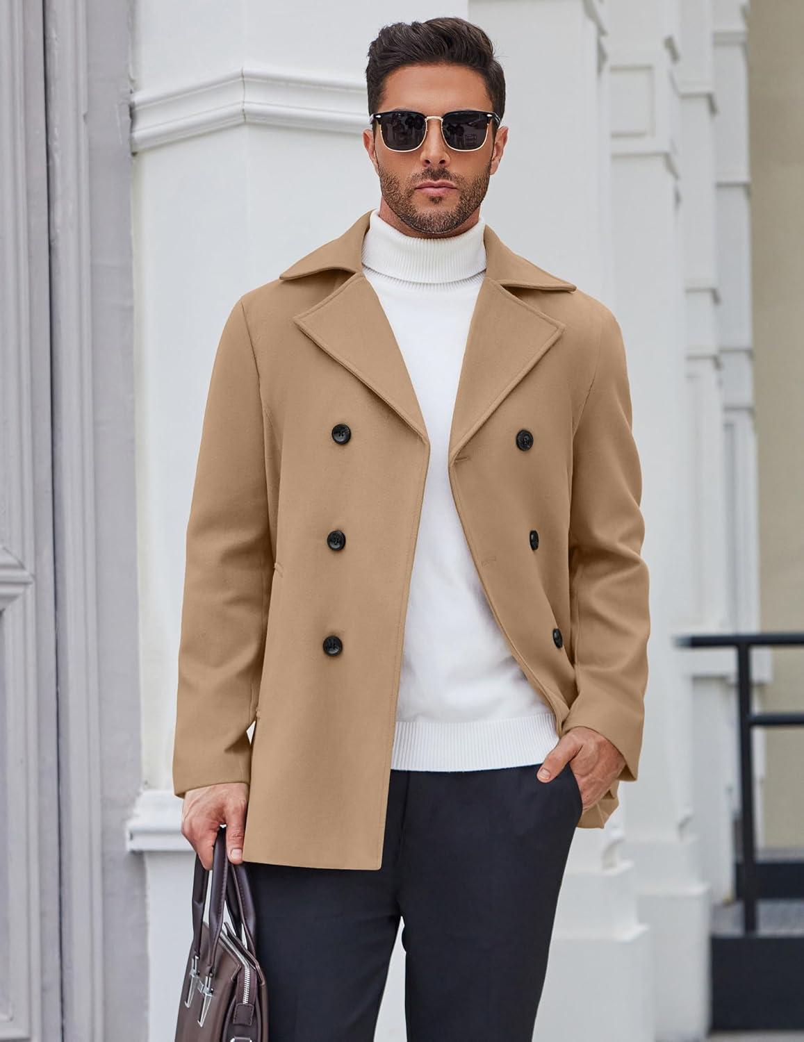 COOFANDY Men’s Double Breasted Pea Coat Winter Overcoat Short Trench Coat Notched Collar(Light Tan)