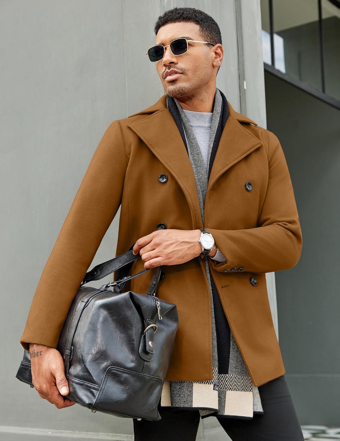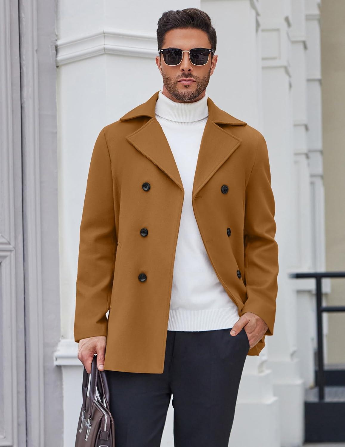 COOFANDY Men’s Double Breasted Pea Coat Winter Overcoat Short Trench Coat Notched Collar(Light Brown)
