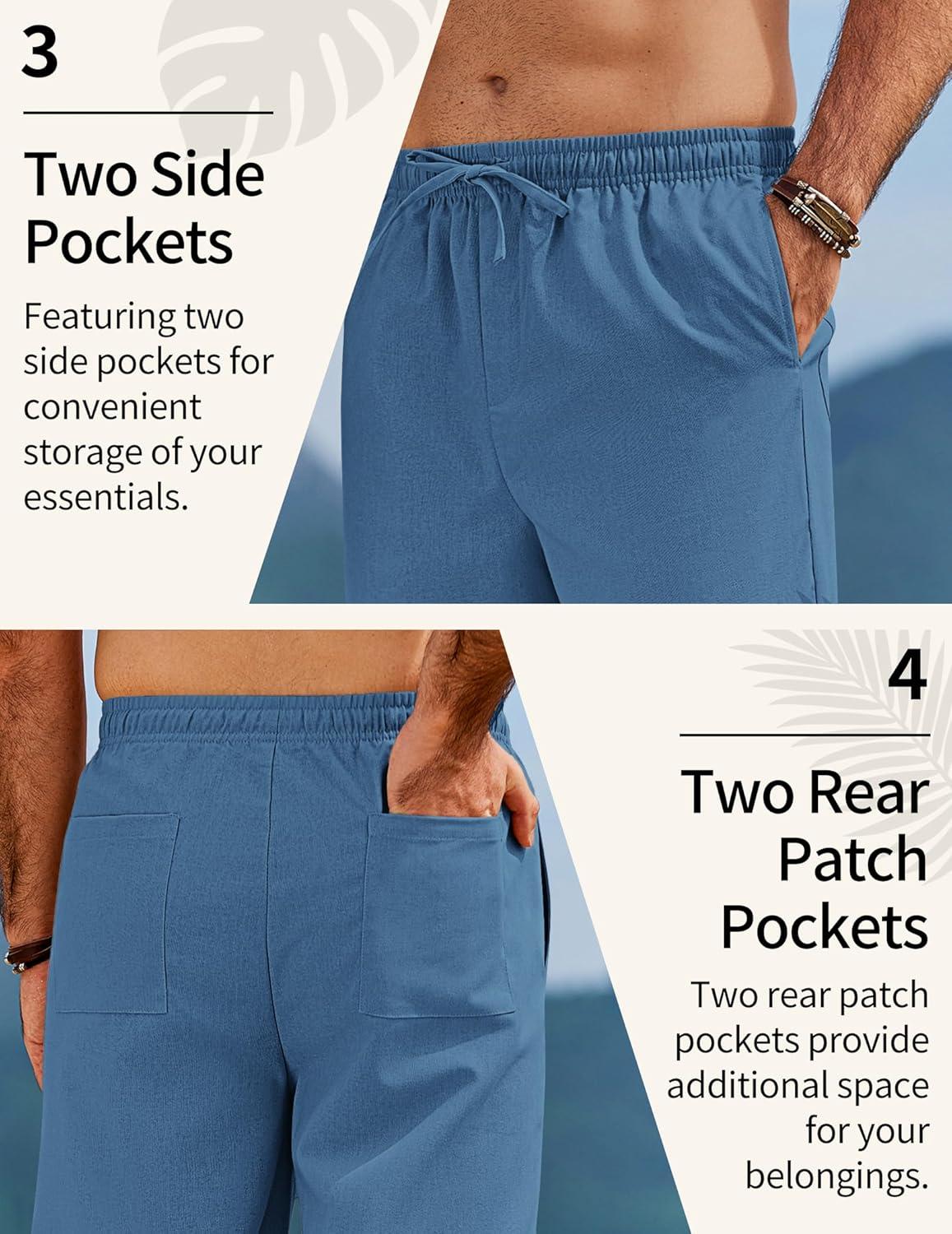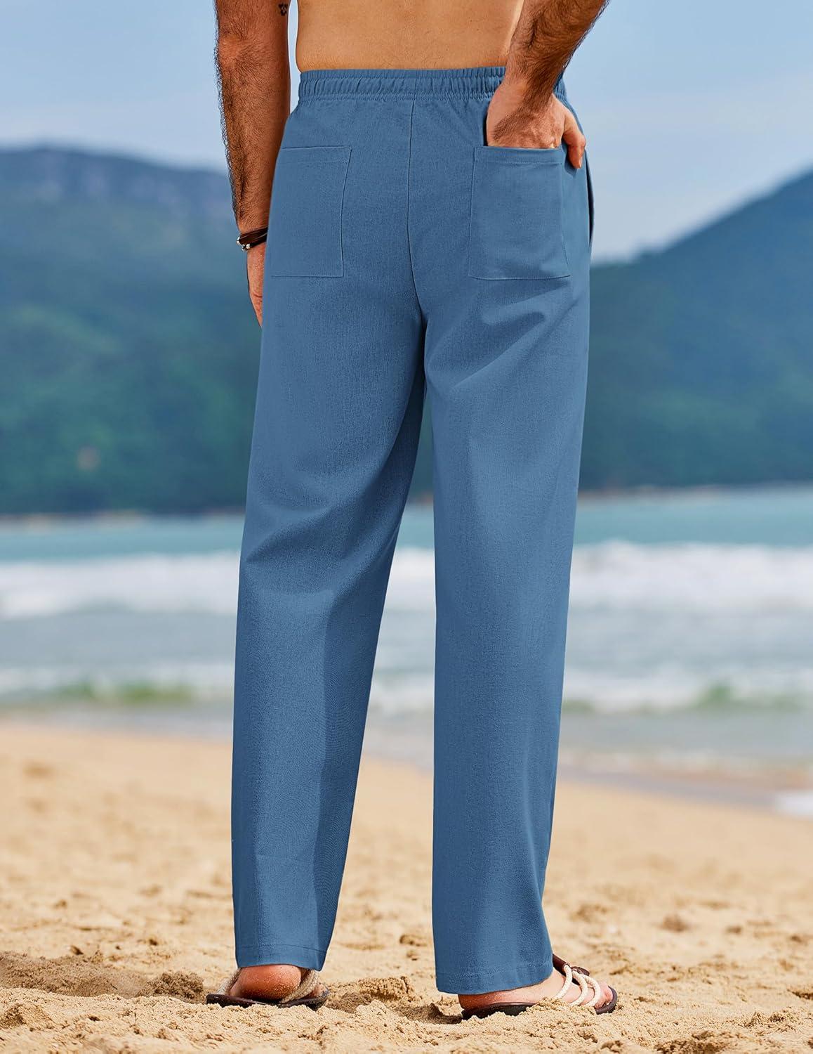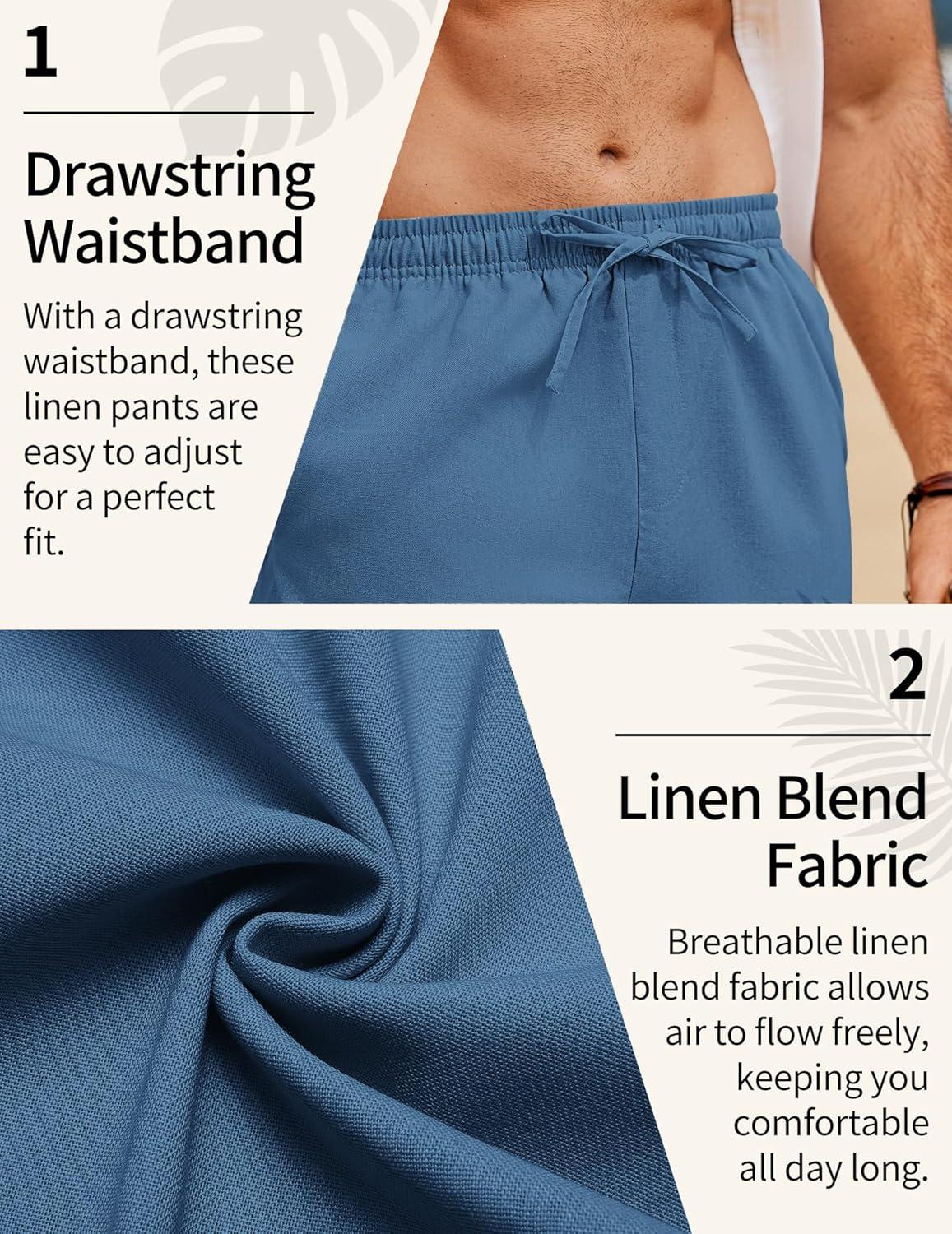 COOFANDY Men’s Linen Pants Casual Loose Fit Beach Summer Yoga Pants Lightweight Drawstring Linen Trousers(Clear Blue)