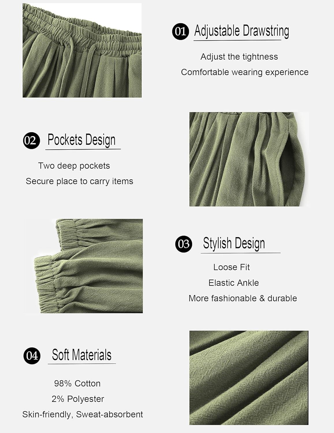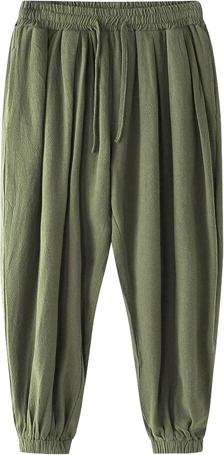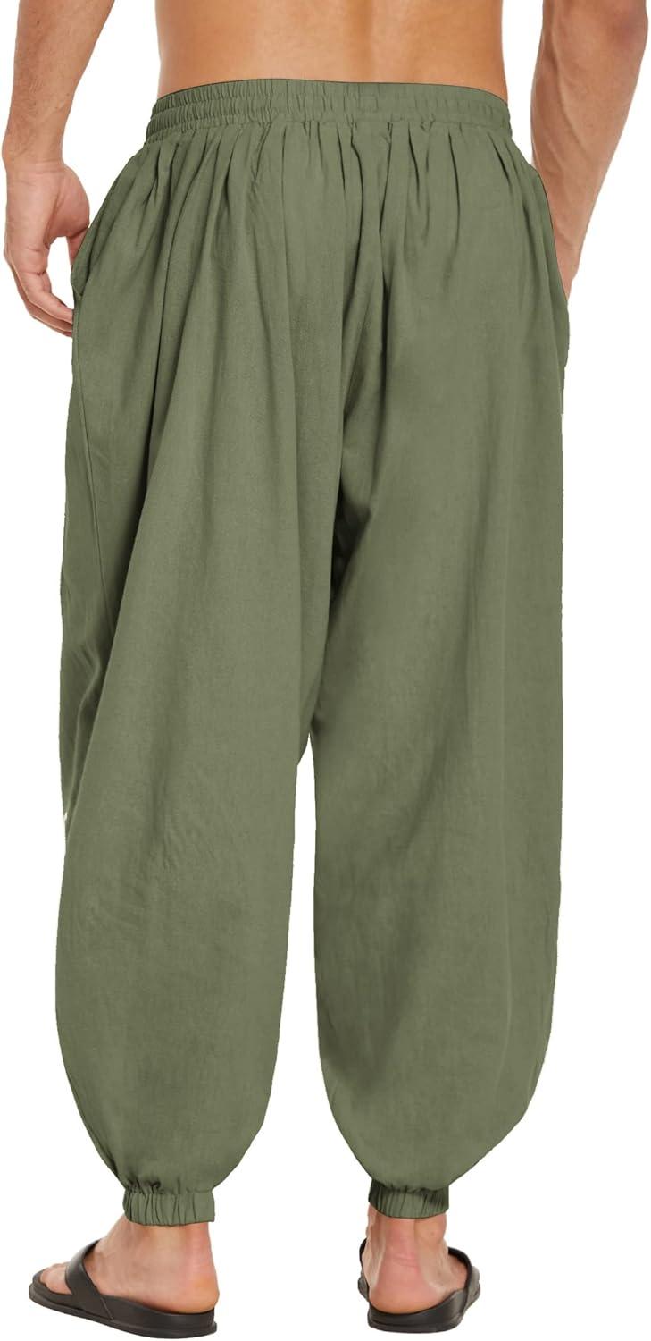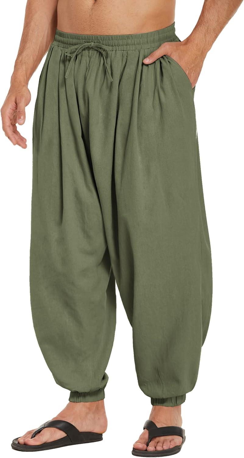 COOFANDY Men Hippie Harem Pants Baggy Linen Cotton Boho Yoga Pants Summer Beach Pants Casual Drop Crotch Trouser(Army Green)