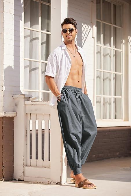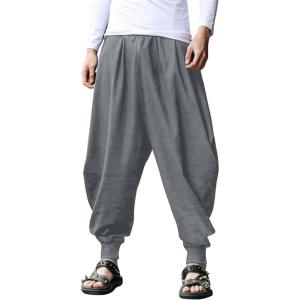 COOFANDY Men Hippie Harem Pants Baggy Linen Cotton Boho Yoga Pants Summer Beach Pants Casual Drop Crotch Trouser(Dark Grey)