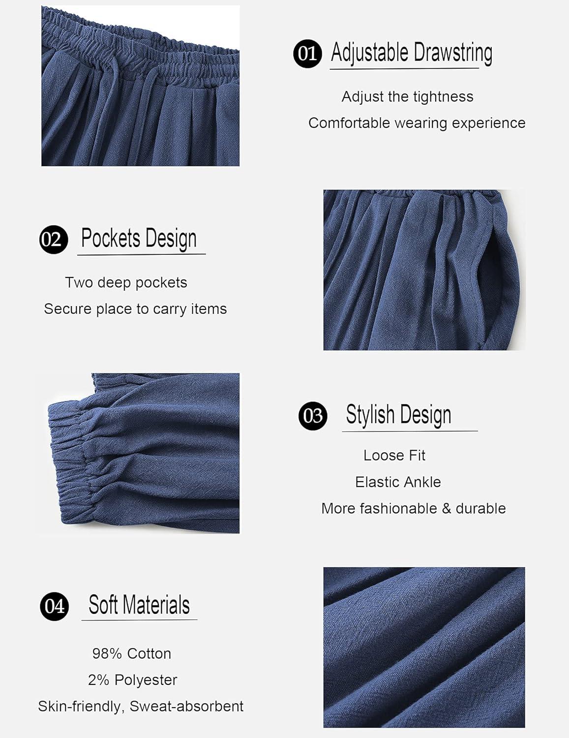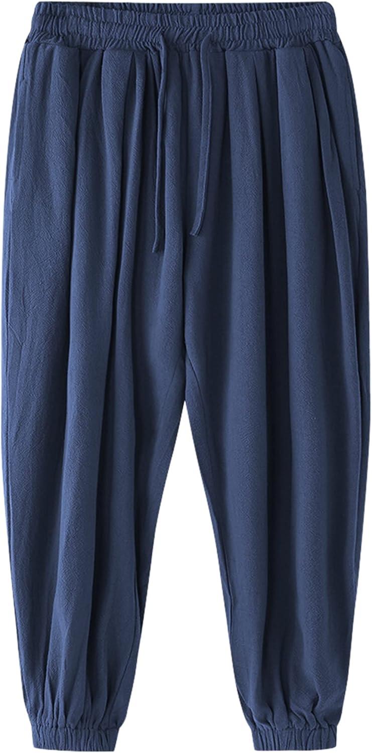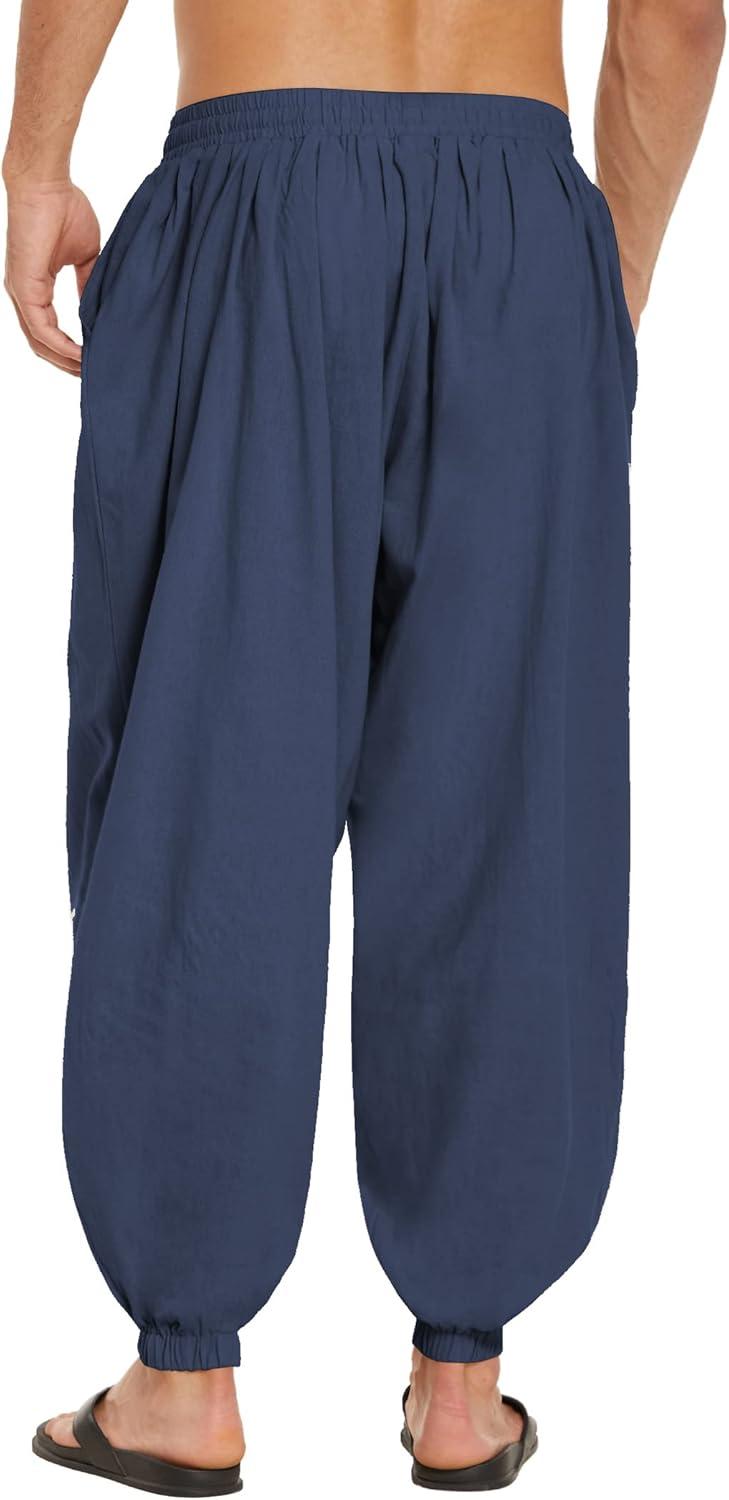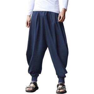 COOFANDY Men Hippie Harem Pants Baggy Linen Cotton Boho Yoga Pants Summer Beach Pants Casual Drop Crotch Trouser(Navy Blue)