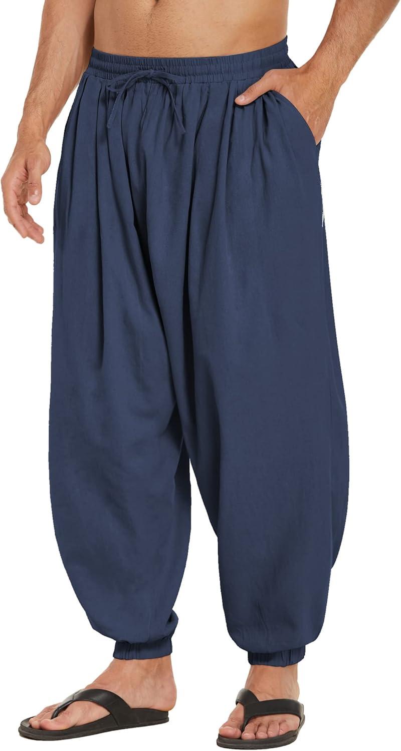 COOFANDY Men Hippie Harem Pants Baggy Linen Cotton Boho Yoga Pants Summer Beach Pants Casual Drop Crotch Trouser(Pure Blue)