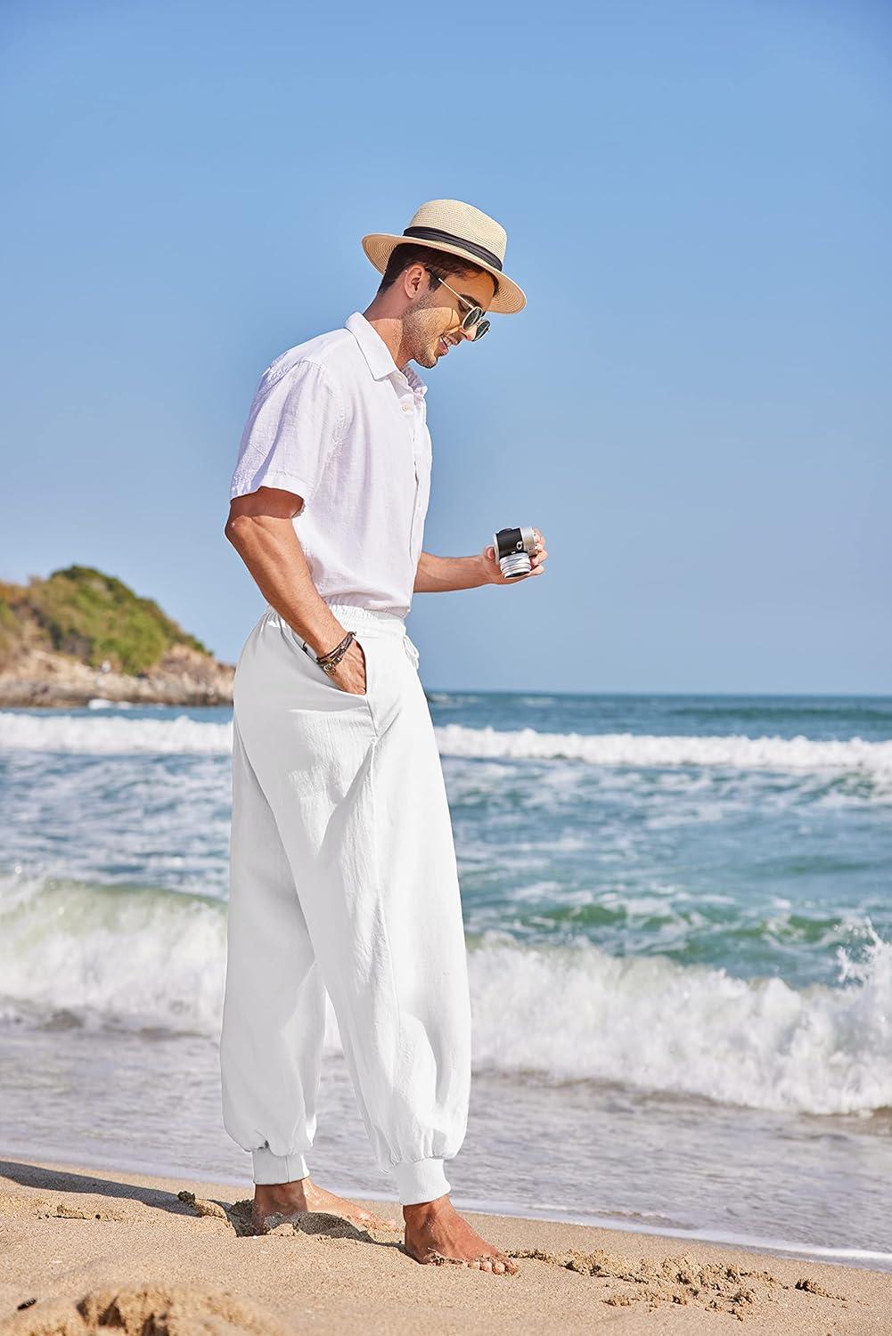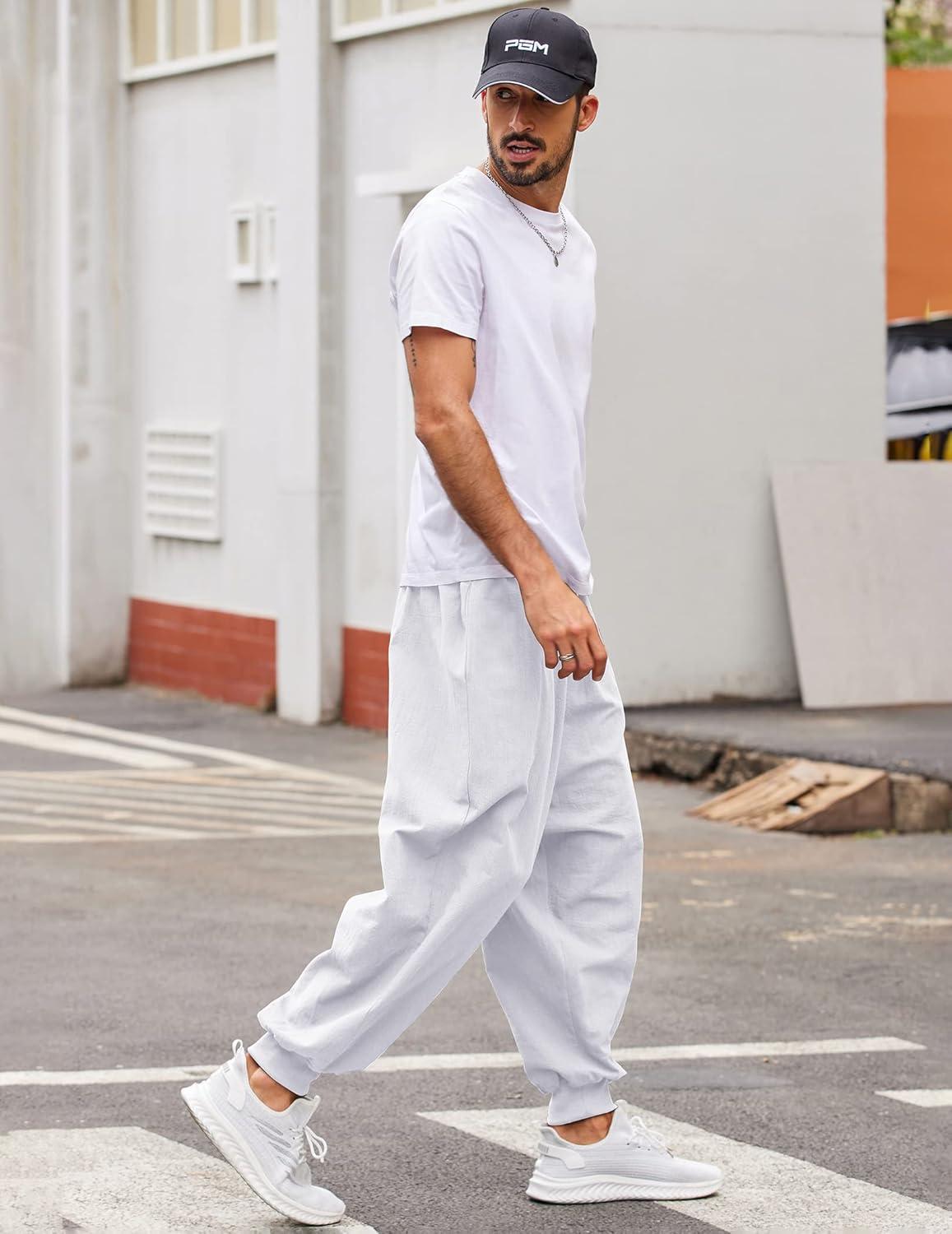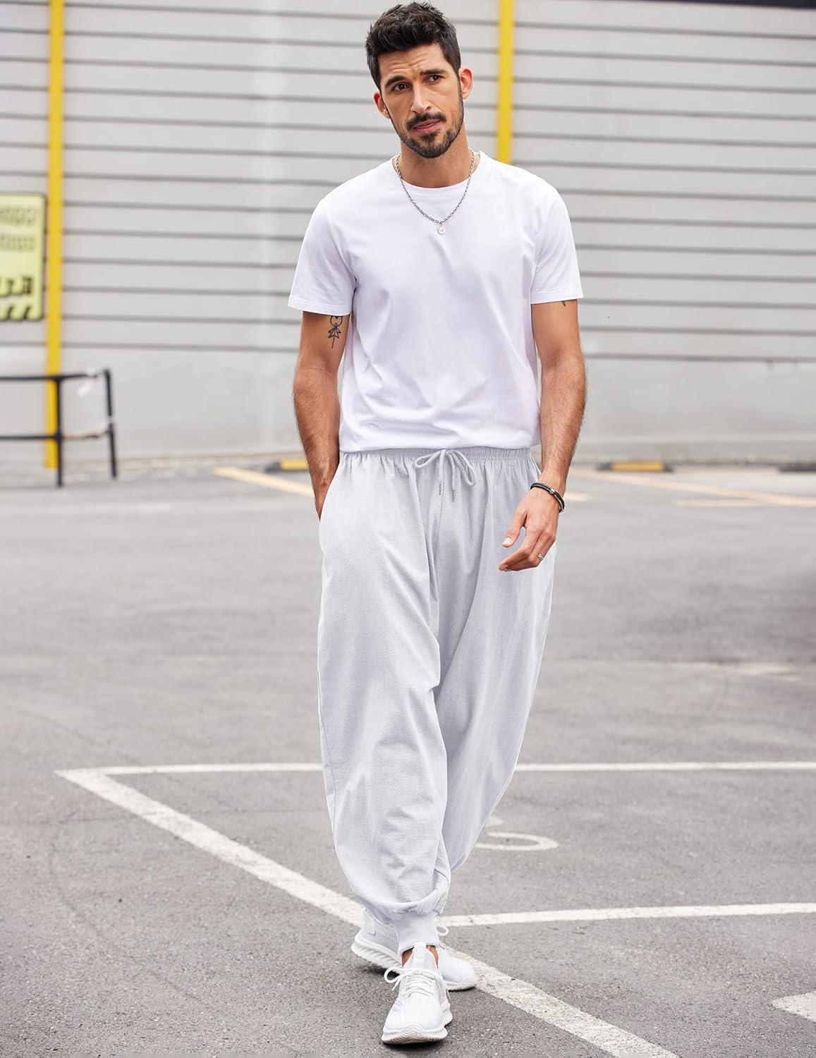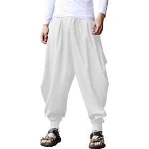 COOFANDY Men Hippie Harem Pants Baggy Linen Cotton Boho Yoga Pants Summer Beach Pants Casual Drop Crotch Trouser(White)