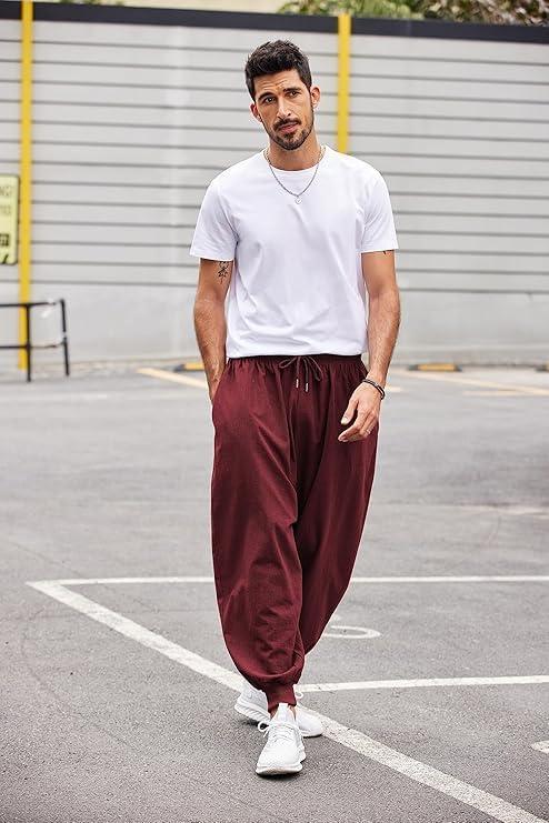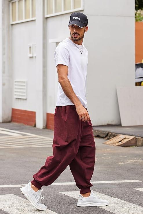 COOFANDY Men Hippie Harem Pants Baggy Linen Cotton Boho Yoga Pants Summer Beach Pants Casual Drop Crotch Trouser(Wine Red)