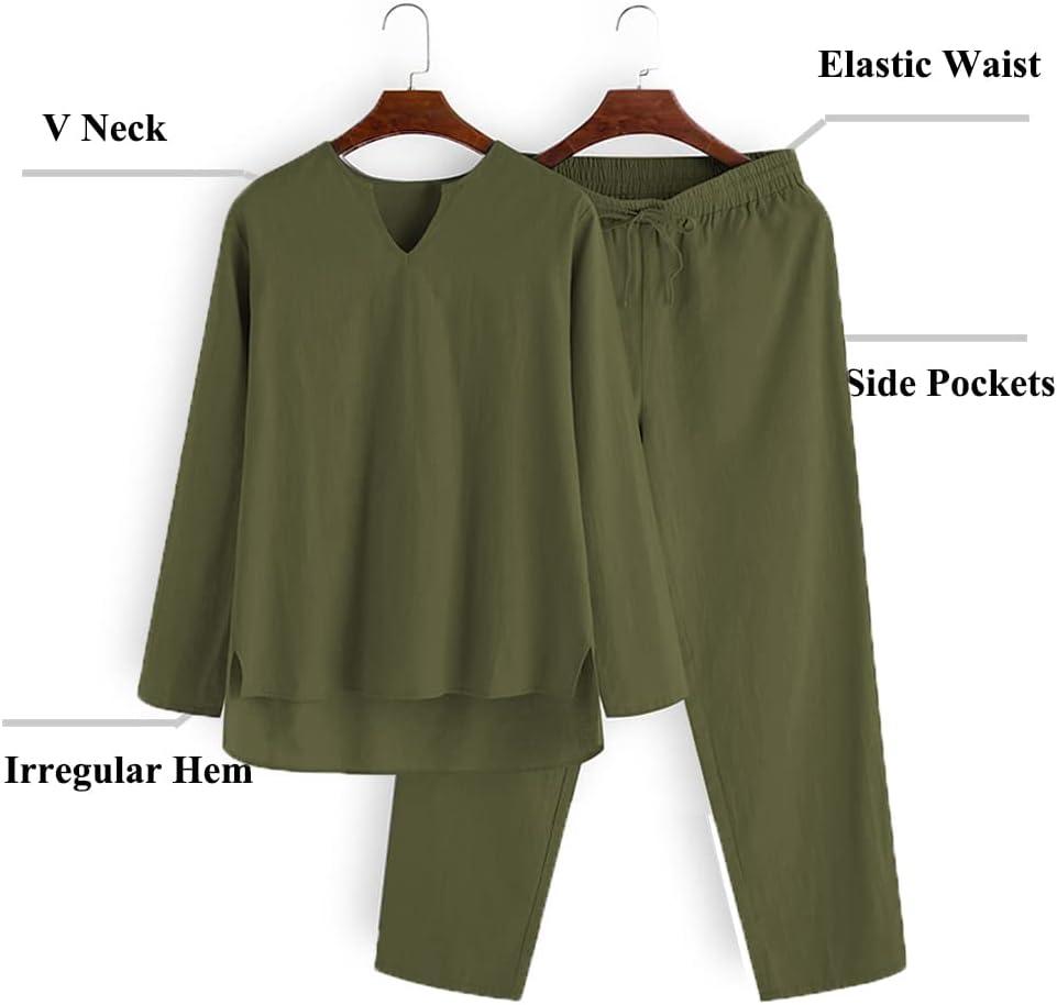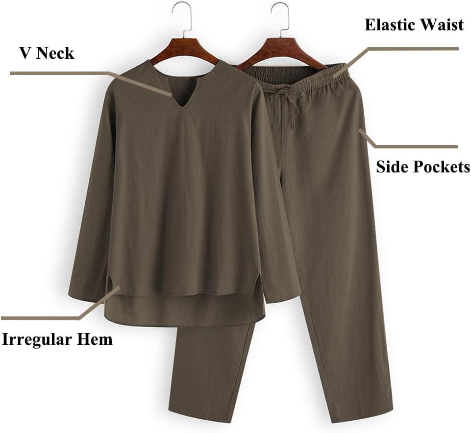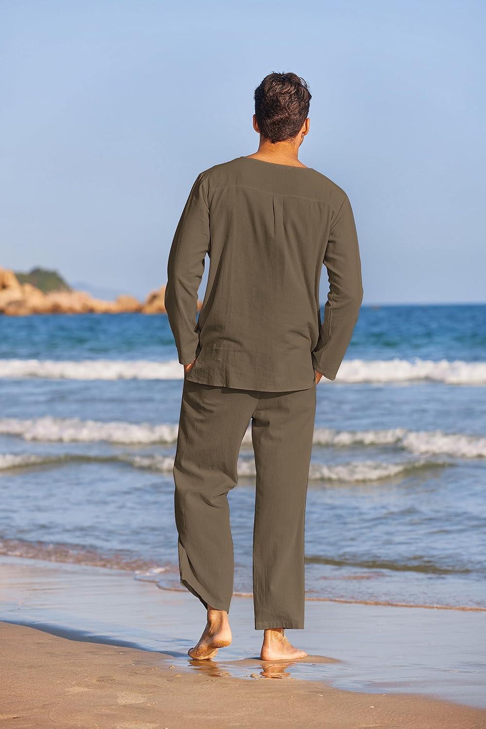 COOFANDY Men’s 2 Pieces Cotton Linen Set Henley Shirt Long Sleeve and Casual Beach Pants Summer Yoga Outfits(Army Green)