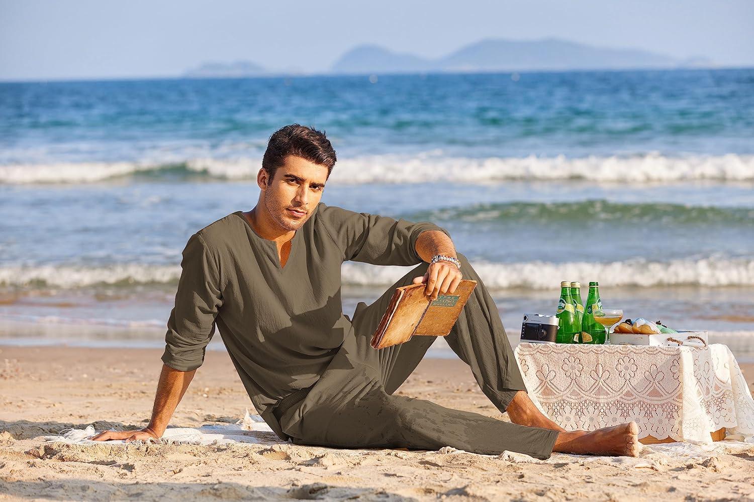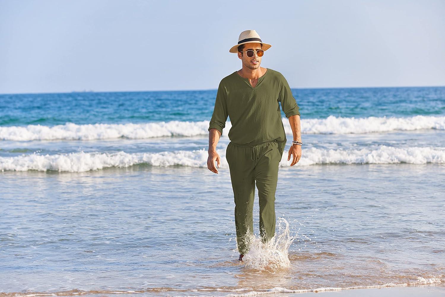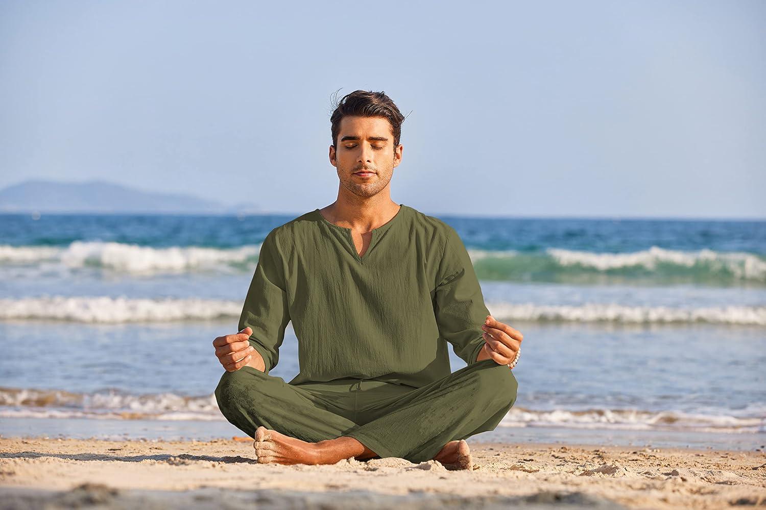 COOFANDY Men’s 2 Pieces Cotton Linen Set Henley Shirt Long Sleeve and Casual Beach Pants Summer Yoga Outfits(Army Green)