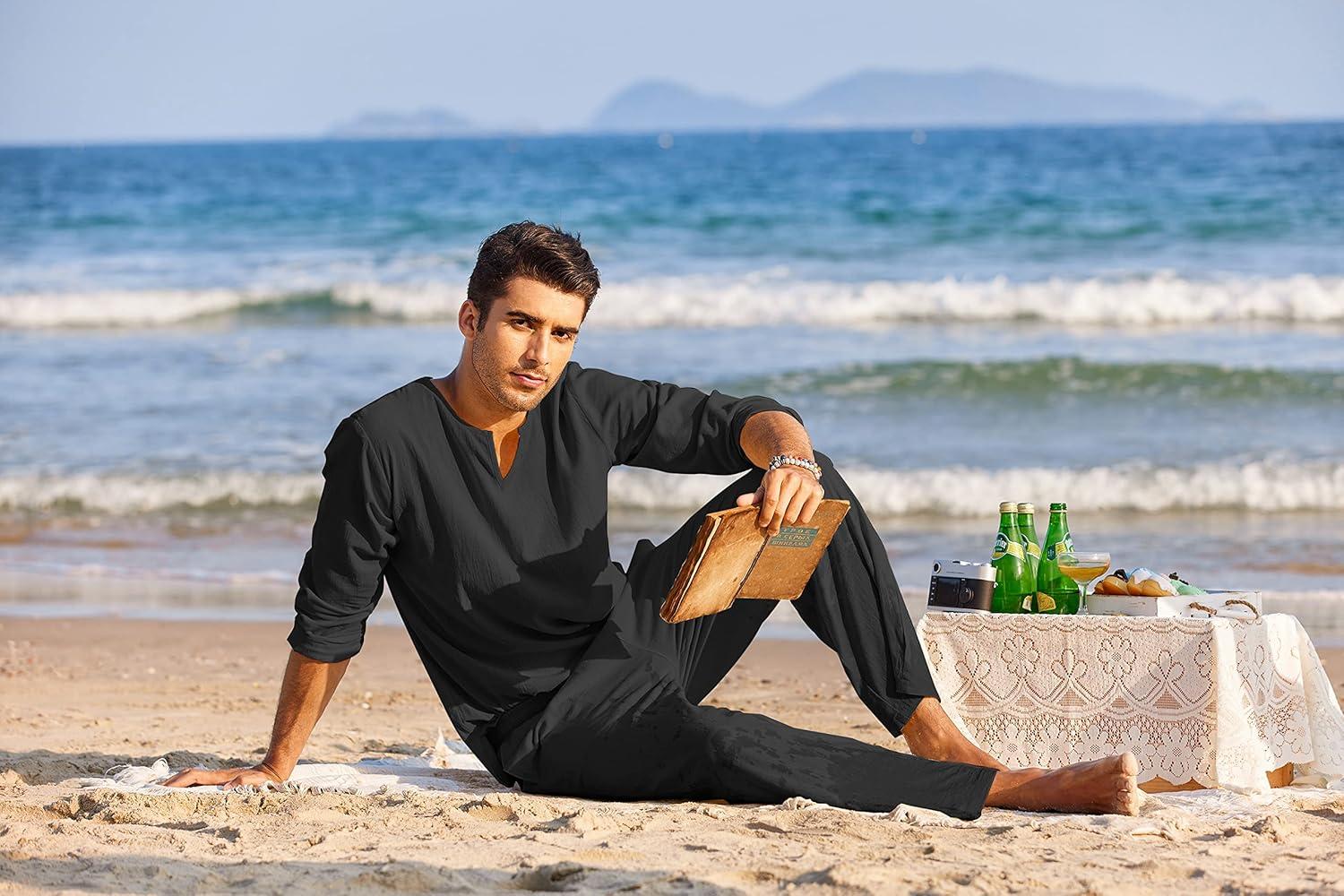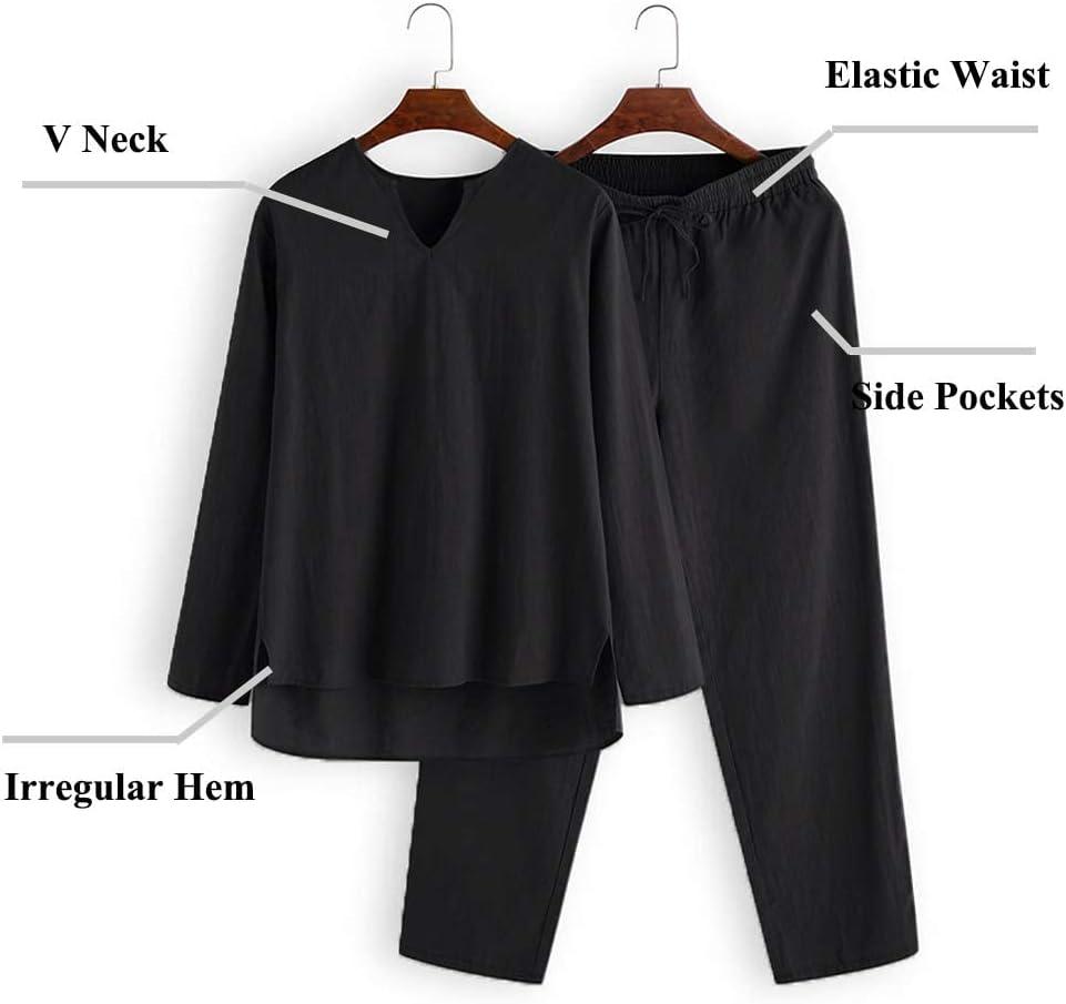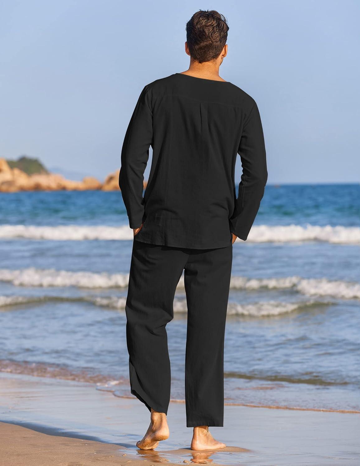 COOFANDY Men’s 2 Pieces Cotton Linen Set Henley Shirt Long Sleeve and Casual Beach Pants Summer Yoga Outfits(Black)