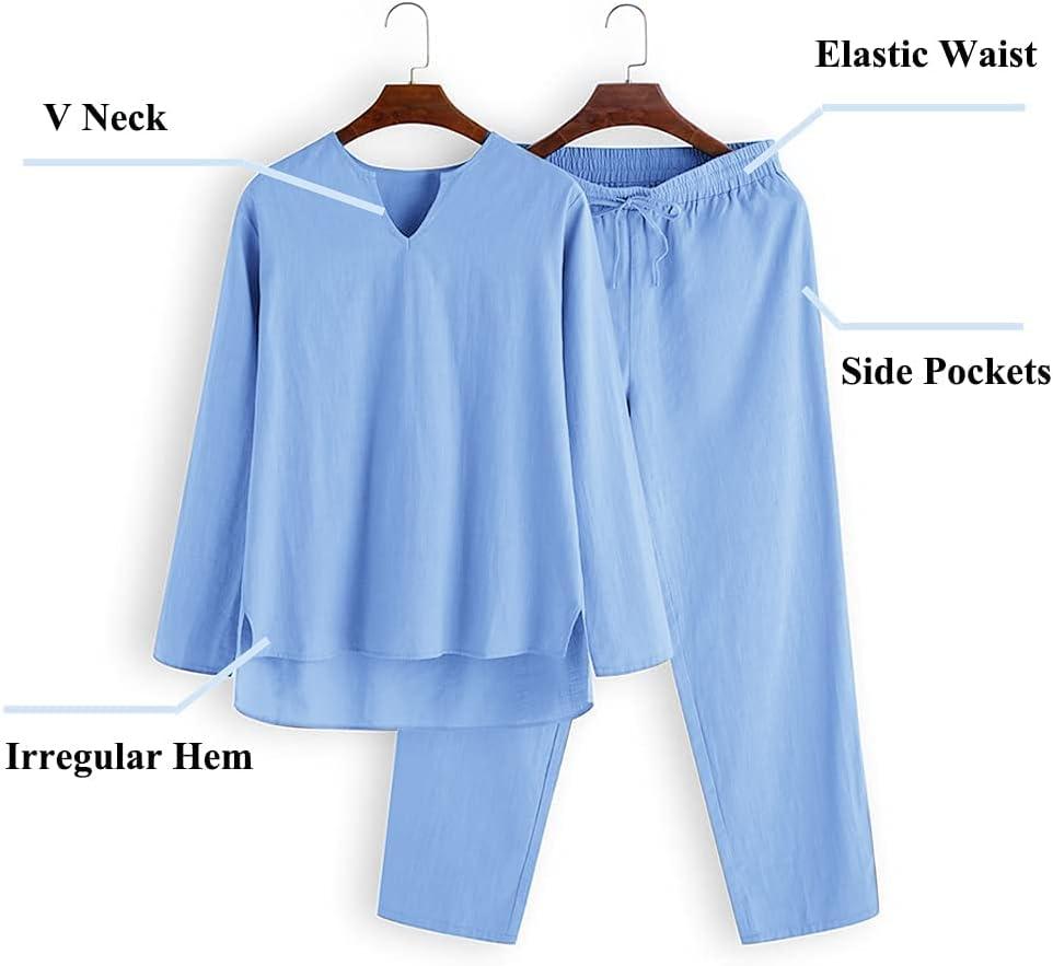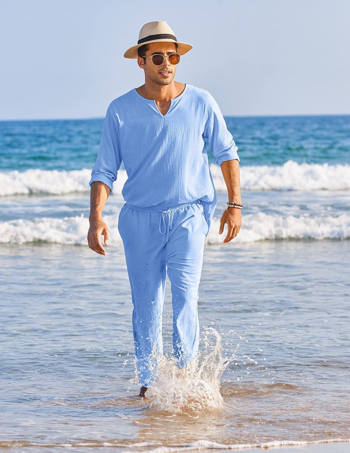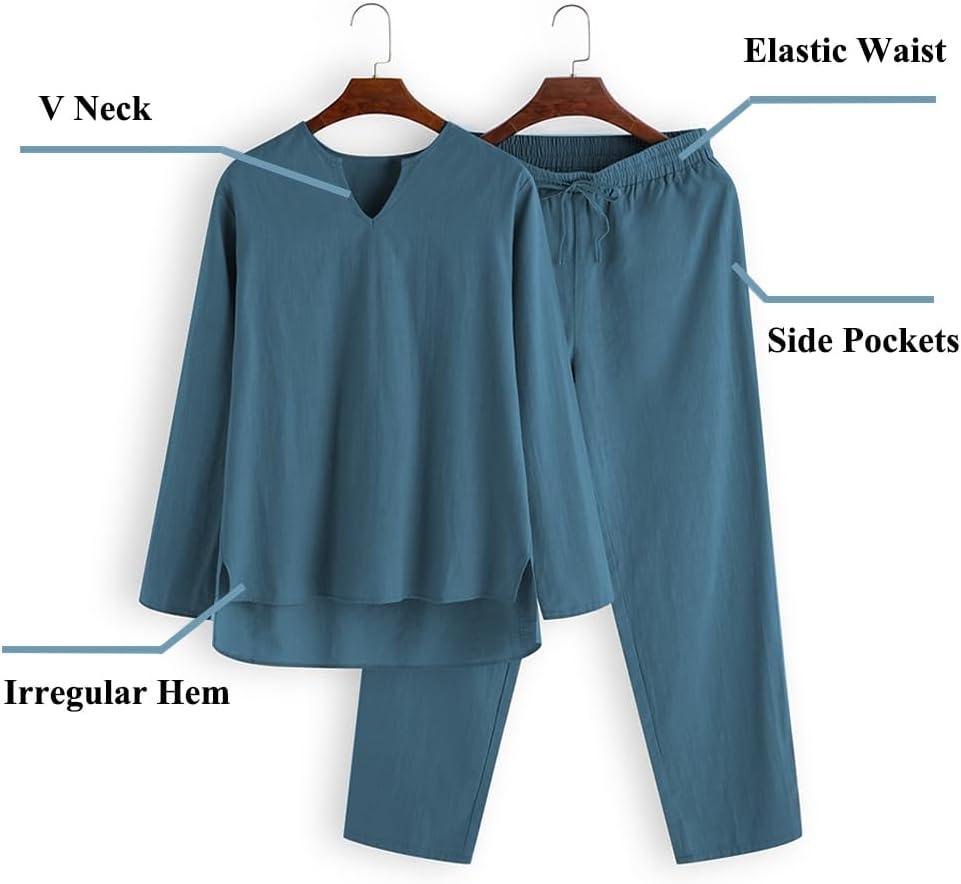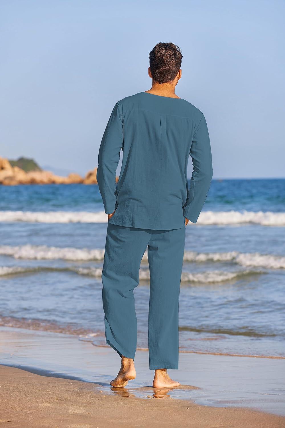 COOFANDY Men’s 2 Pieces Cotton Linen Set Henley Shirt Long Sleeve and Casual Beach Pants Summer Yoga Outfits(Blue)