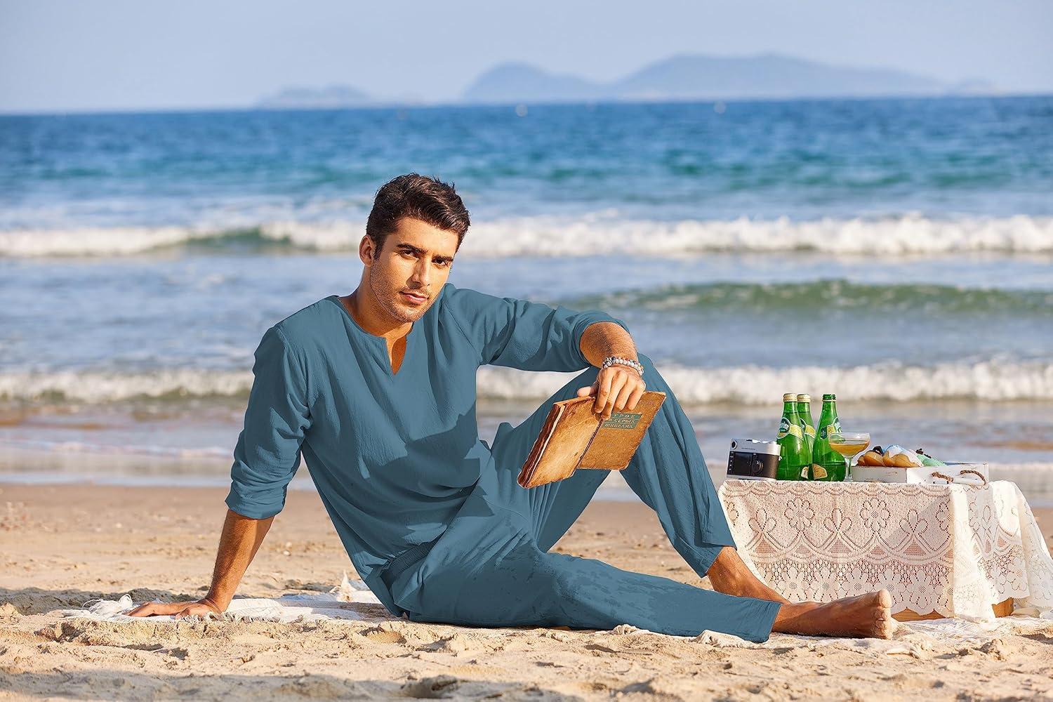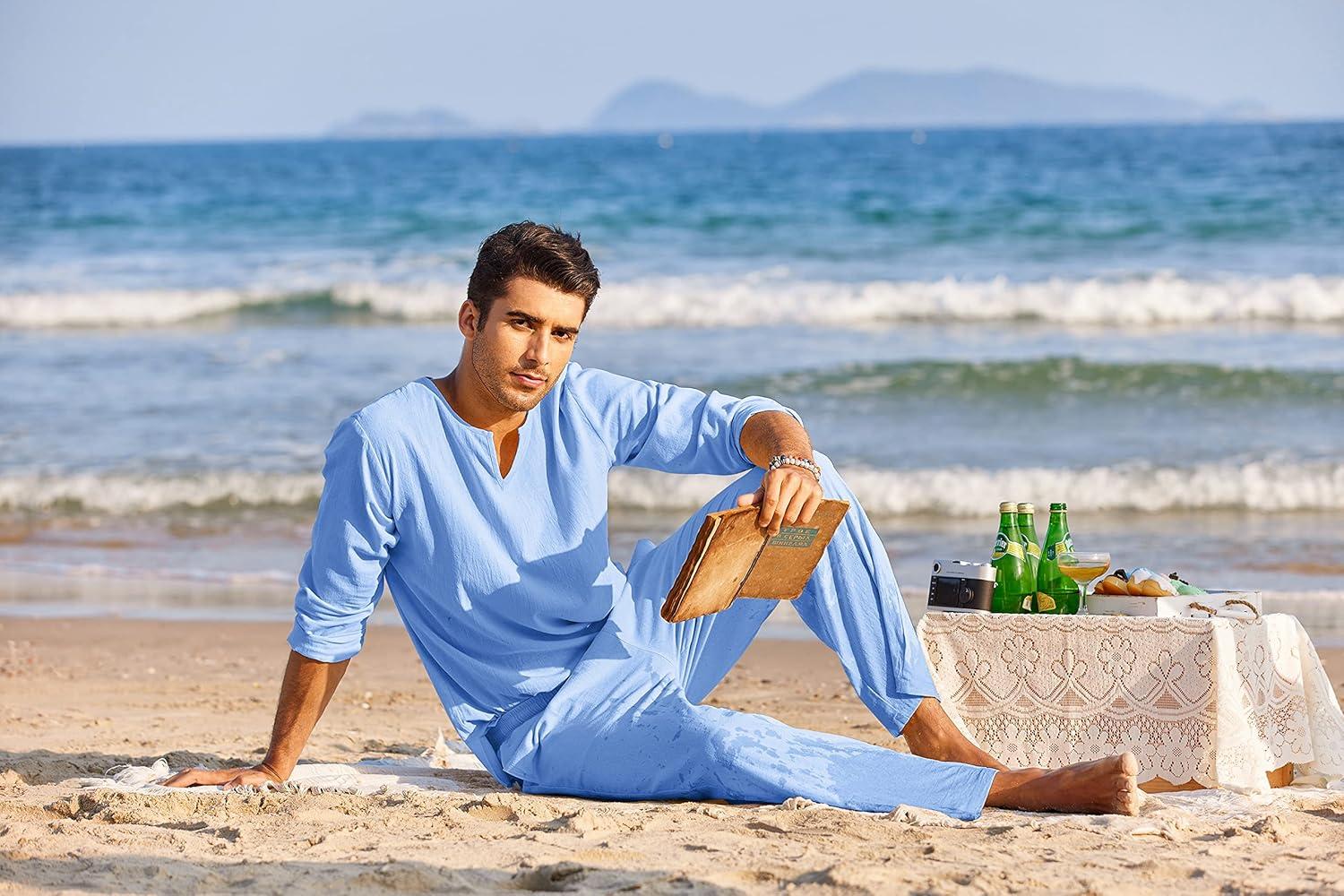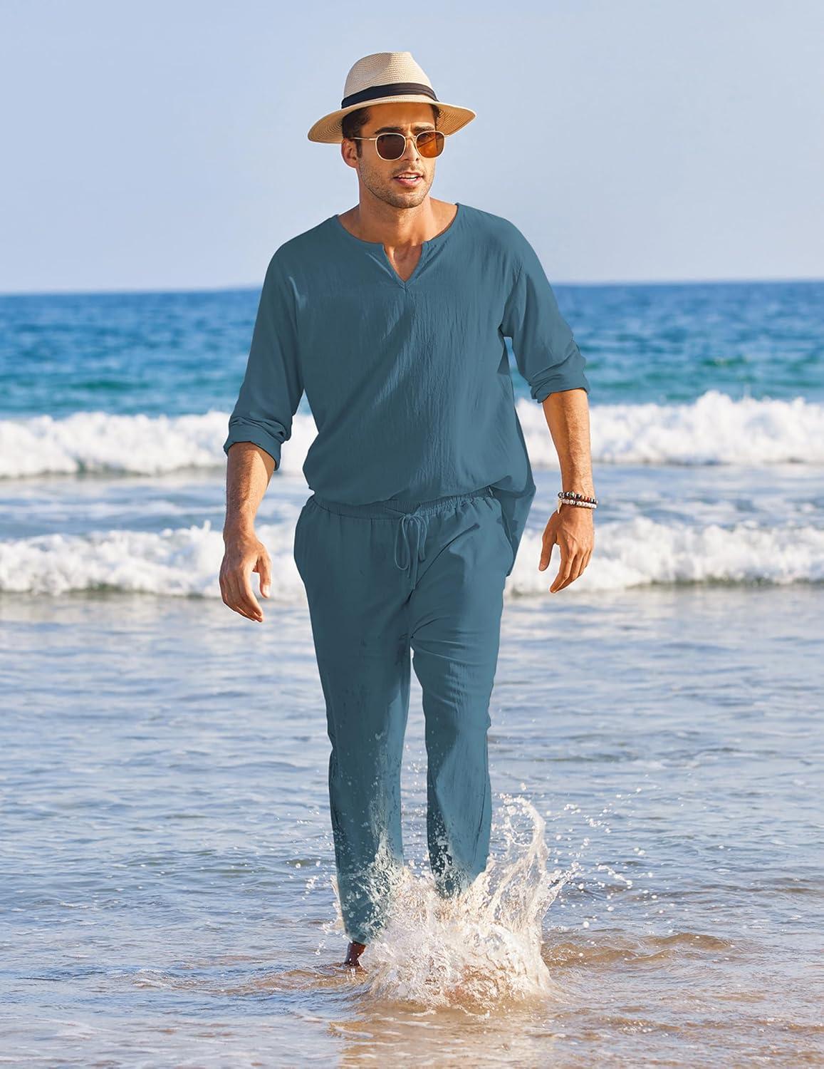 COOFANDY Men’s 2 Pieces Cotton Linen Set Henley Shirt Long Sleeve and Casual Beach Pants Summer Yoga Outfits(Blue)