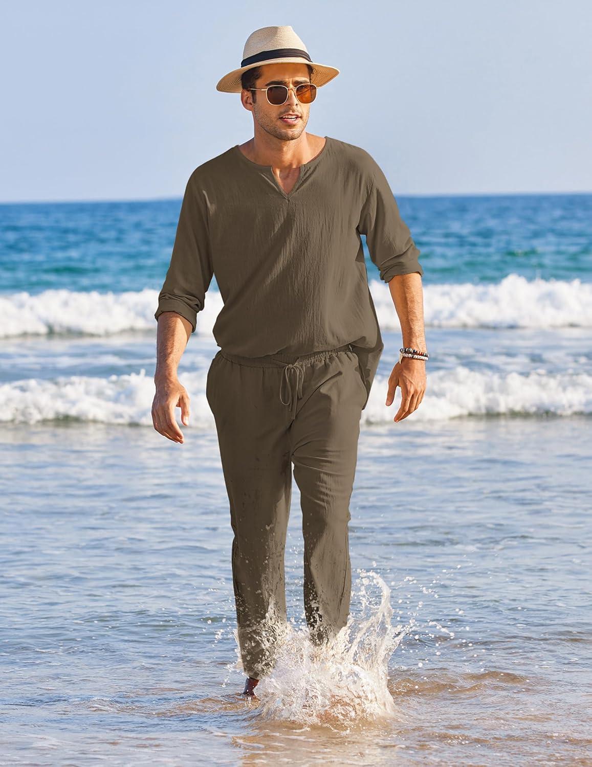 COOFANDY Men’s 2 Pieces Cotton Linen Set Henley Shirt Long Sleeve and Casual Beach Pants Summer Yoga Outfits(Brown)