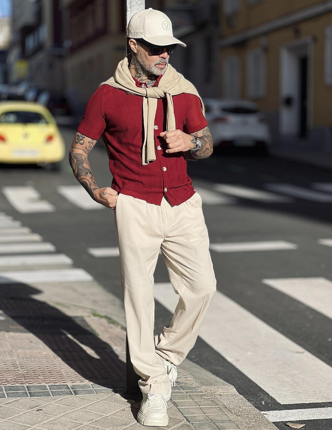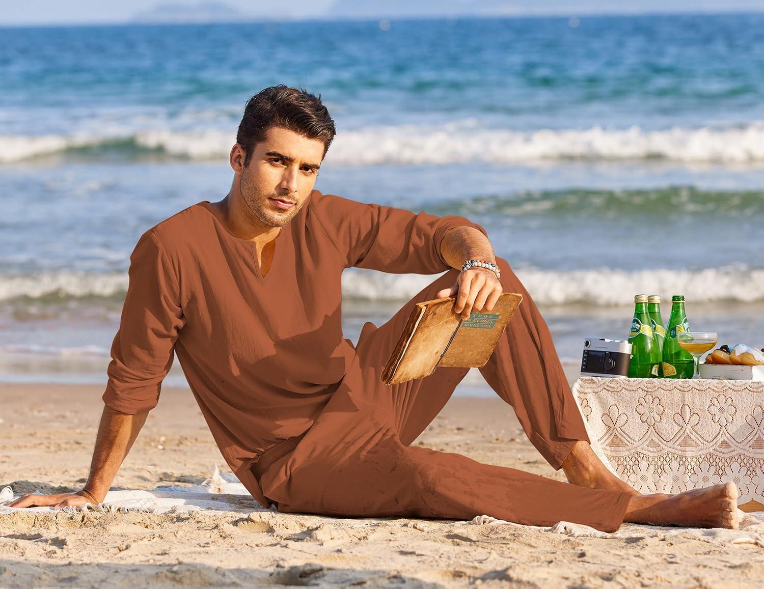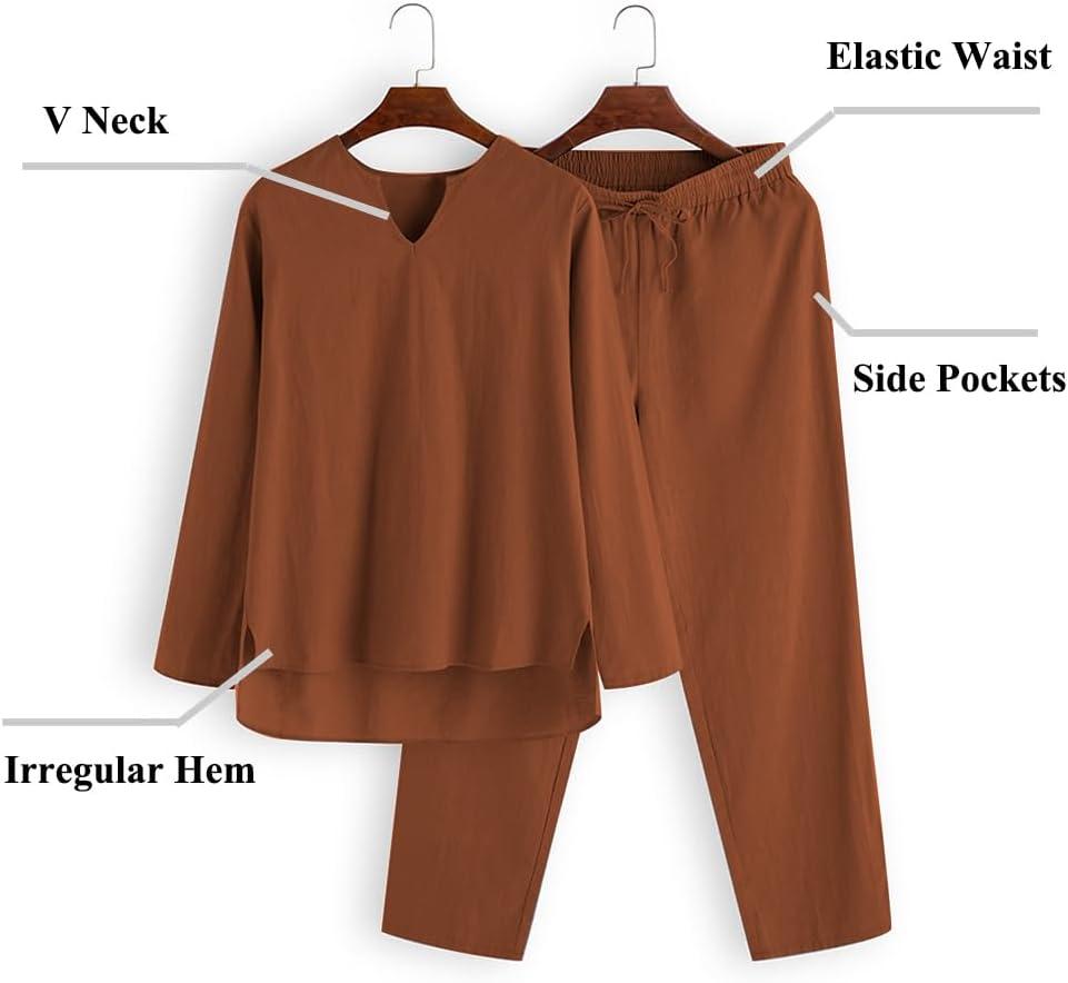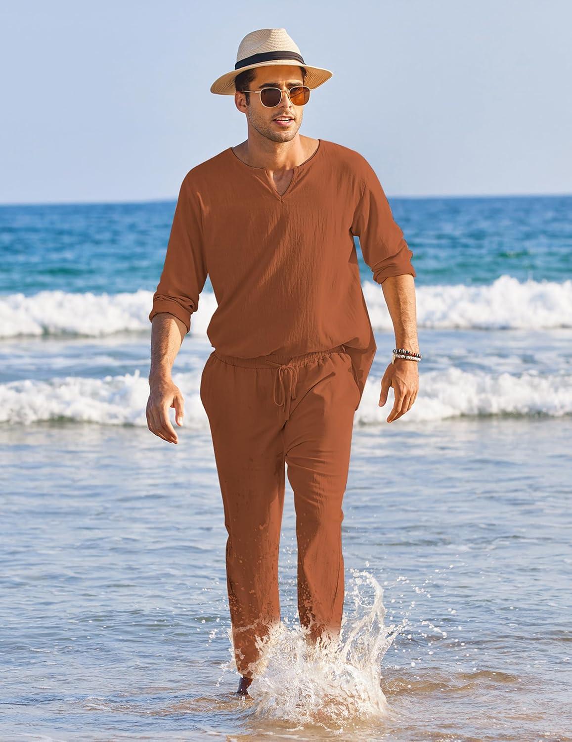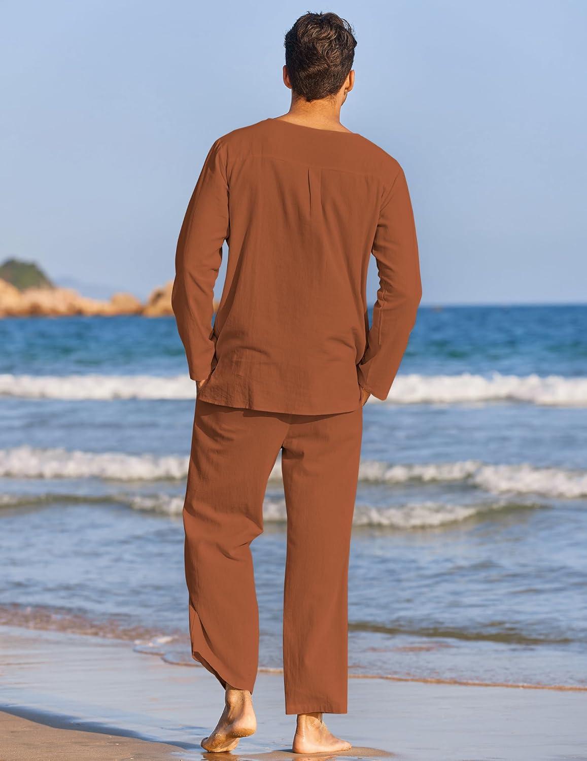 COOFANDY Men’s 2 Pieces Cotton Linen Set Henley Shirt Long Sleeve and Casual Beach Pants Summer Yoga Outfits(Caramel)