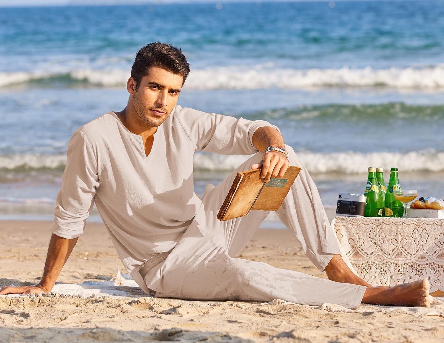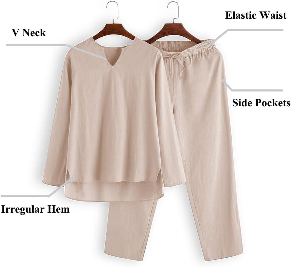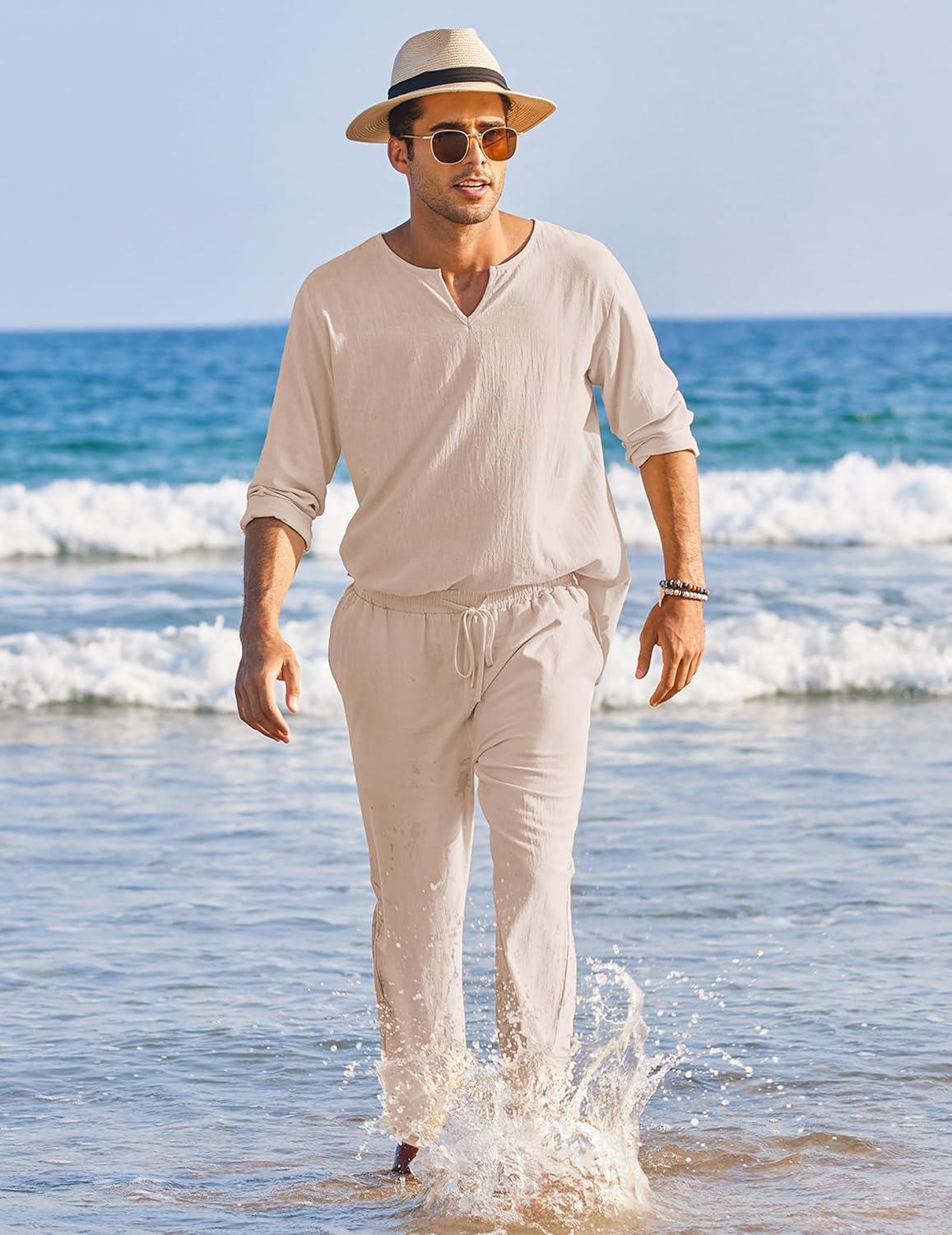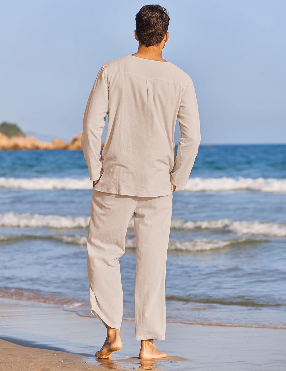 COOFANDY Men’s 2 Pieces Cotton Linen Set Henley Shirt Long Sleeve and Casual Beach Pants Summer Yoga Outfits(Champagne)