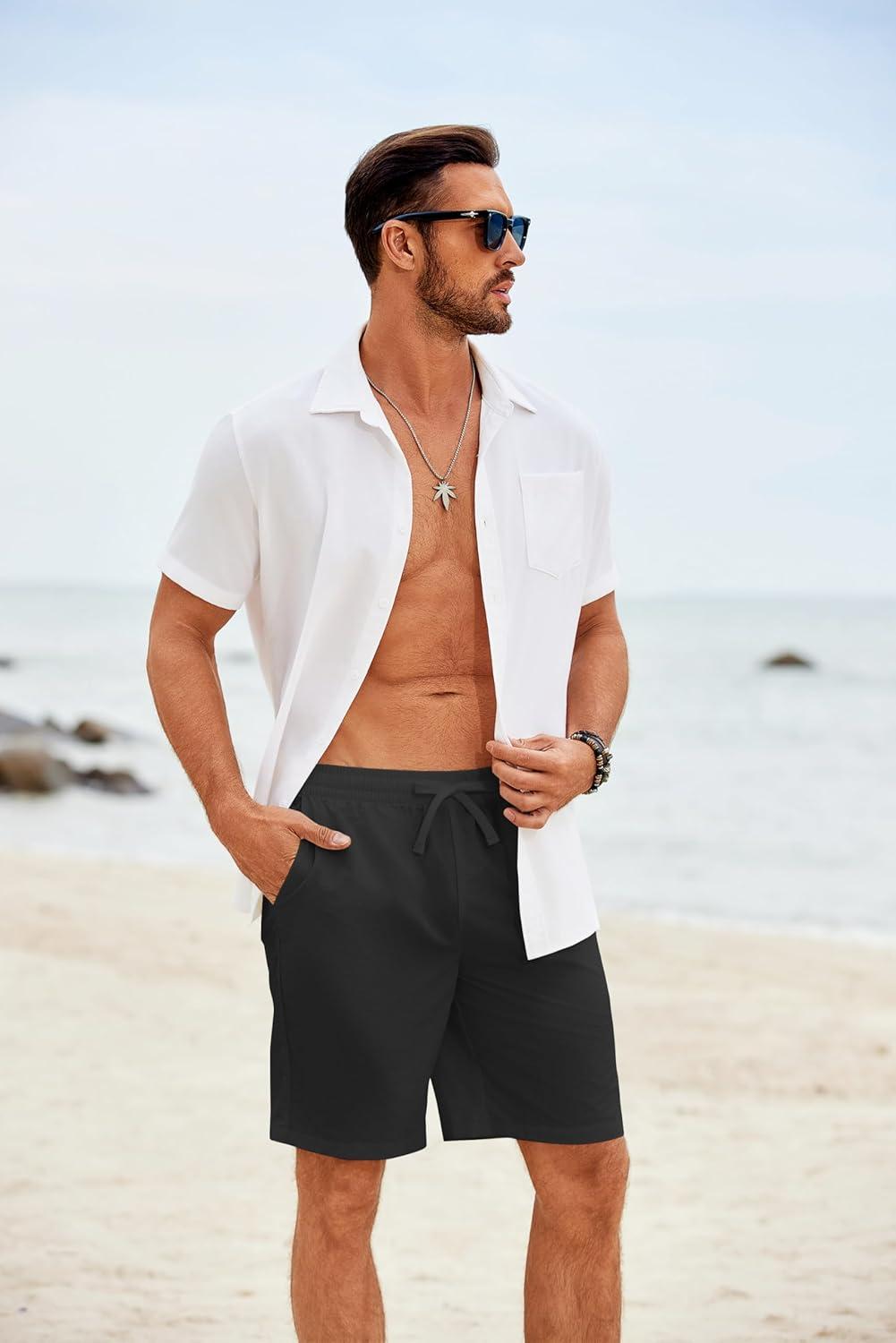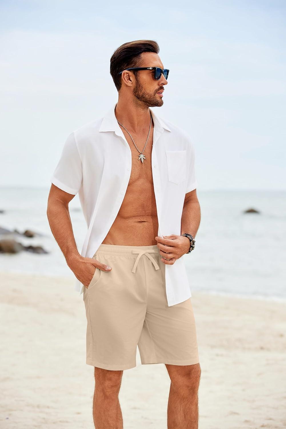 COOFANDY Mens Casual Shorts Elastic Waist Drawstring Shorts Summer Beach Linen Shorts(White)