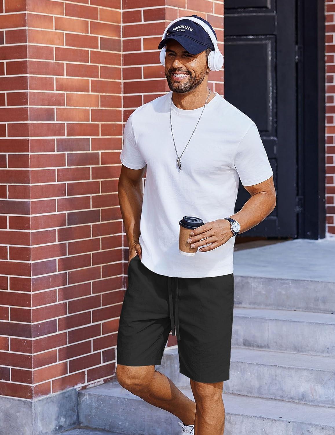 COOFANDY Mens Casual Shorts Elastic Waist Drawstring Shorts Summer Beach Linen Shorts(Black)