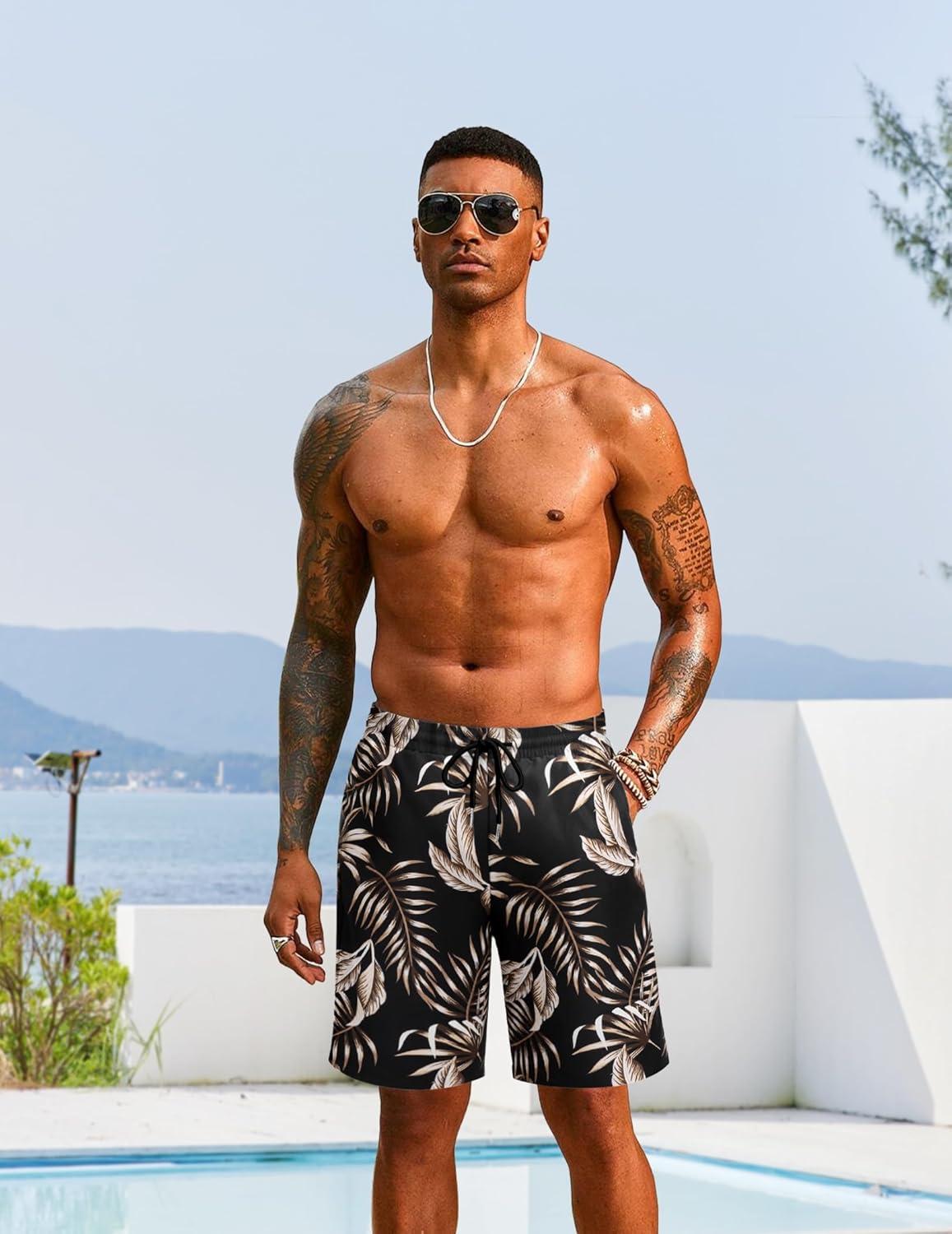 COOFANDY Men Swim Trunk with Compression Liner 2 in 1 Swimwear Bathing Suit Quick Dry Board Short(P Black Plam Leaf)