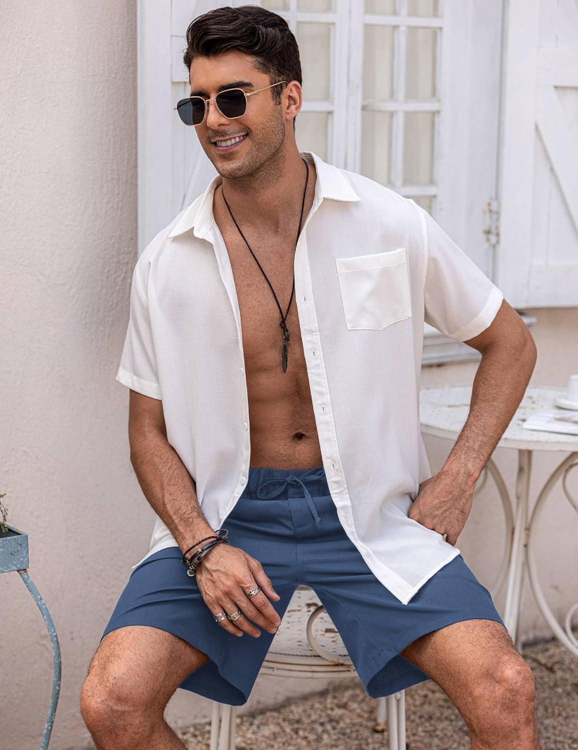 COOFANDY Men’s Linen Short Elastic Waist Drawstring Casual Summer Beach Shorts(A-light Blue/Navy Blue)