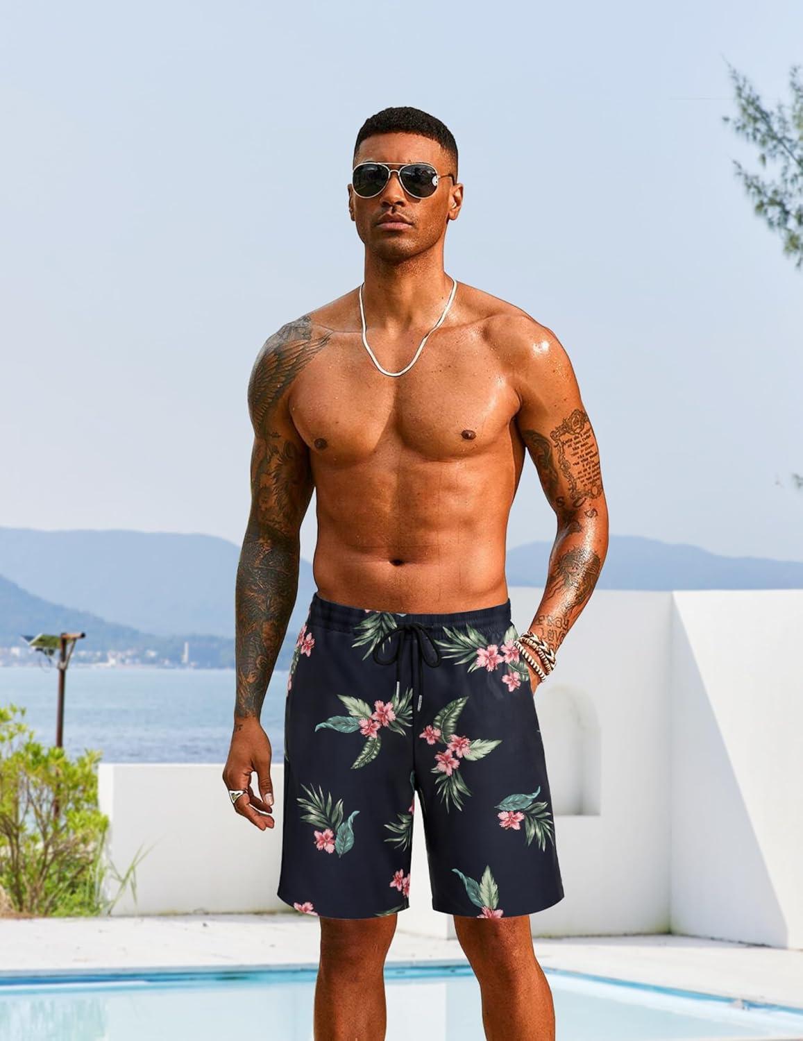 COOFANDY Men’s Casual Shorts Lightweight Elastic Waist Drawstring Summer Beach Shorts with Pockets(Navy Blue&green Flower)