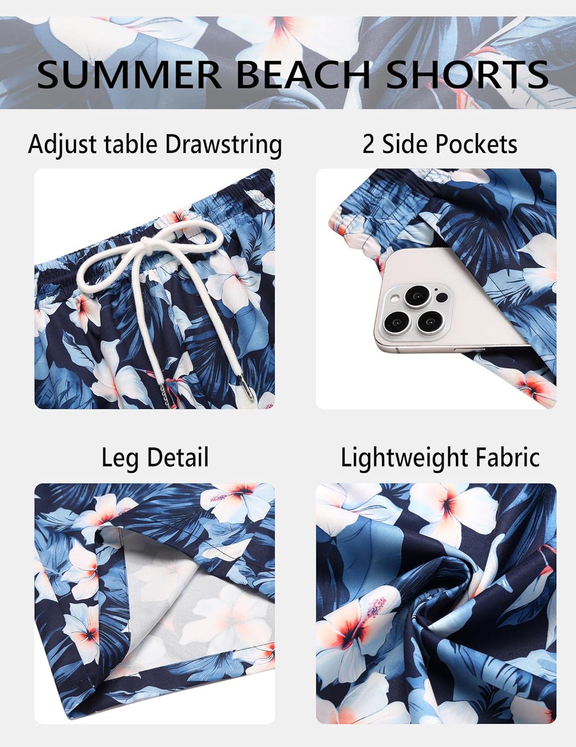 COOFANDY Men’s Hawaiian Beach Shorts Elastic Waist Drawstring Lightweight Summer Casual Shorts with Pocket,Navy Blue&Lily,L