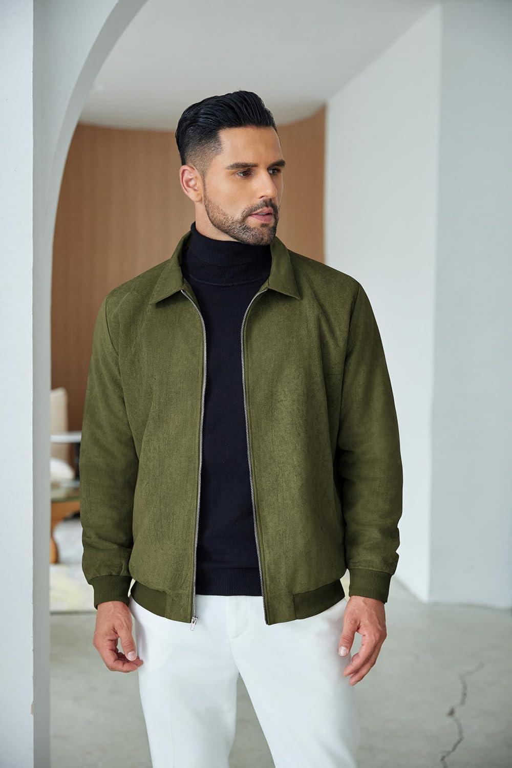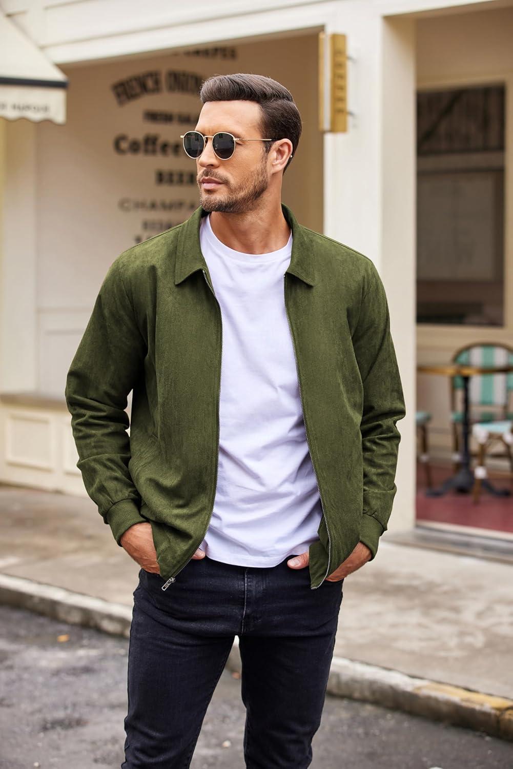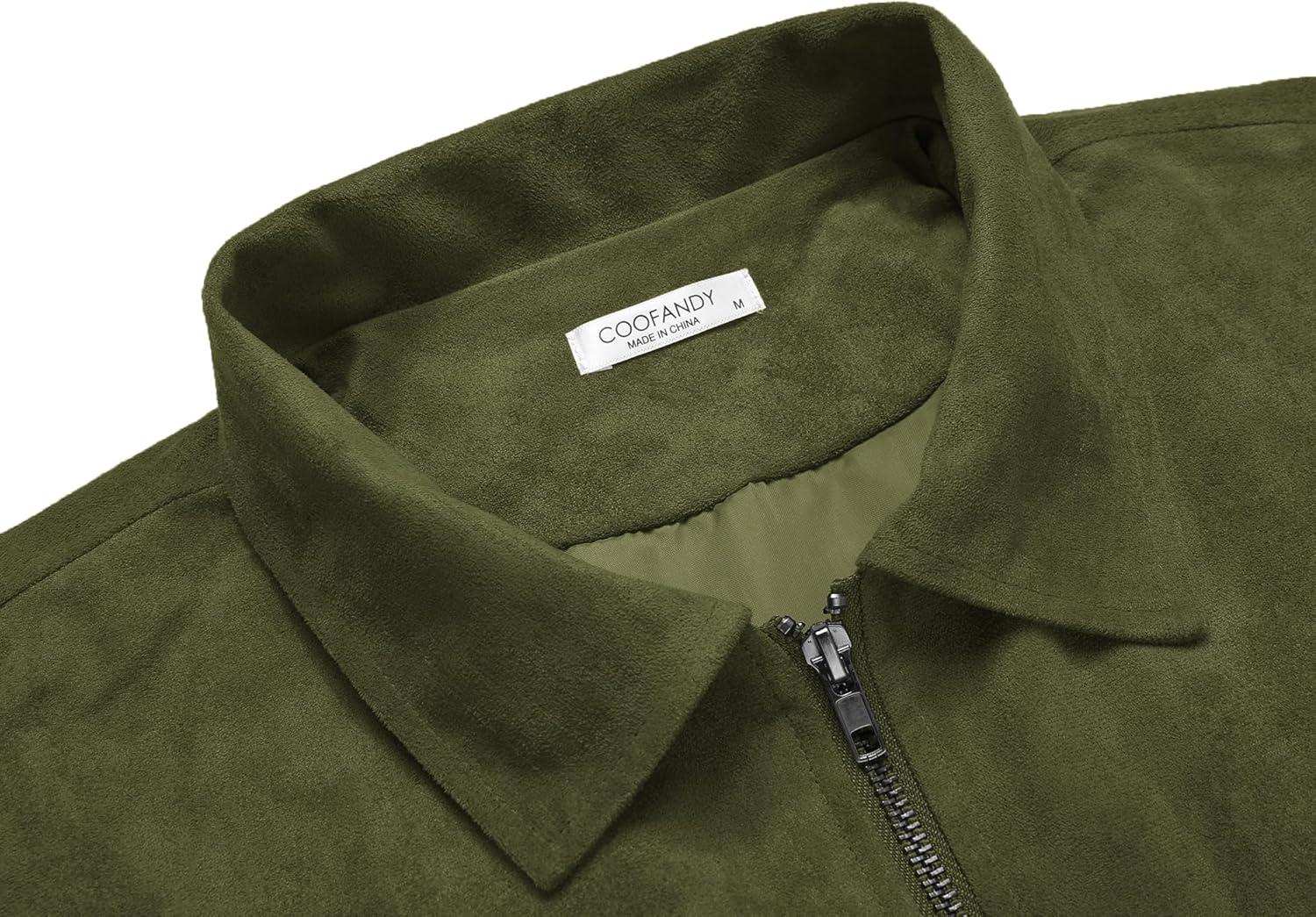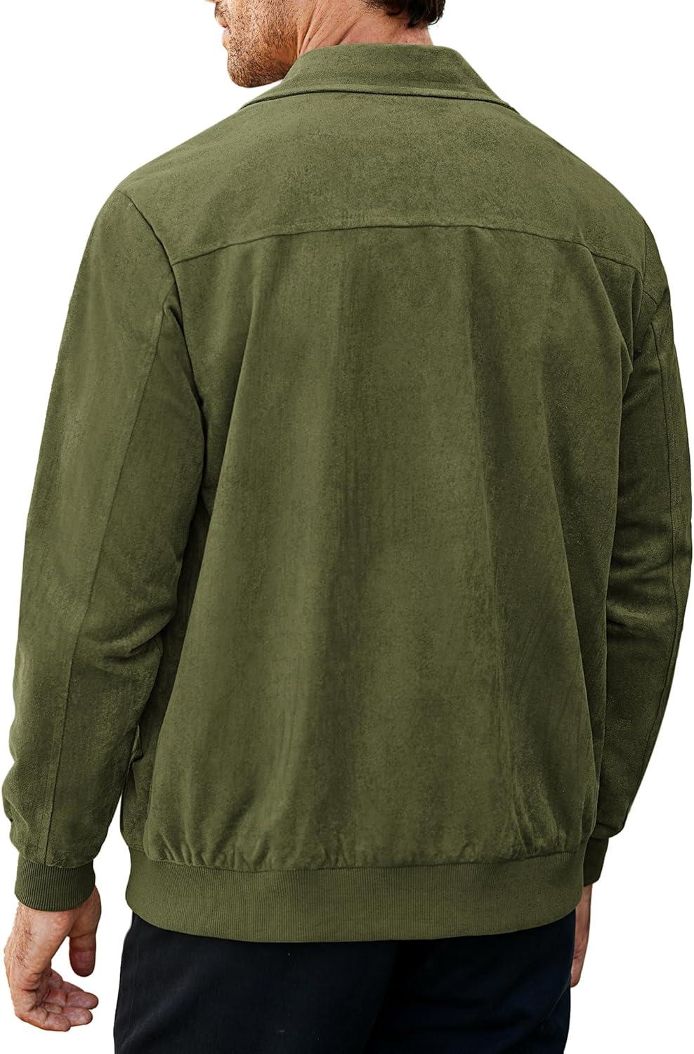 COOFANDY Men’s Casual Suede Bomber Jacket Lightweight Full Zip Up Jackets Vintage Faux Leather Jacket(Army Green)