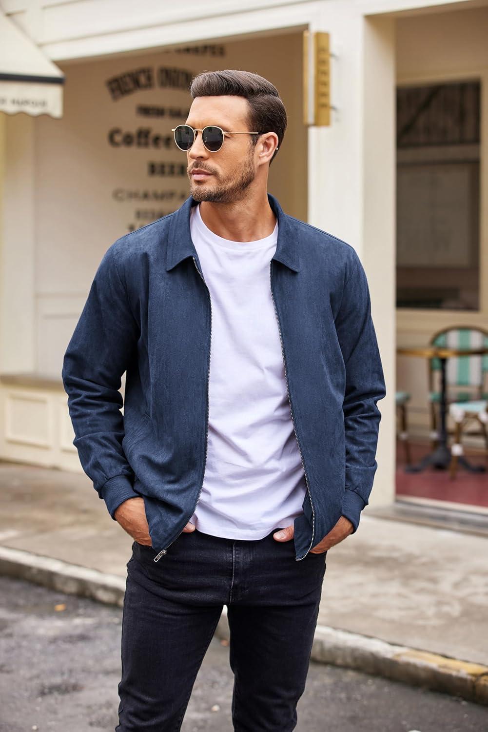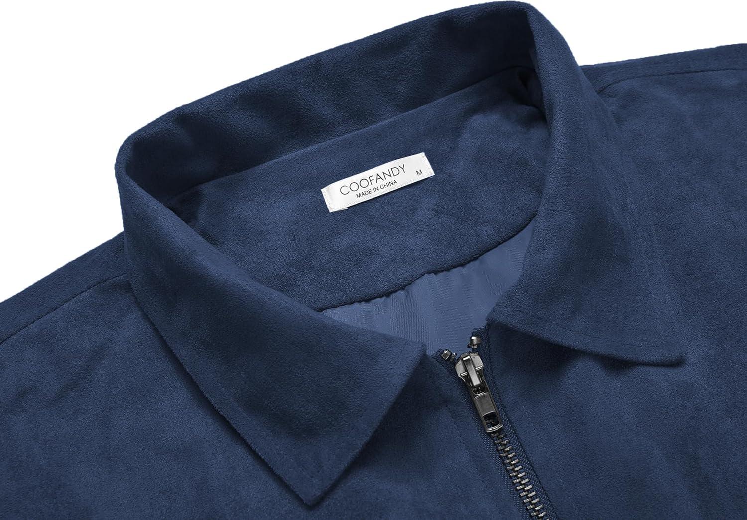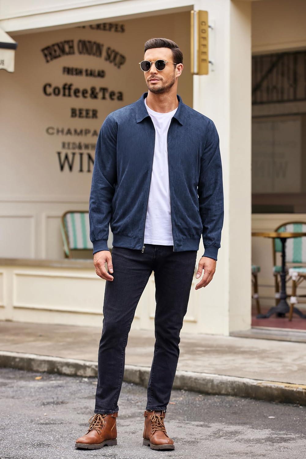 COOFANDY Men’s Casual Suede Bomber Jacket Lightweight Full Zip Up Jackets Vintage Faux Leather Jacket(Dark Blue)