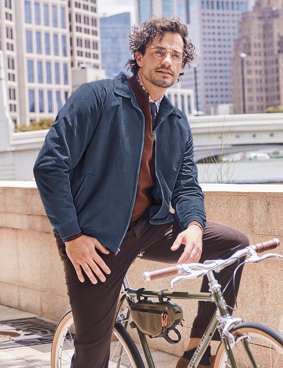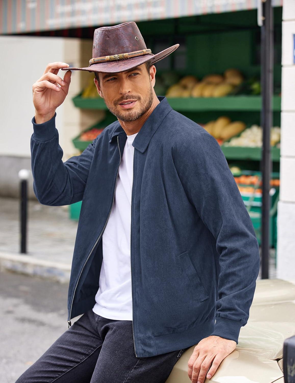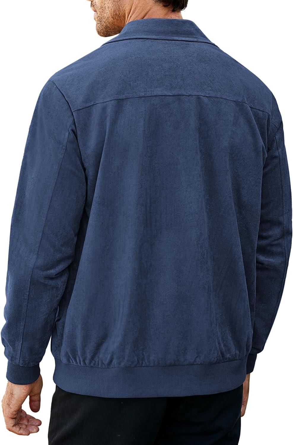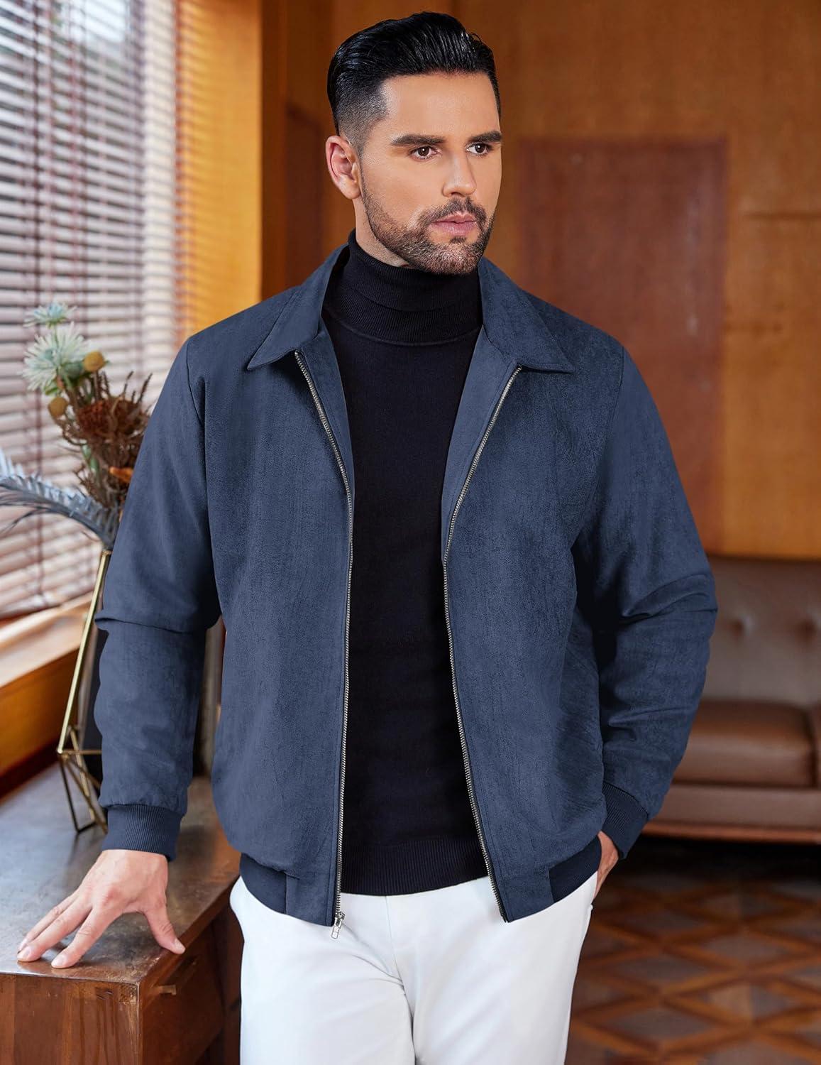 COOFANDY Men’s Casual Suede Bomber Jacket Lightweight Full Zip Up Jackets Vintage Faux Leather Jacket(Dark Blue)