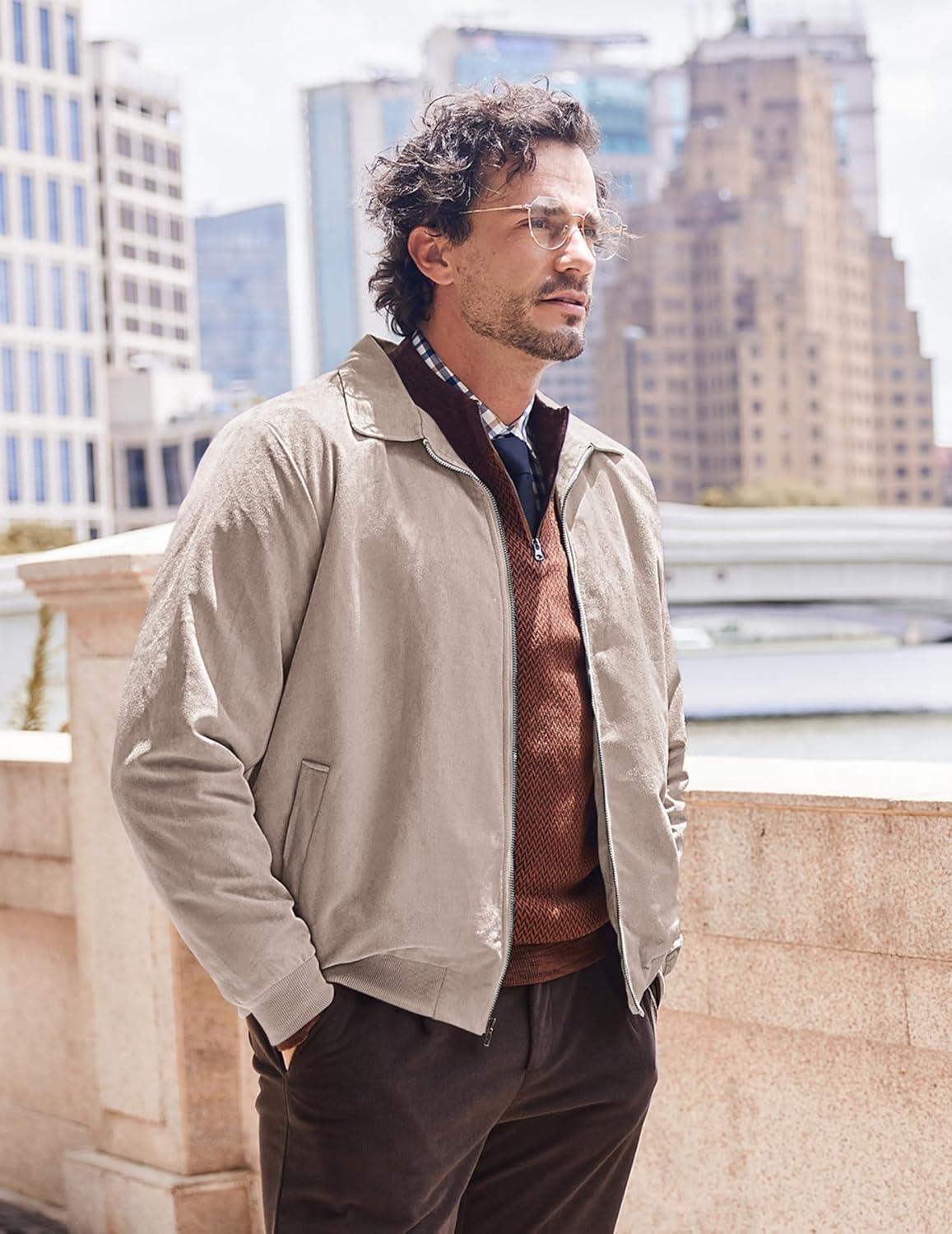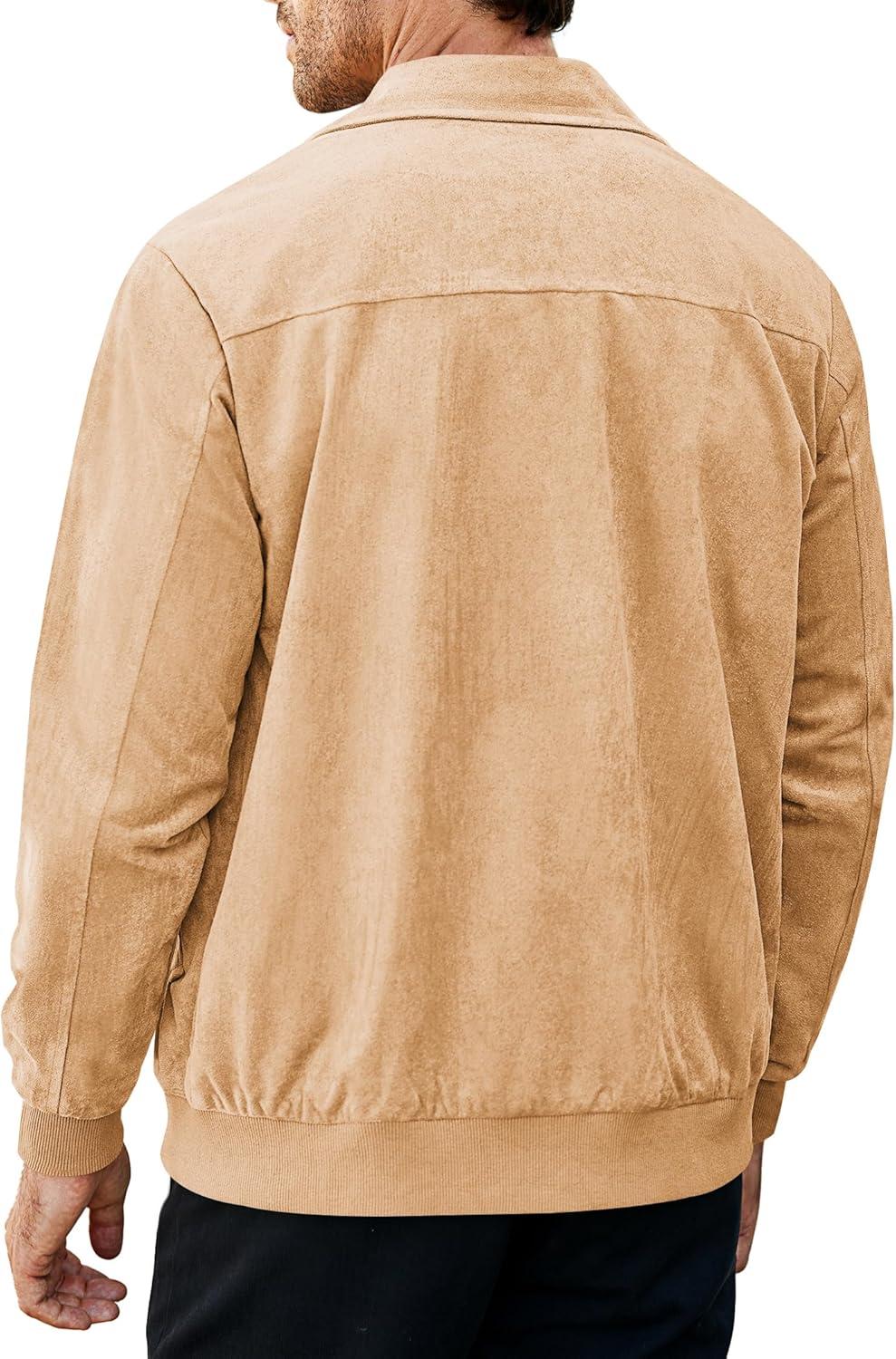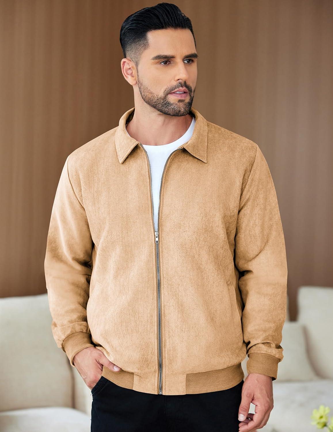 COOFANDY Men’s Casual Suede Bomber Jacket Lightweight Full Zip Up Jackets Vintage Faux Leather Jacket(Light Tan)
