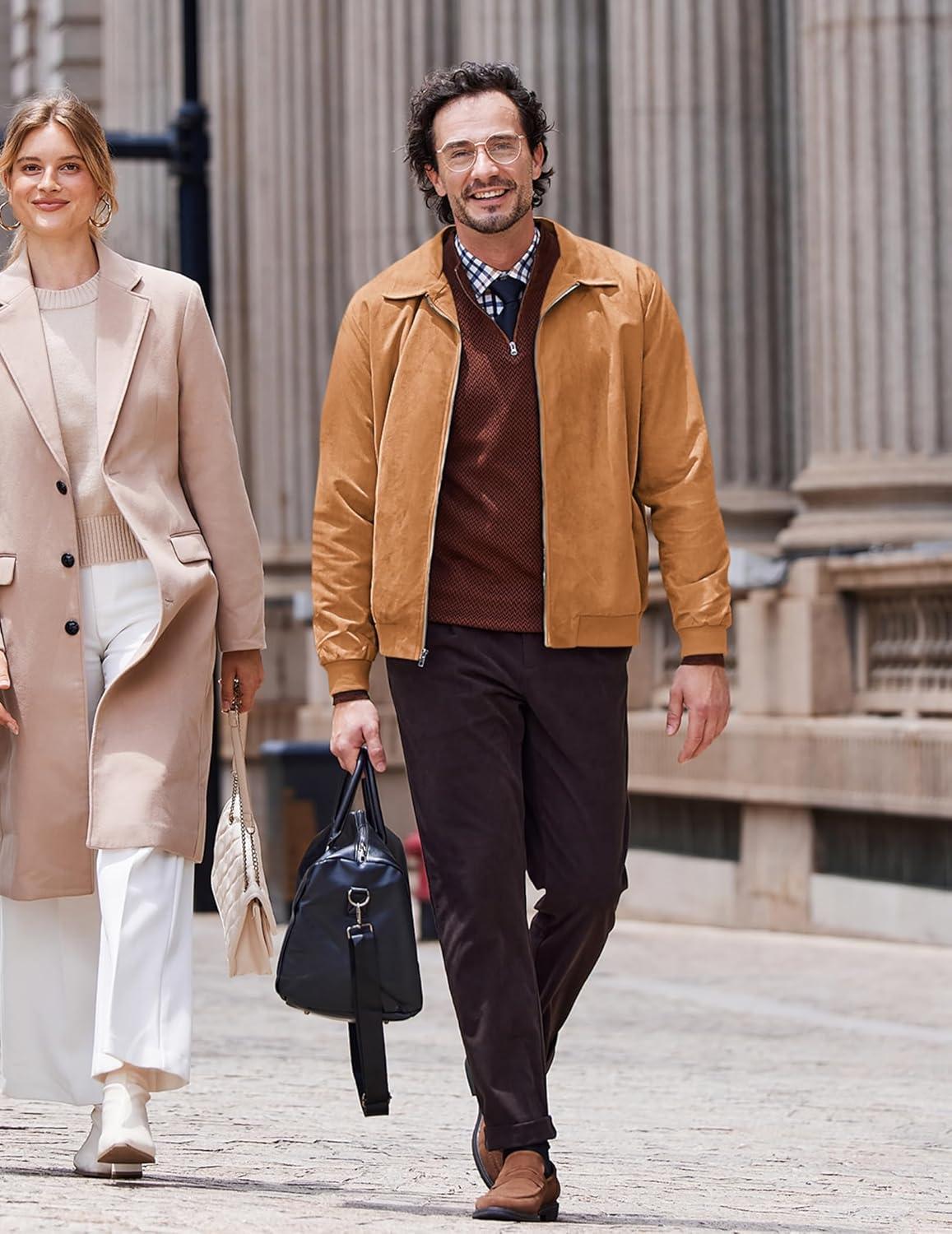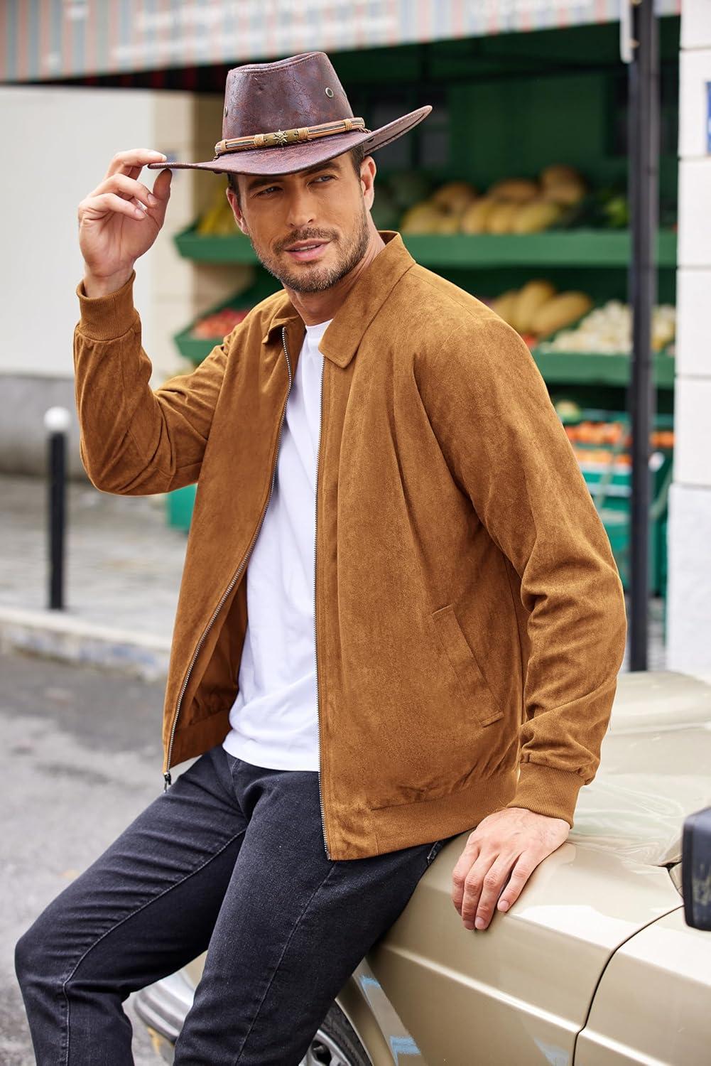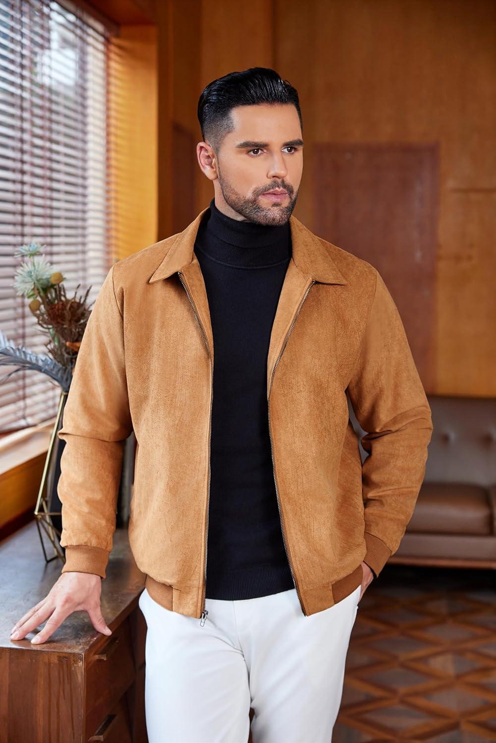 COOFANDY Men’s Casual Suede Bomber Jacket Lightweight Full Zip Up Jackets Vintage Faux Leather Jacket(Brown)