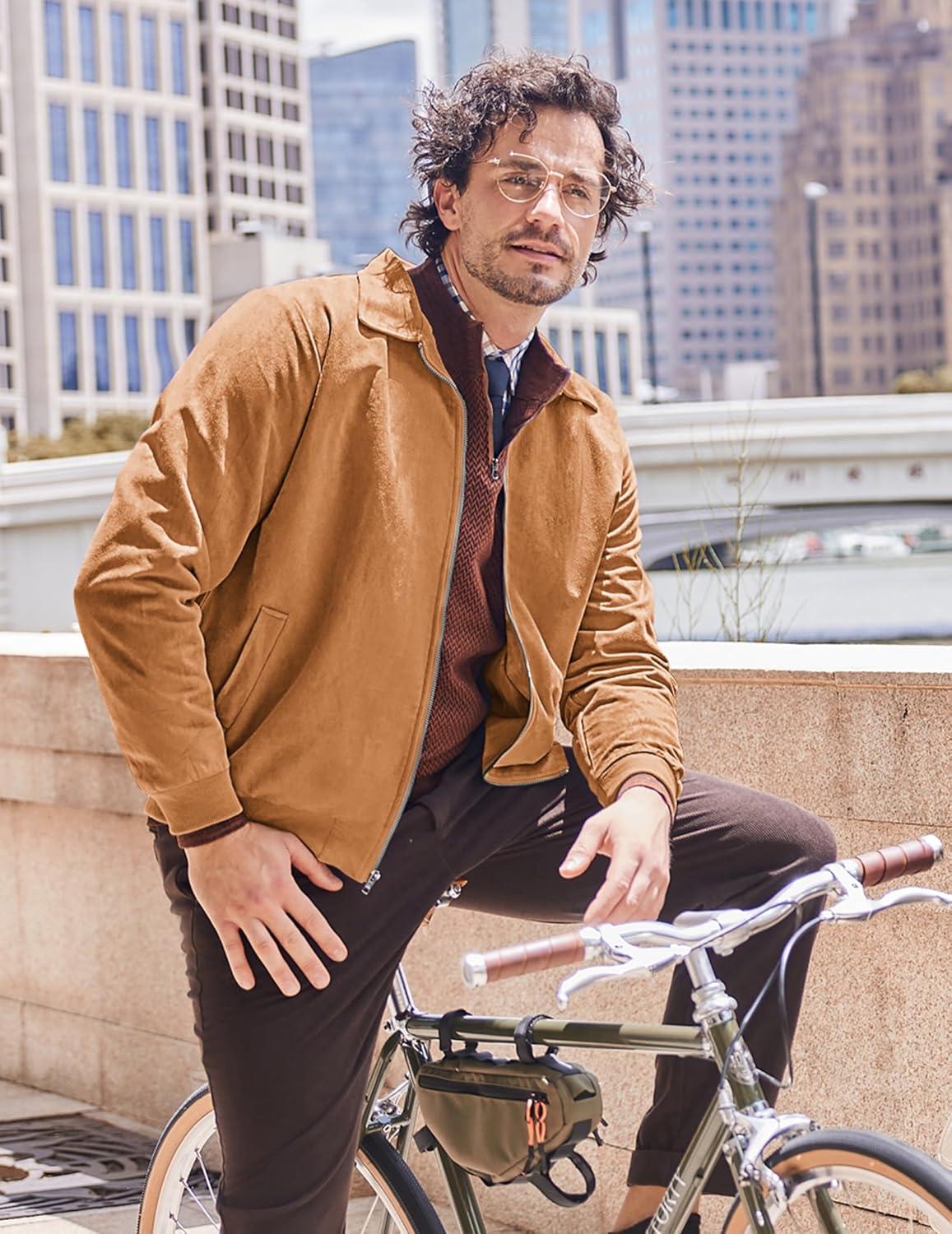 COOFANDY Men’s Casual Suede Bomber Jacket Lightweight Full Zip Up Jackets Vintage Faux Leather Jacket(Light Brown)