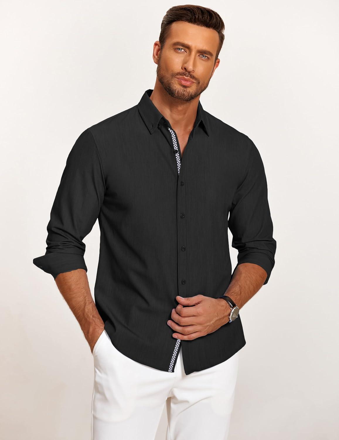COOFANDY Mens Casual Button Down Shirt Untucked Long Sleeve Stretch Denim Dress Shirt(Black-plaid)