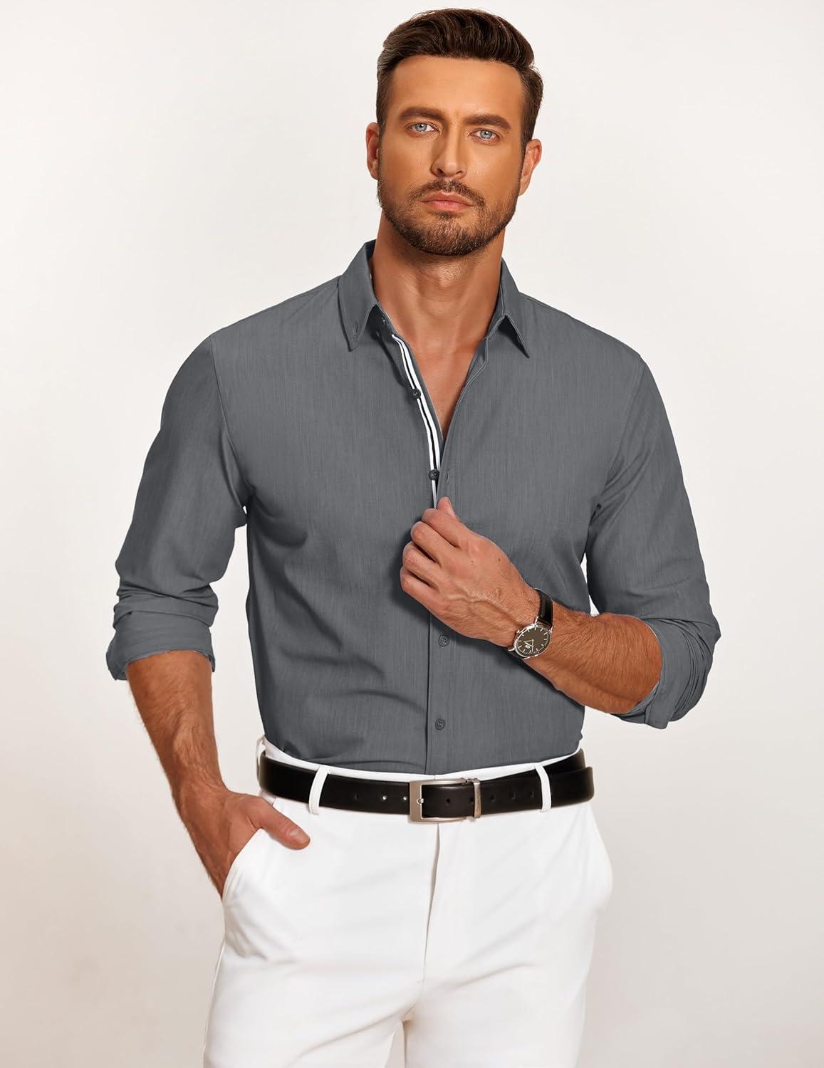 COOFANDY Mens Casual Button Down Shirt Untucked Long Sleeve Stretch Denim Dress Shirt(Light Grey)