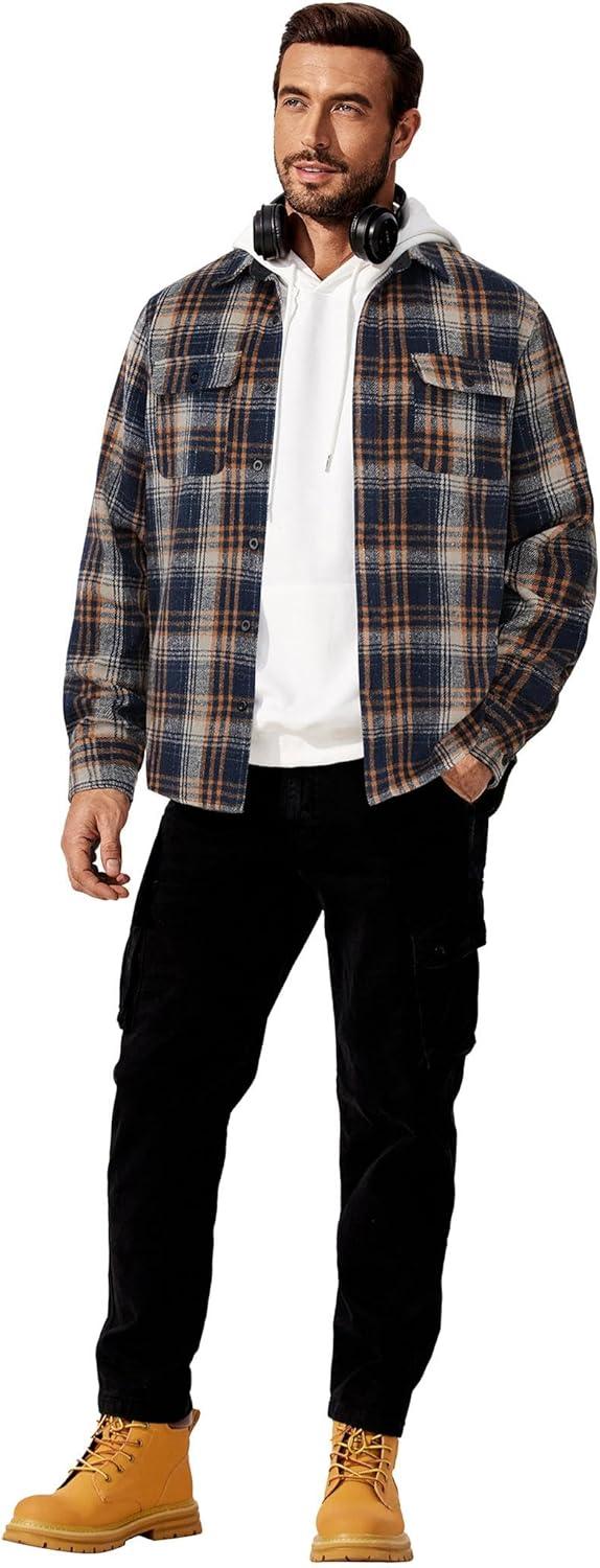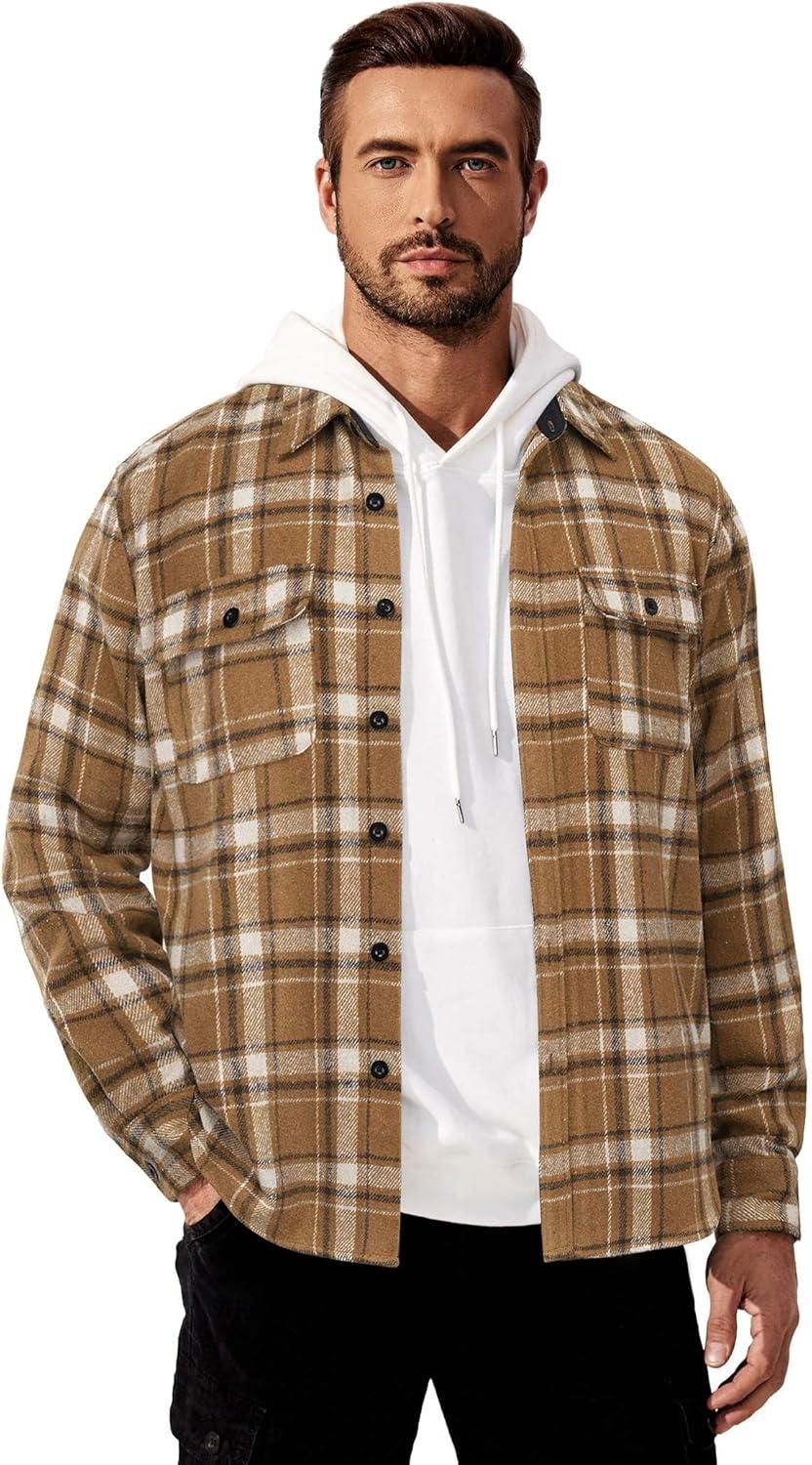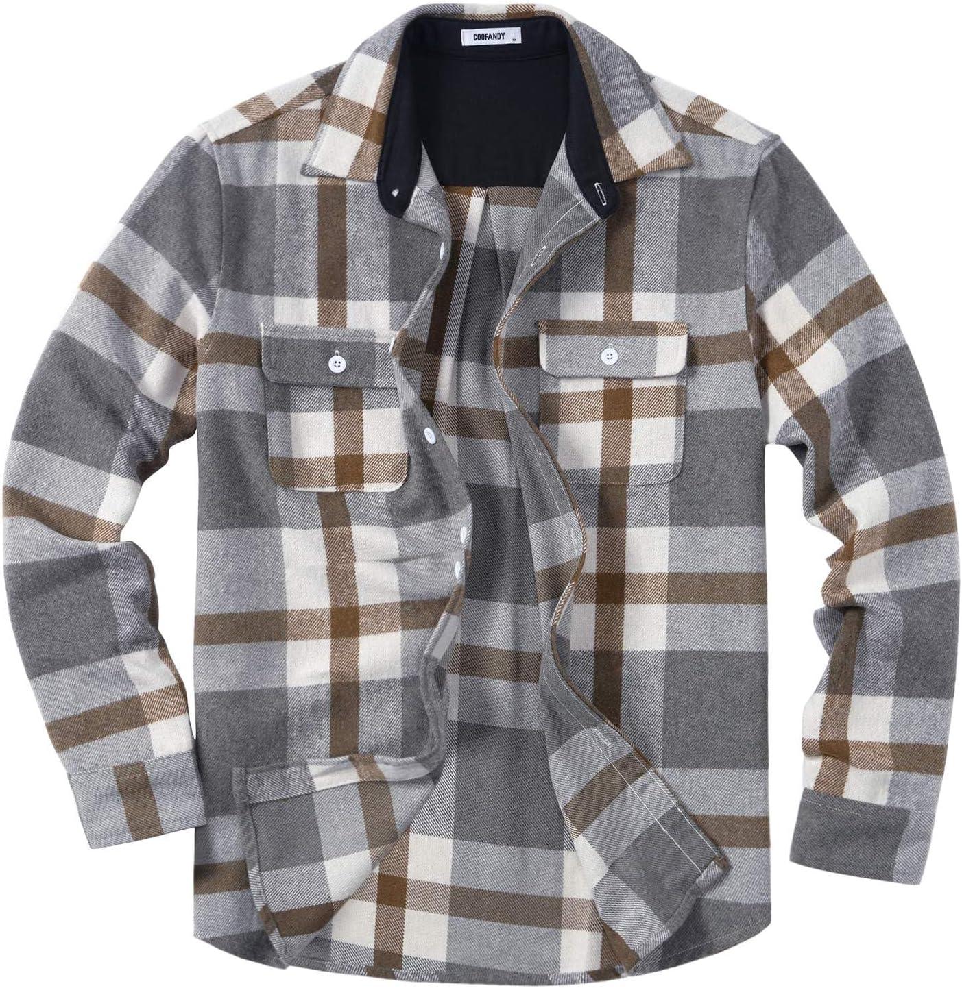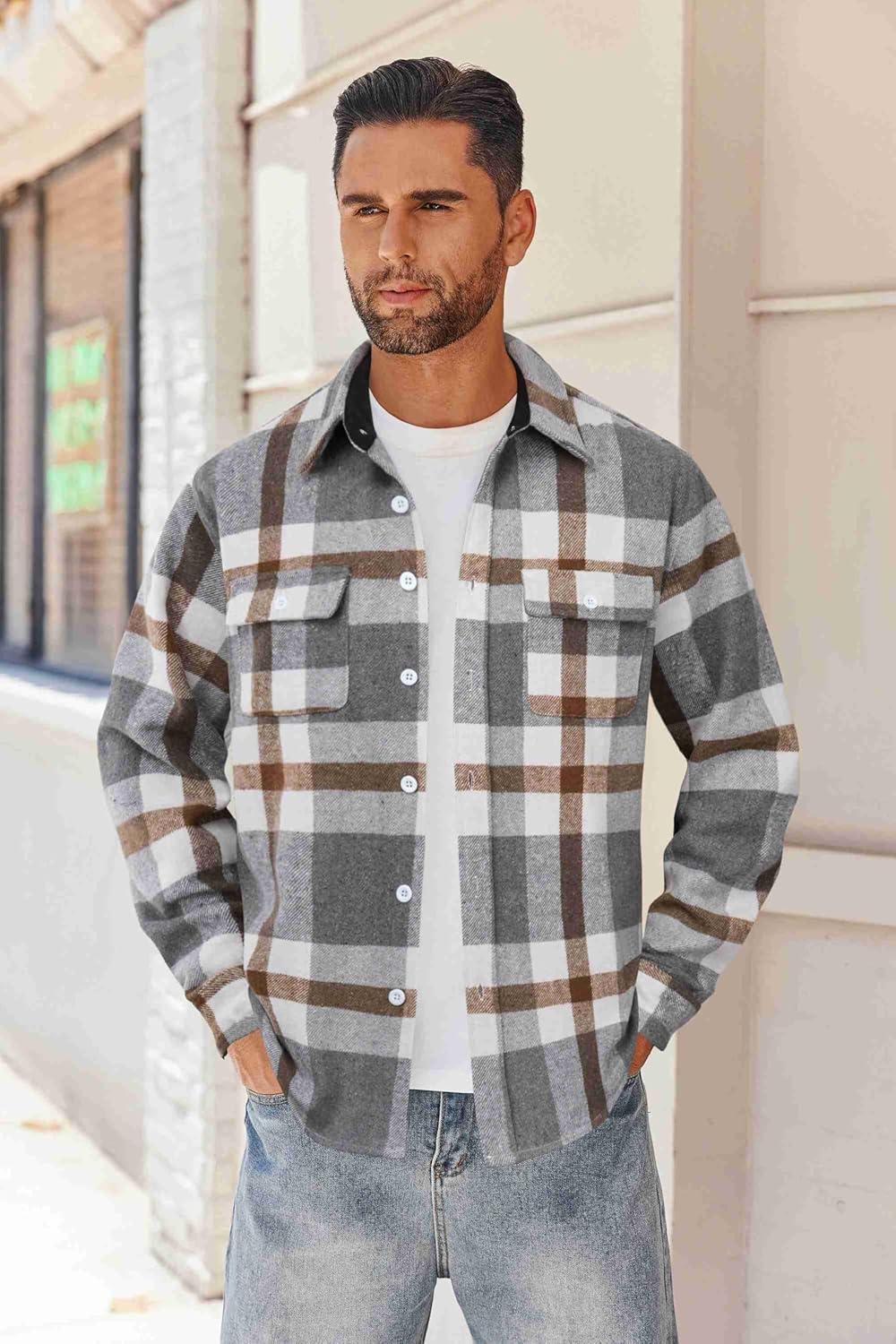COOFANDY Men’s Flannel Shirts Long Sleeve Cotton Plaid Shirt Jacket Casual Button Down Shirt with Pockets(Grey Brown)