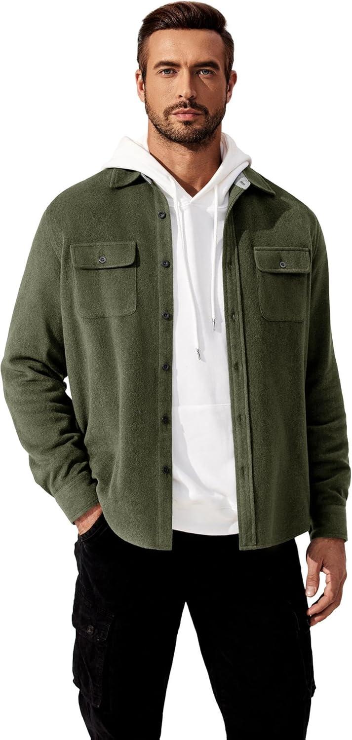 COOFANDY Men’s Flannel Shirts Long Sleeve Cotton Plaid Shirt Jacket Casual Button Down Shirt with Pockets(Solid Army Green)