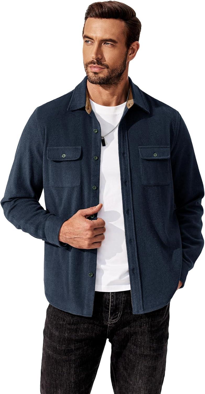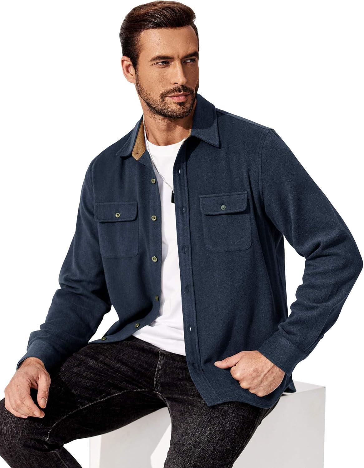 COOFANDY Men’s Flannel Shirts Casual Button Down Plaid Shirt Jacket Long Sleeve Fleece Shacket with Pockets(Solid – Navy Blue)