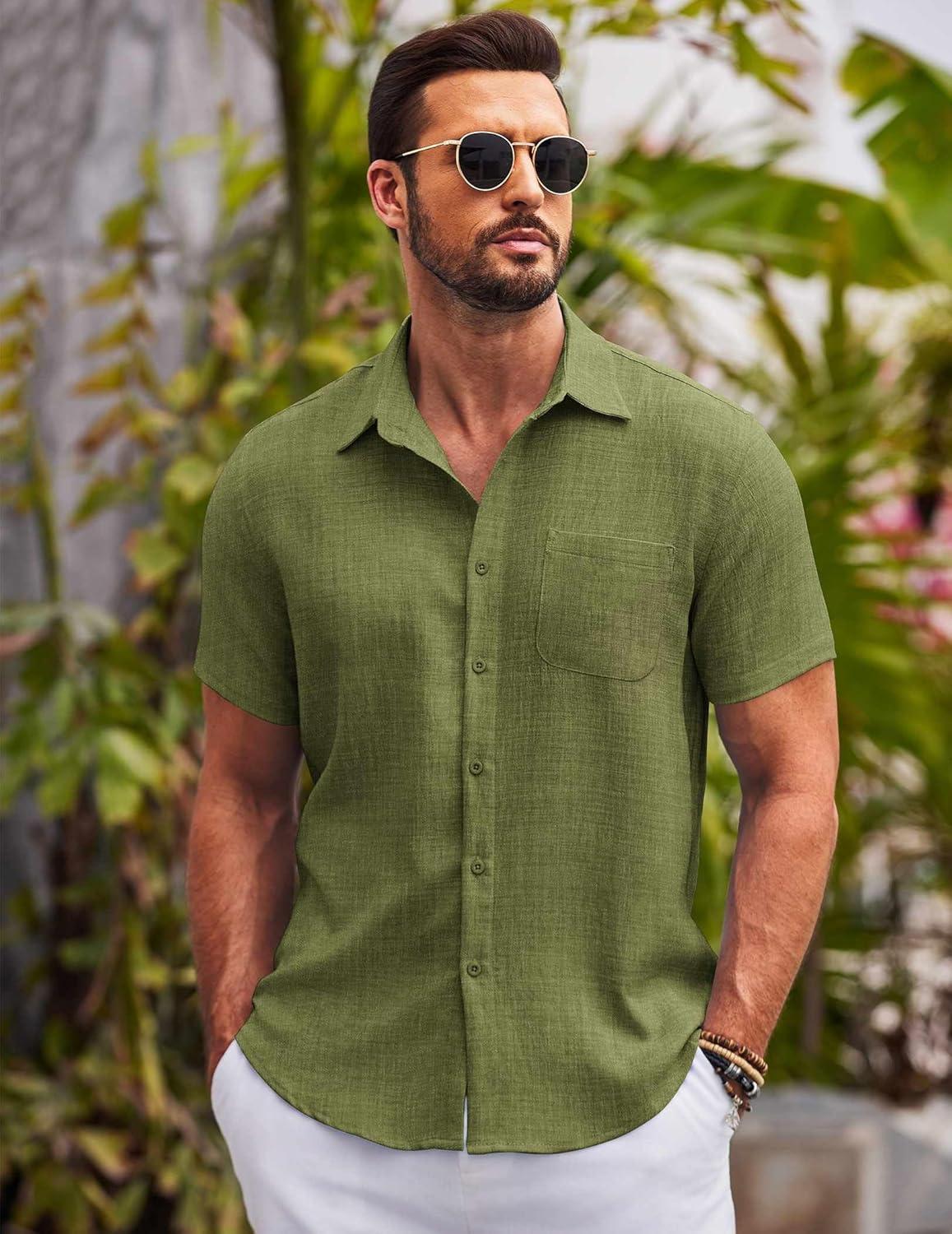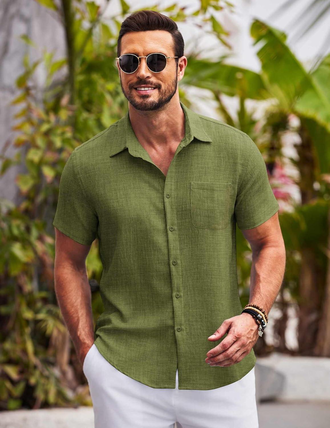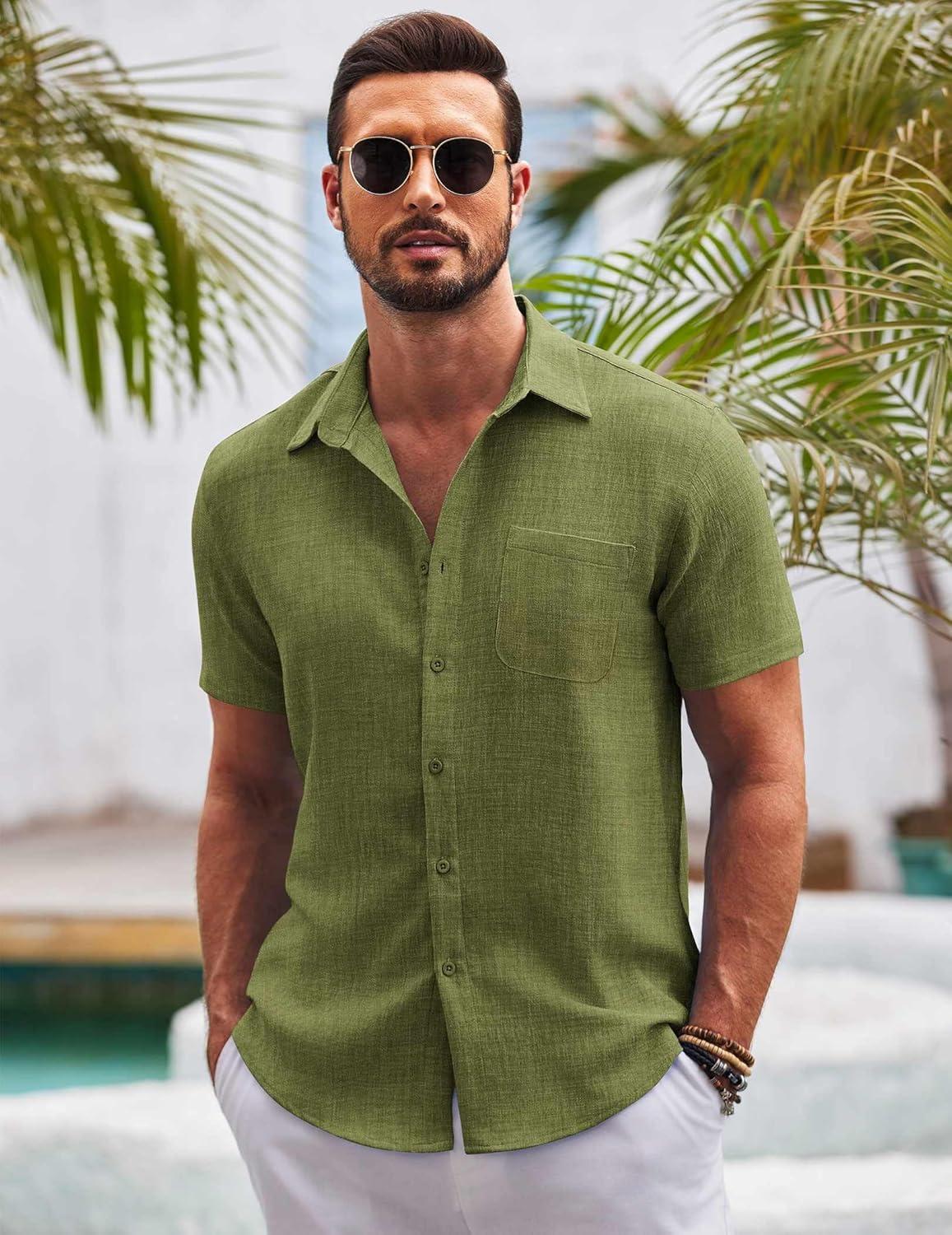 COOFANDY Mens Casual Summer Beach Shirt Button Down Short Sleeve Shirts Vacation Shirt Cotton Linen Shirts(Army Green)