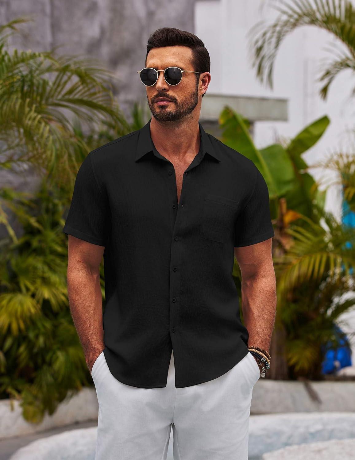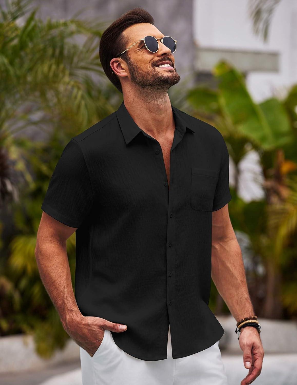 COOFANDY Mens Casual Summer Beach Shirt Button Down Short Sleeve Shirts Vacation Shirt Cotton Linen Shirts(Black)