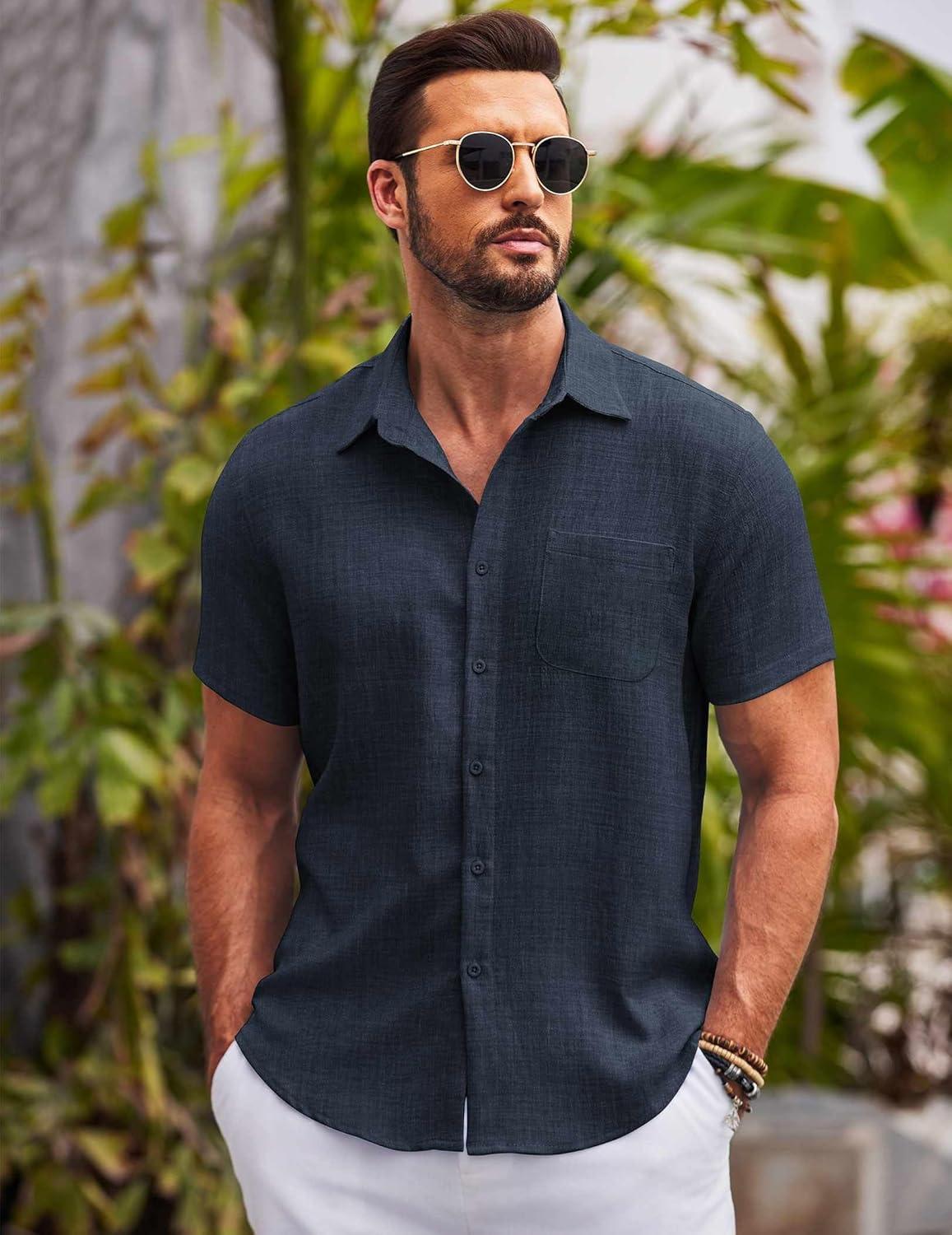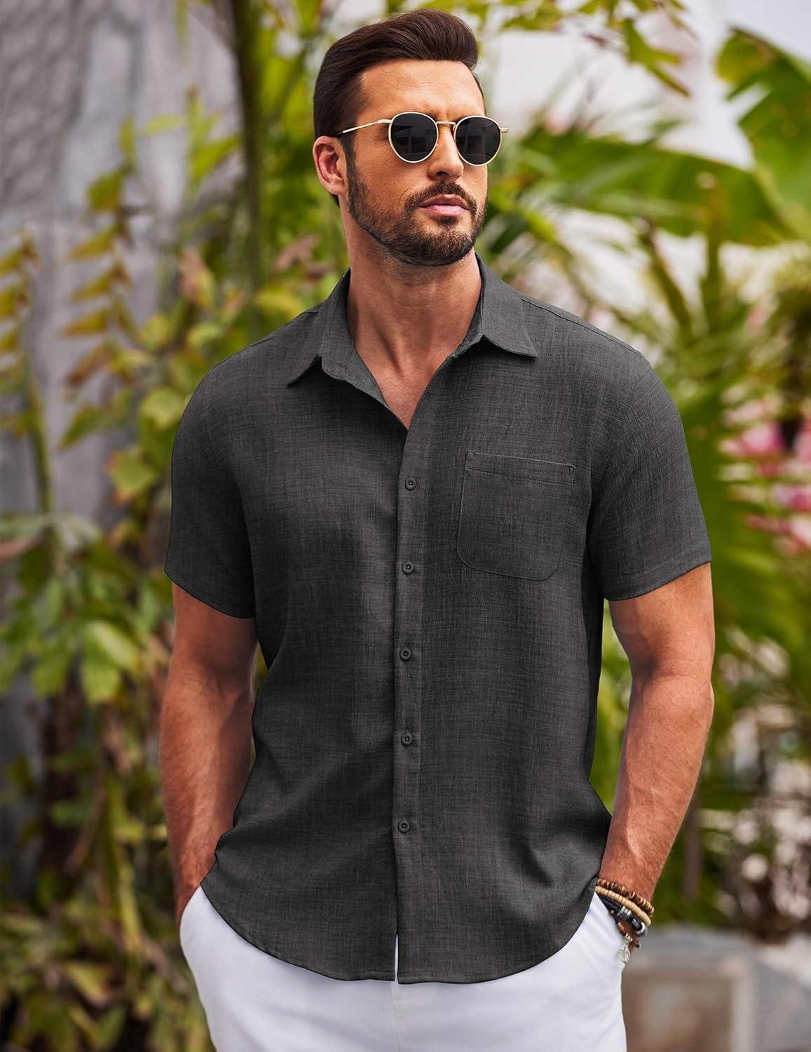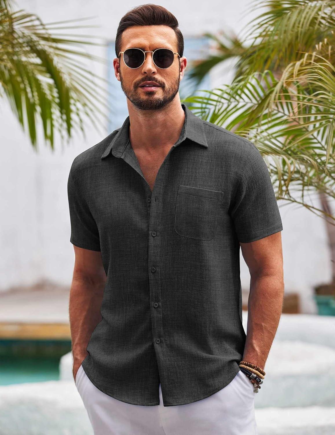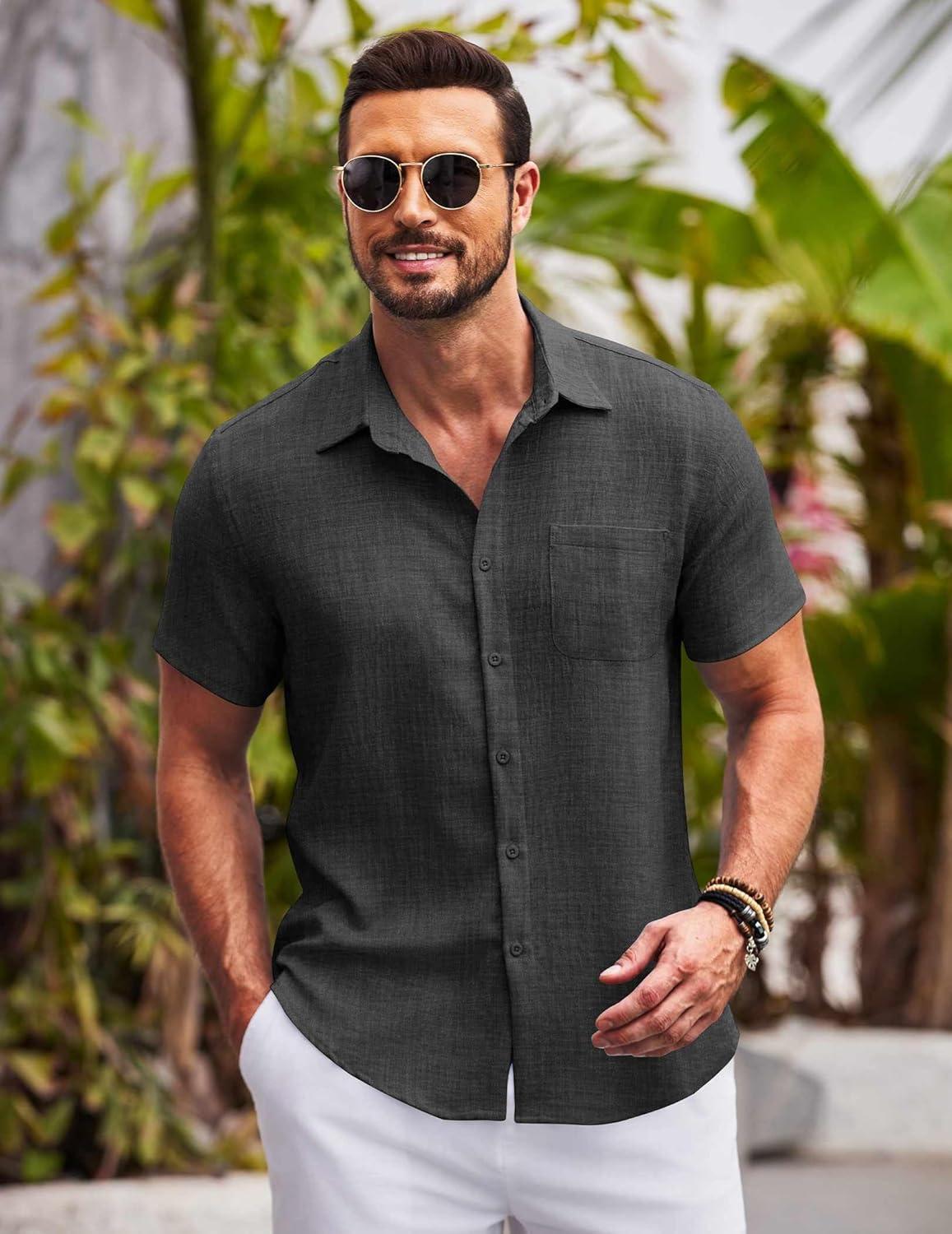 COOFANDY Mens Casual Summer Beach Shirt Button Down Short Sleeve Shirts Vacation Shirt Cotton Linen Shirts(Dark Gray)