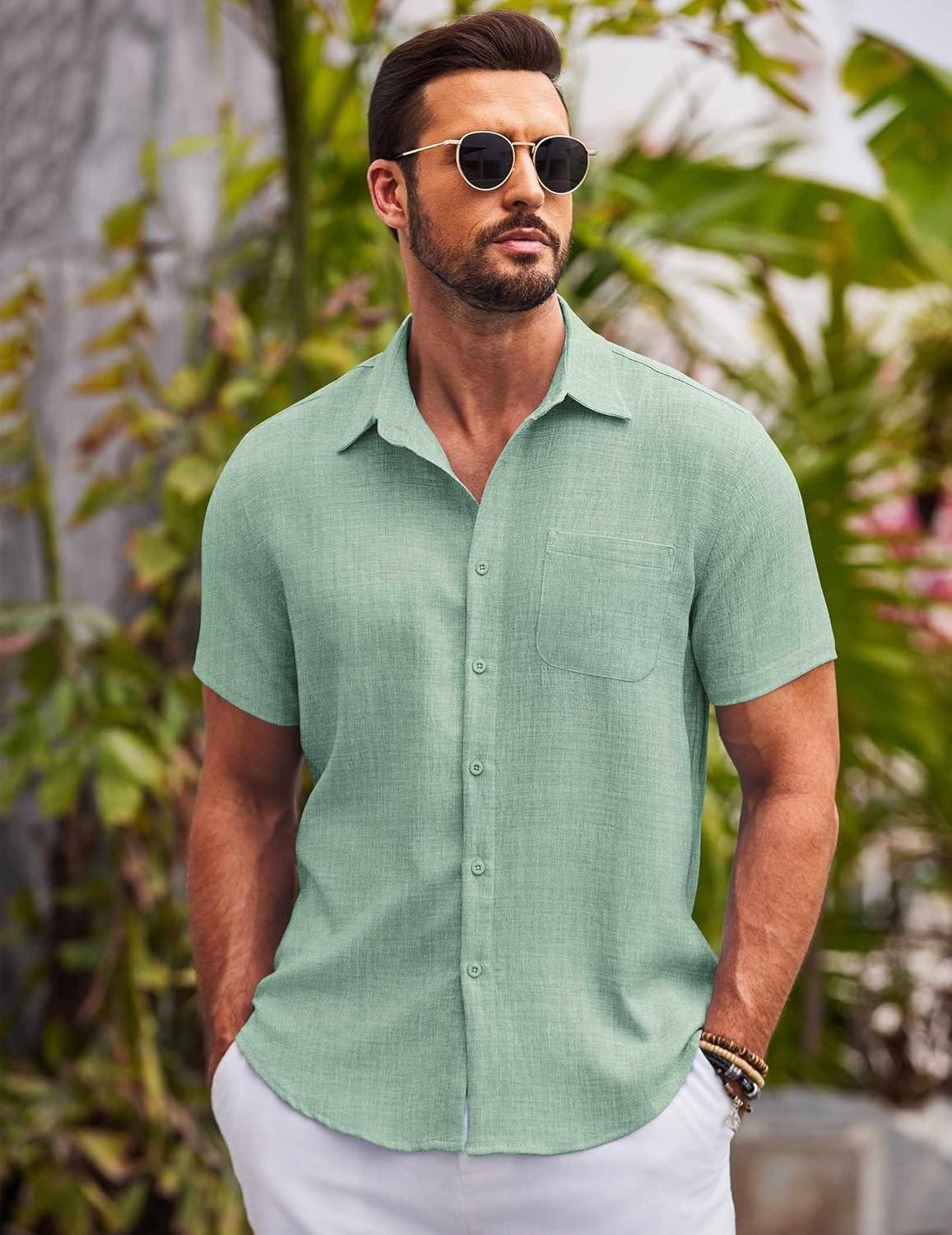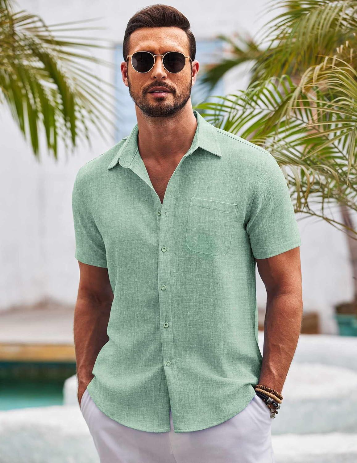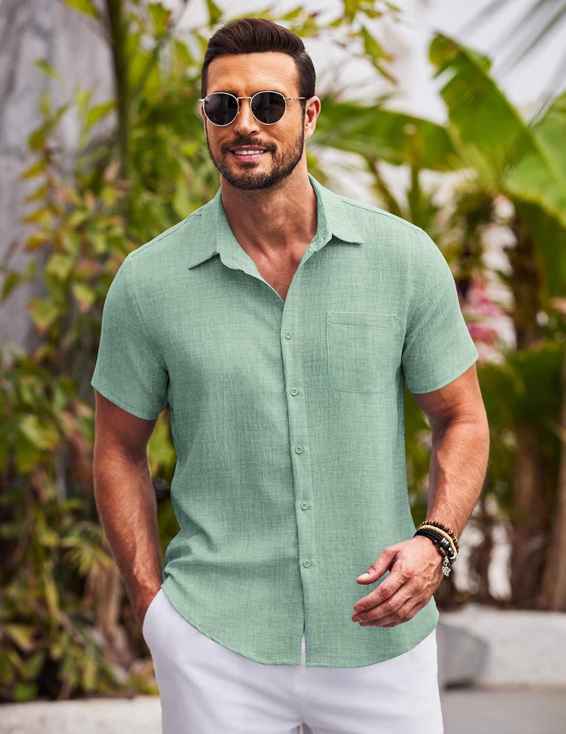 COOFANDY Mens Casual Summer Beach Shirt Button Down Short Sleeve Shirts Vacation Shirt Cotton Linen Shirts(Light Green)