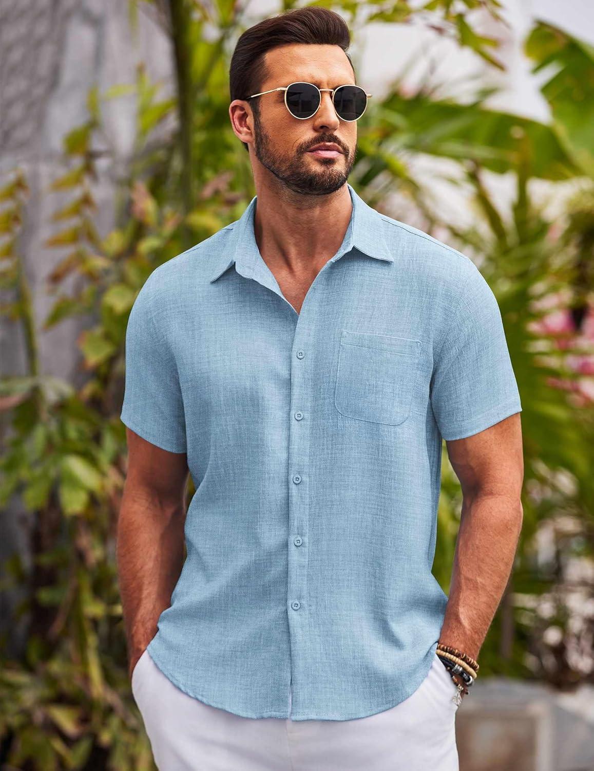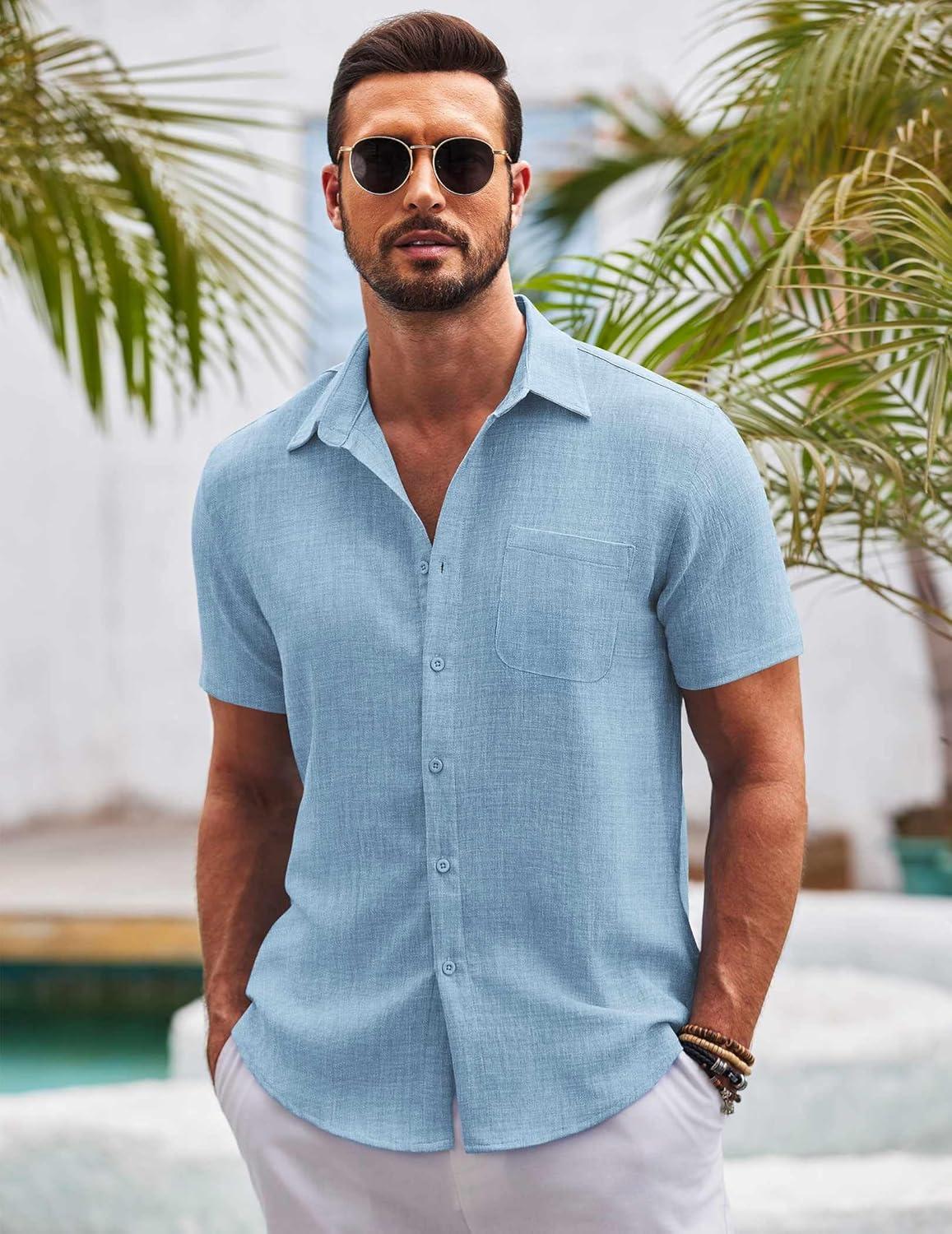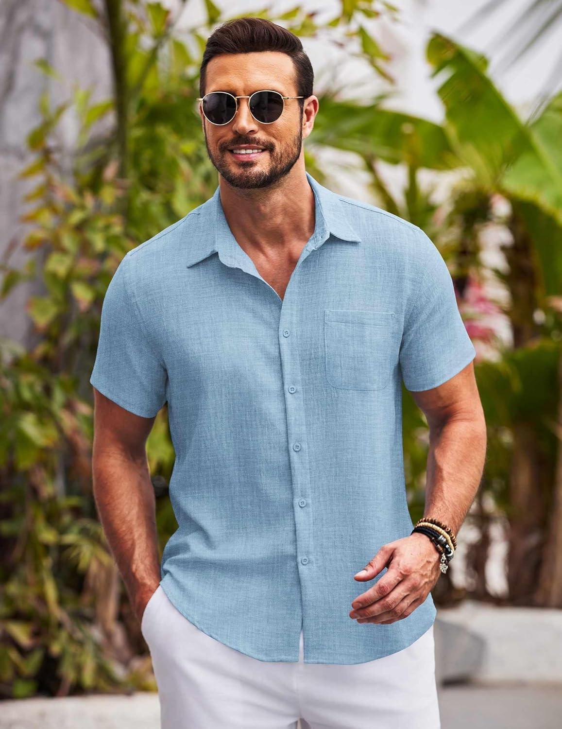 COOFANDY Mens Casual Summer Beach Shirt Button Down Short Sleeve Shirts Vacation Shirt Cotton Linen Shirts(Light Blue)