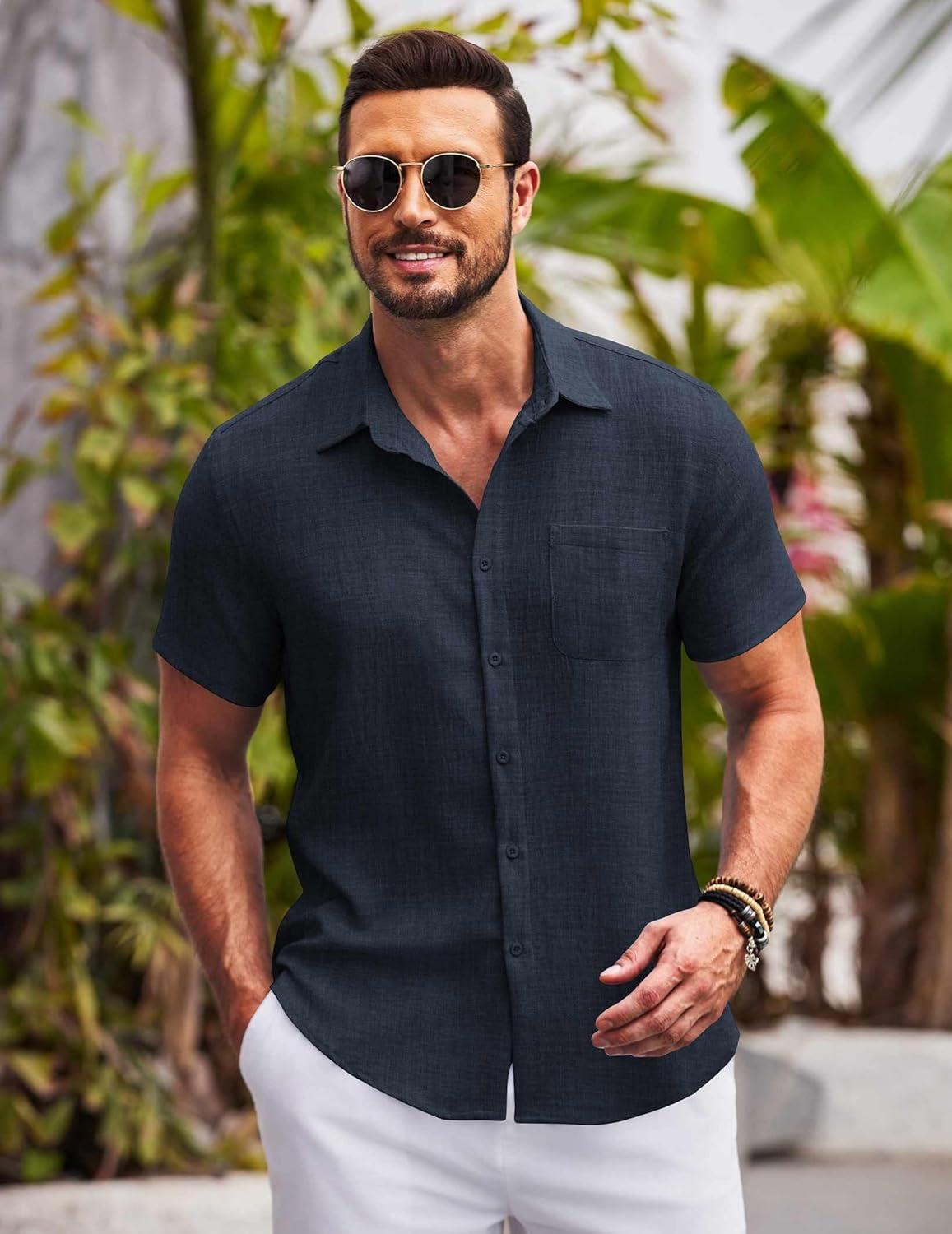 COOFANDY Mens Casual Summer Beach Shirt Button Down Short Sleeve Shirts Vacation Shirt Cotton Linen Shirts(Carbon Black)