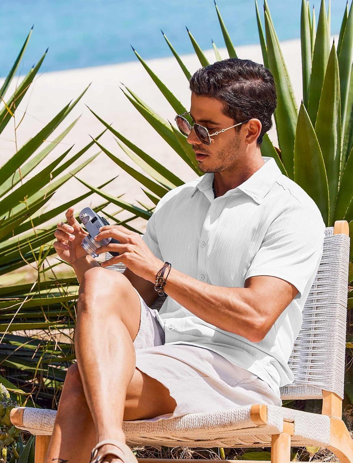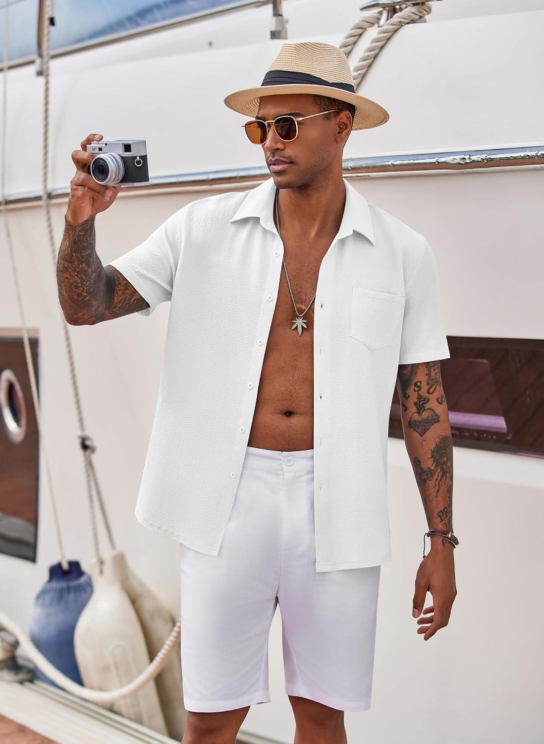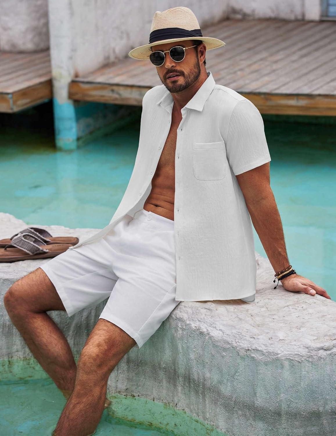 COOFANDY Mens Summer Button Down Shirts Short Sleeve Casual Summer Shirts Beach Wedding Shirts White