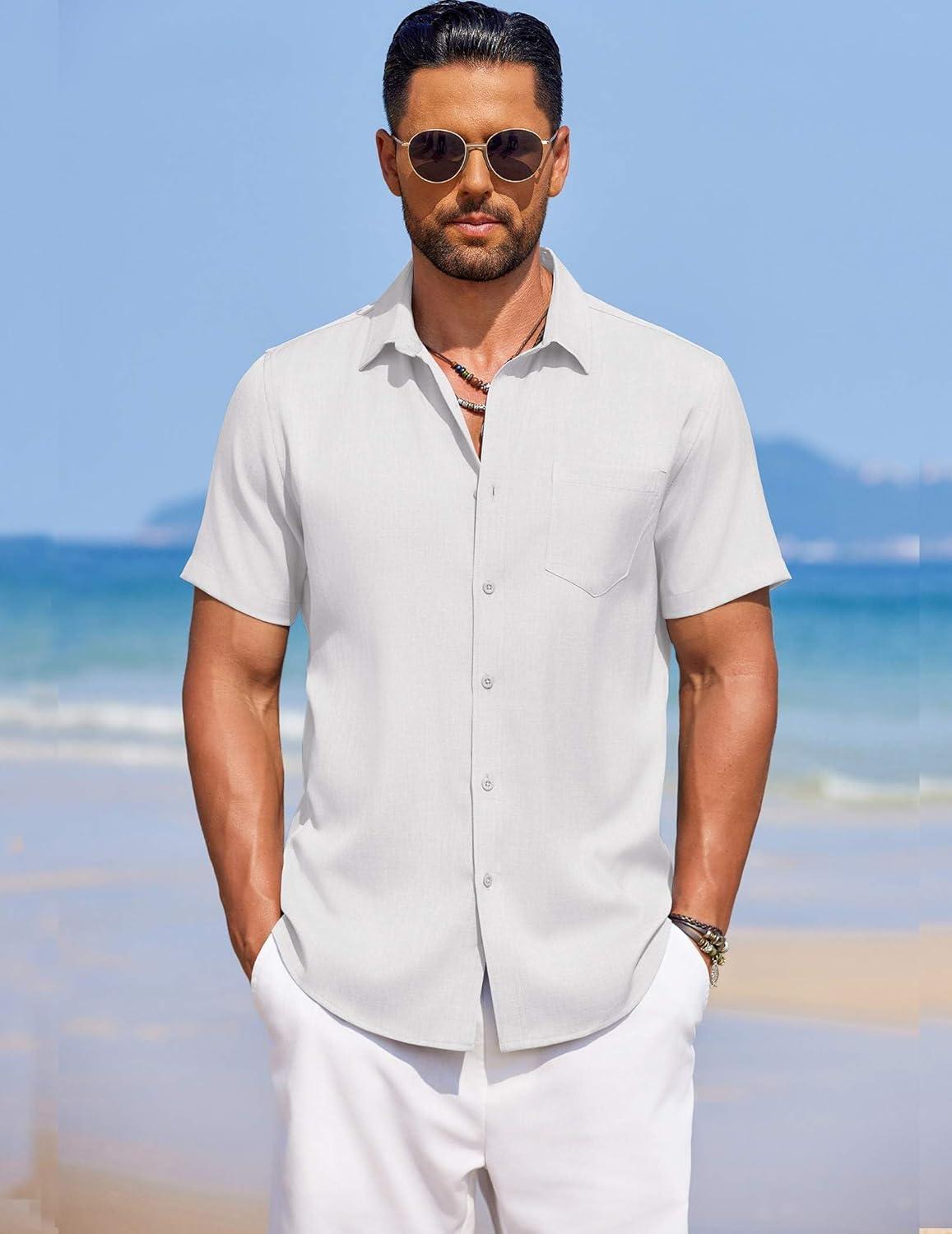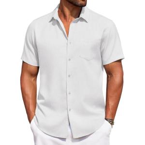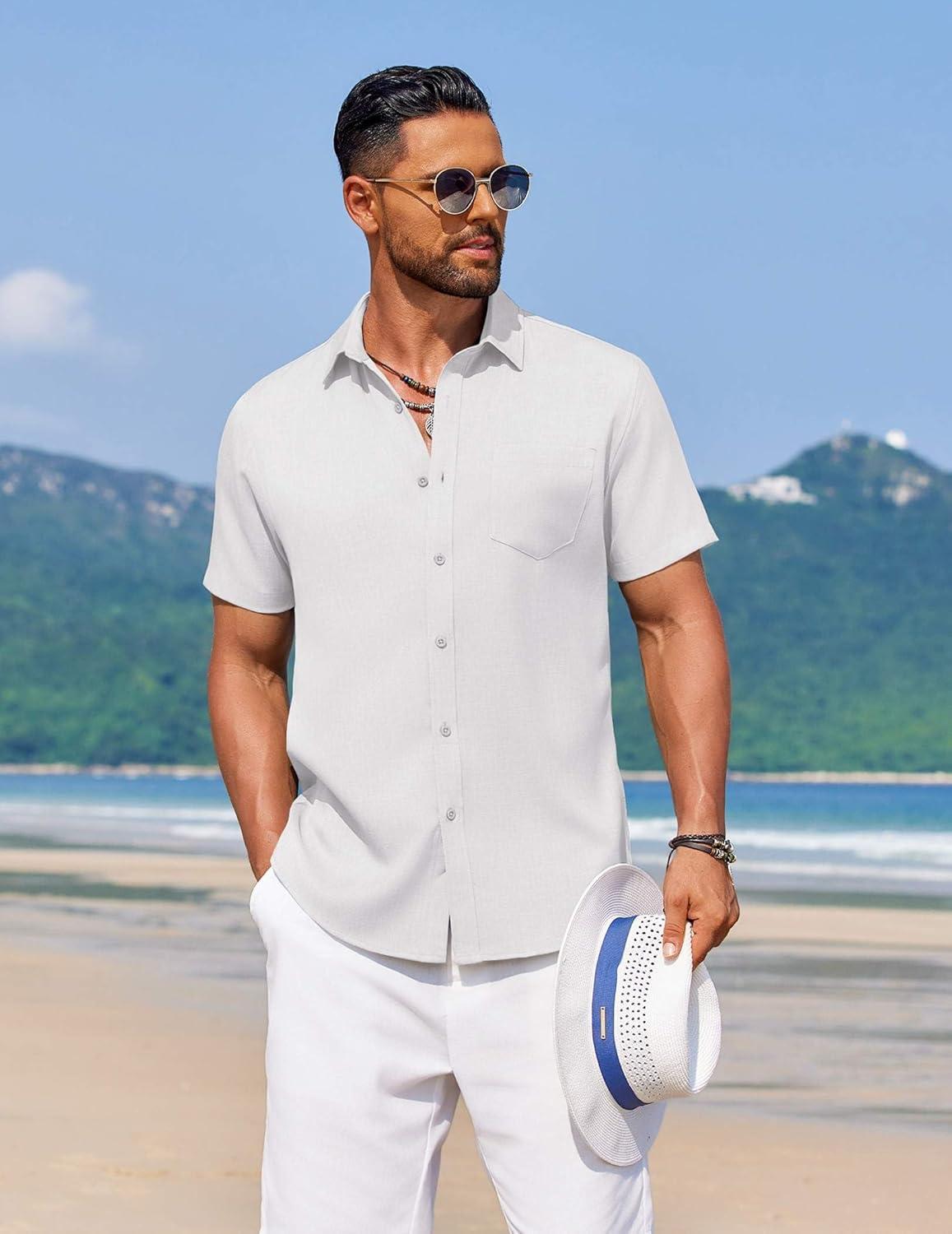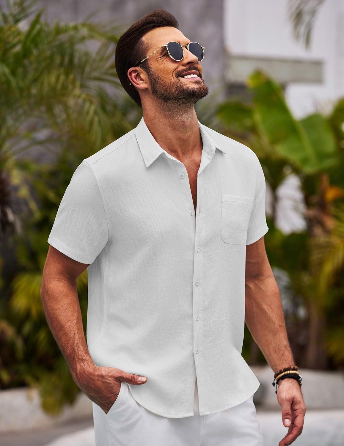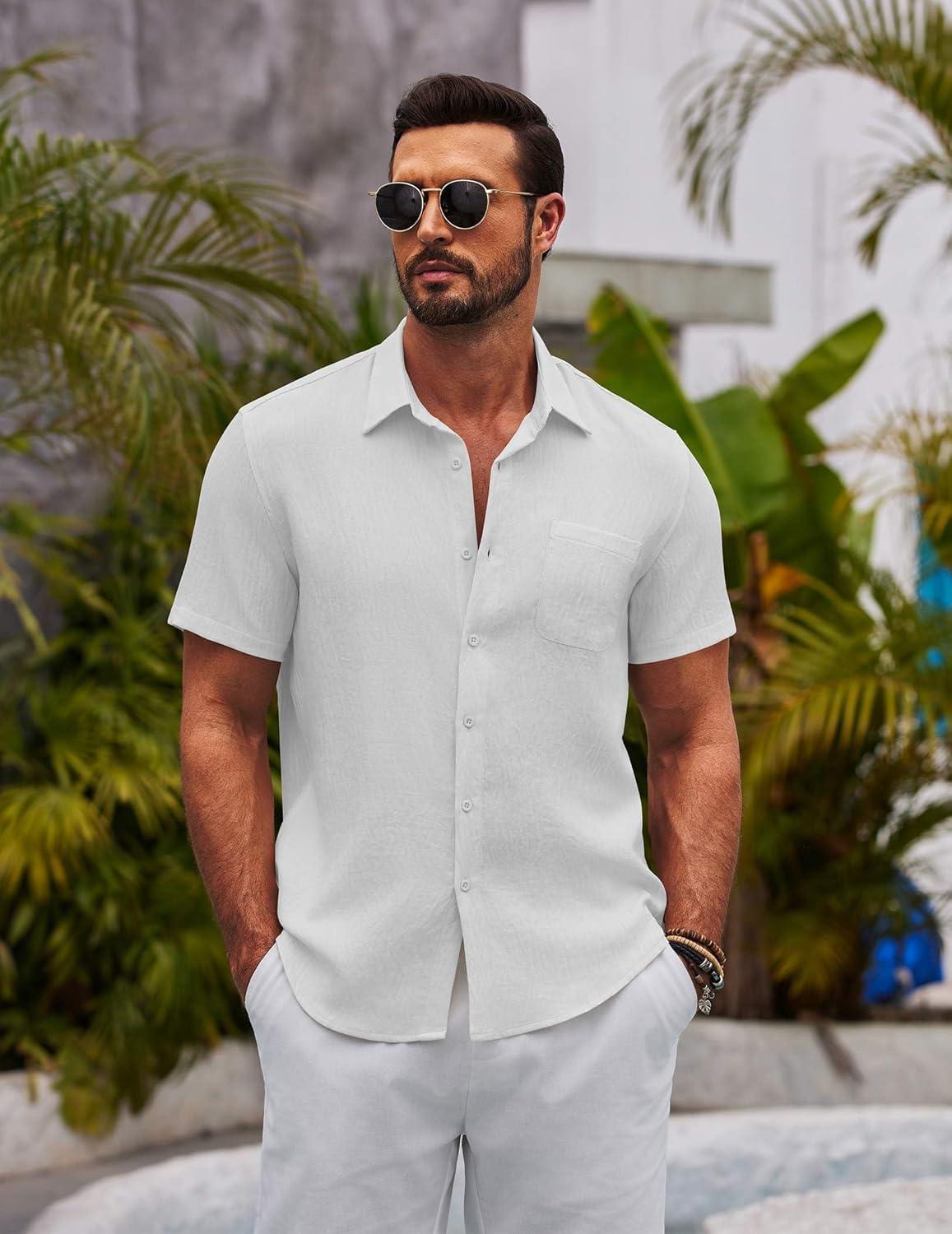 COOFANDY Mens Casual Summer Beach Shirt Button Down Short Sleeve Shirts Vacation Shirt Cotton Linen Shirts(White)