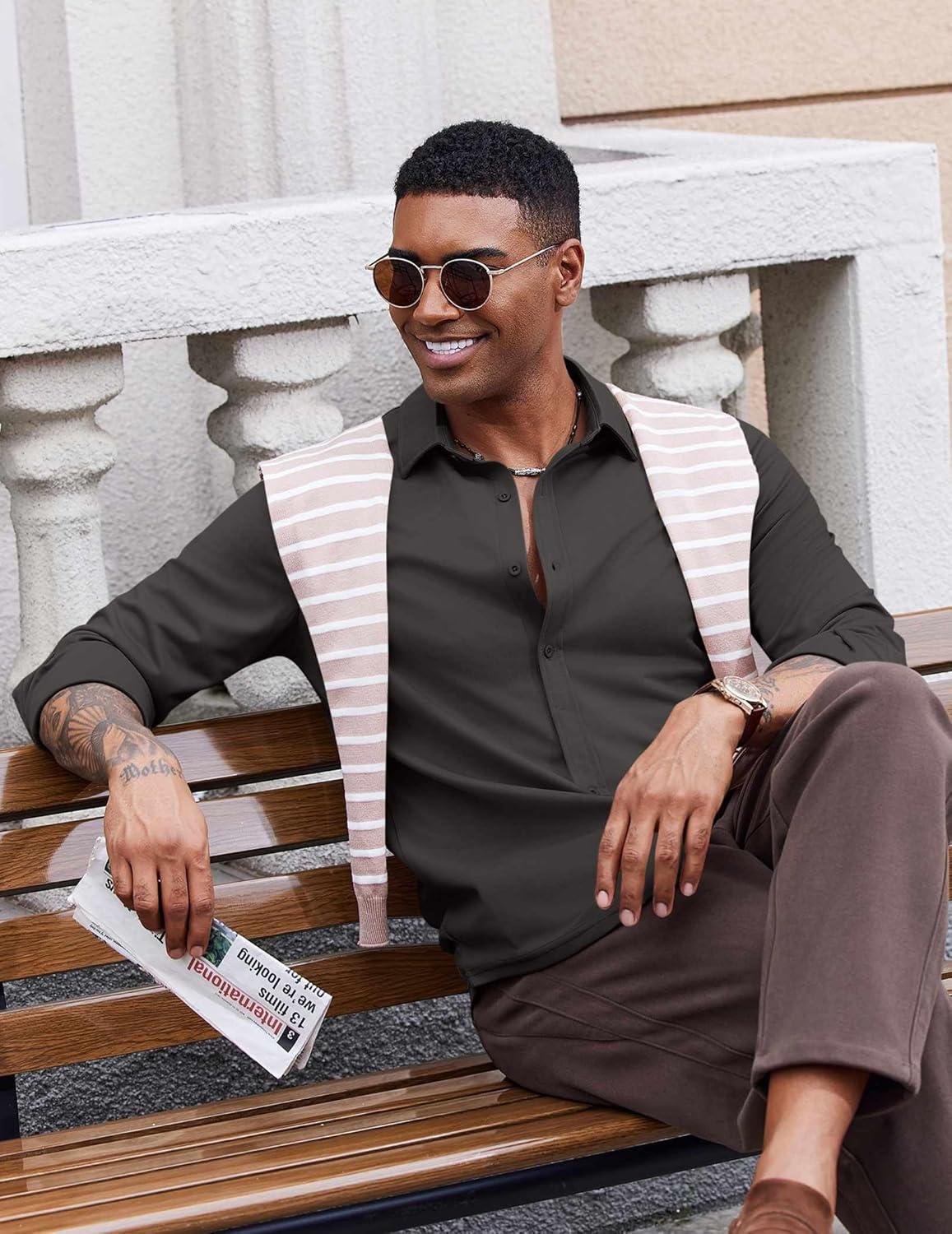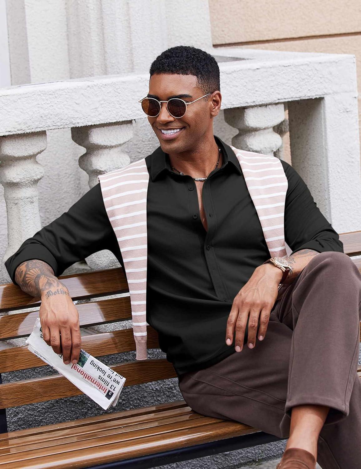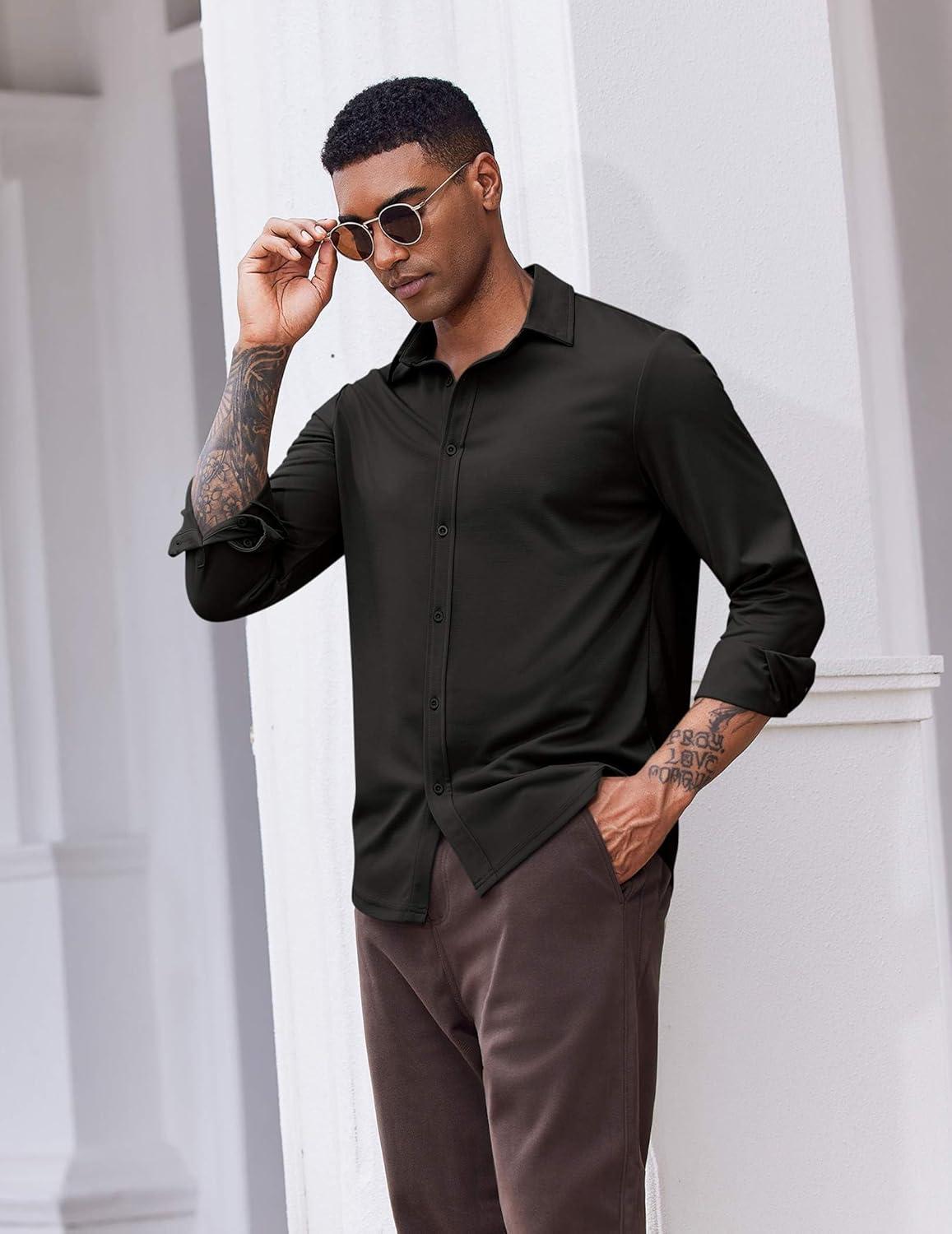 COOFANDY Men’s Casual Button Down Shirt Long Sleeve Wrinkle Free Shirts Loose fit Shirt Textured Stretch Shirts with Pocket(Black)