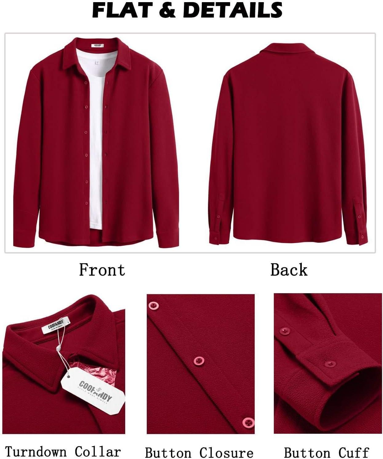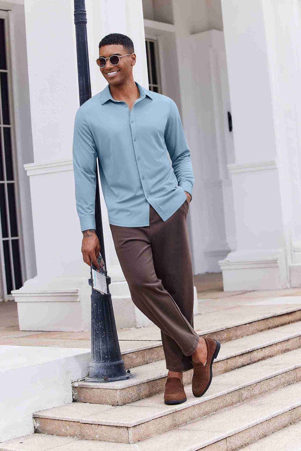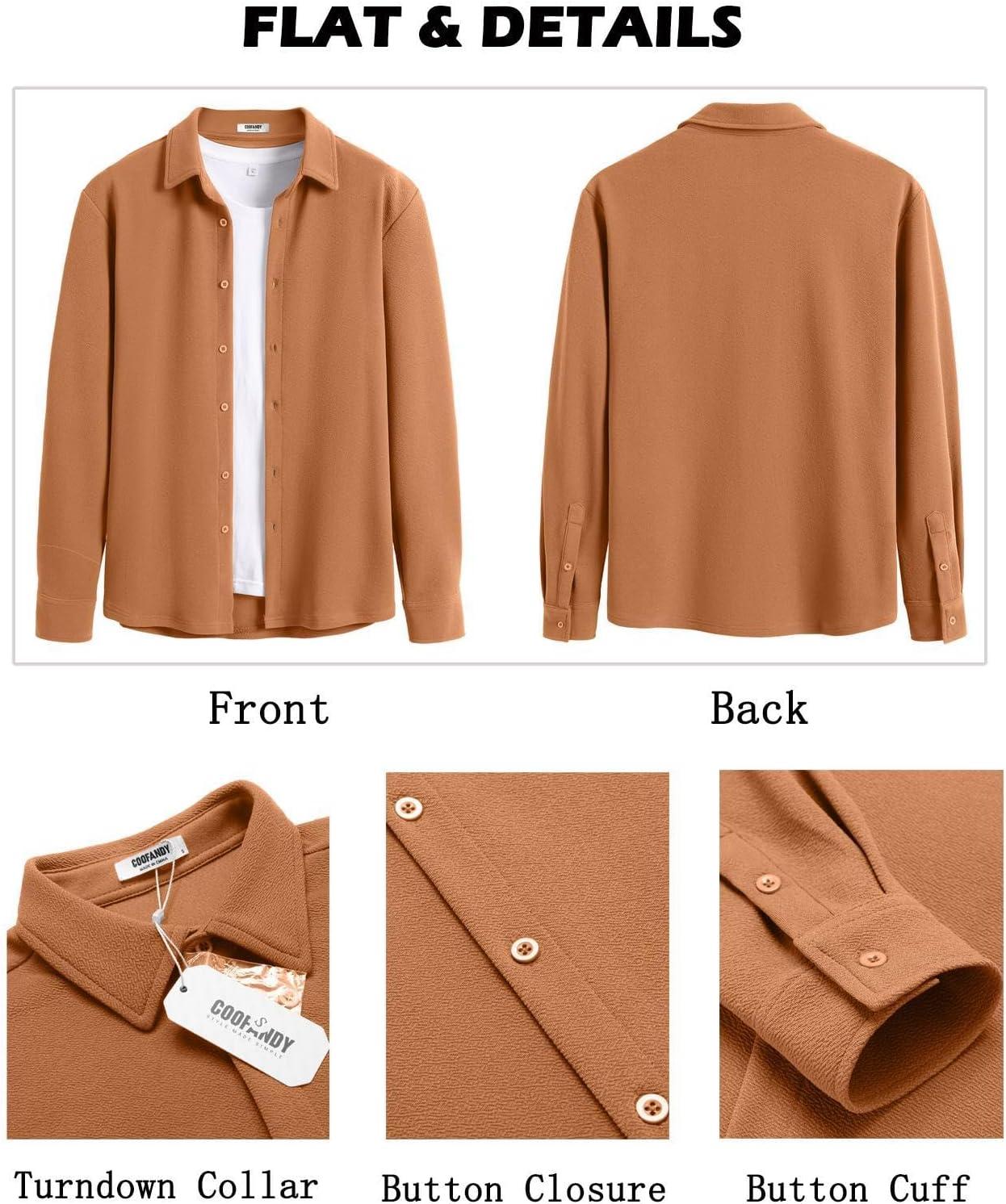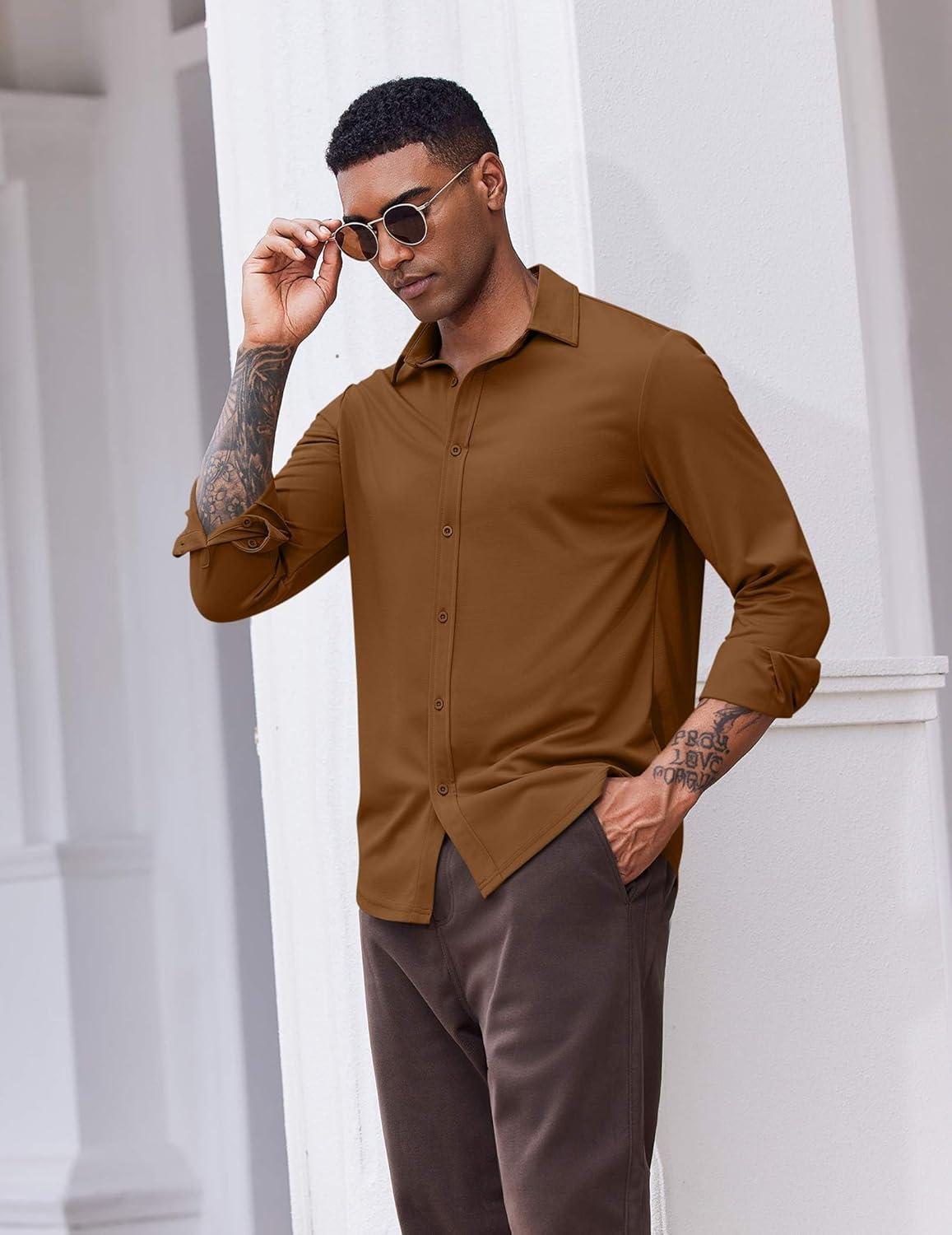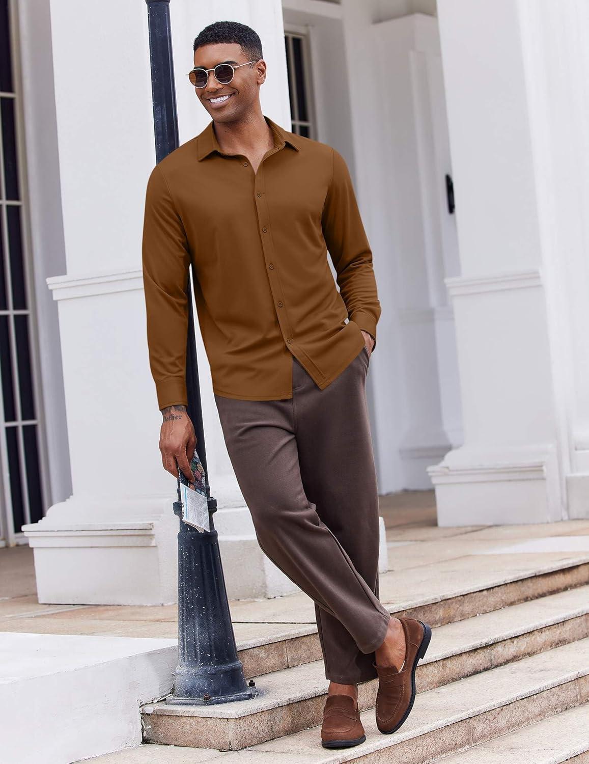 COOFANDY Men’s Casual Button Down Shirt Long Sleeve Wrinkle Free Shirts Loose fit Shirt Textured Stretch Shirts with Pocket(Brown)