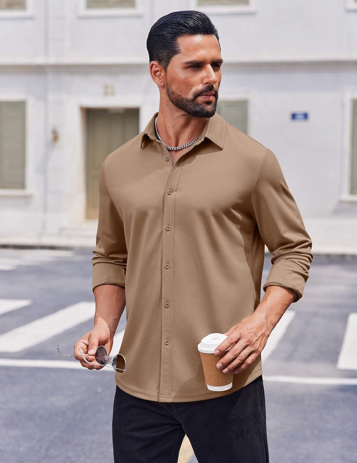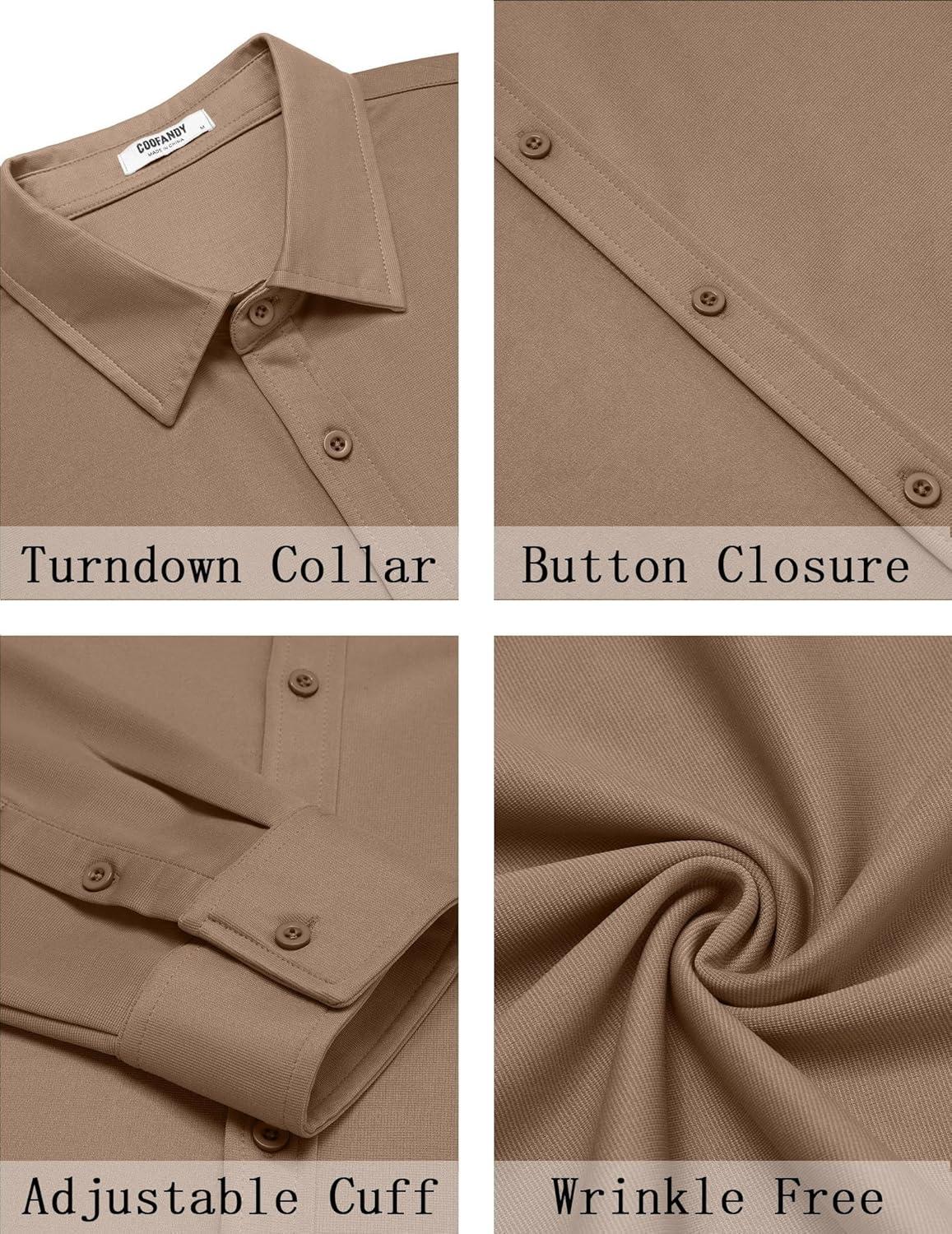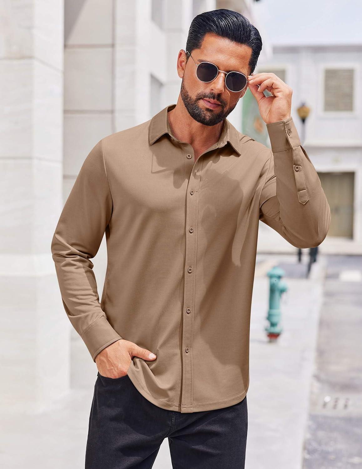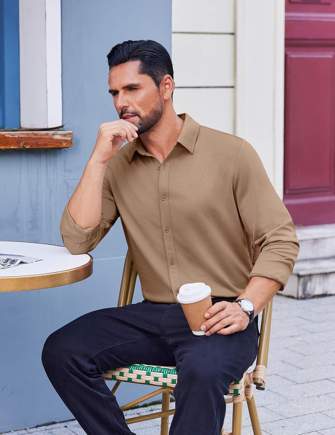 COOFANDY Men’s Casual Button Down Shirt Long Sleeve Wrinkle Free Shirts Loose fit Shirt Textured Stretch Shirts with Pocket(Light Brown)