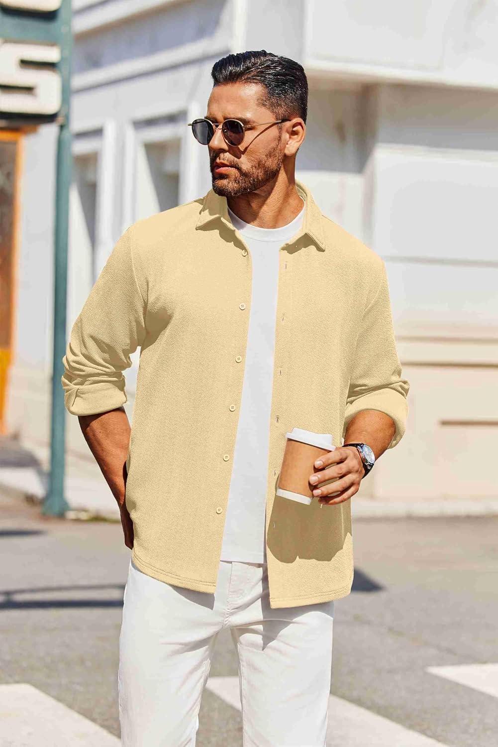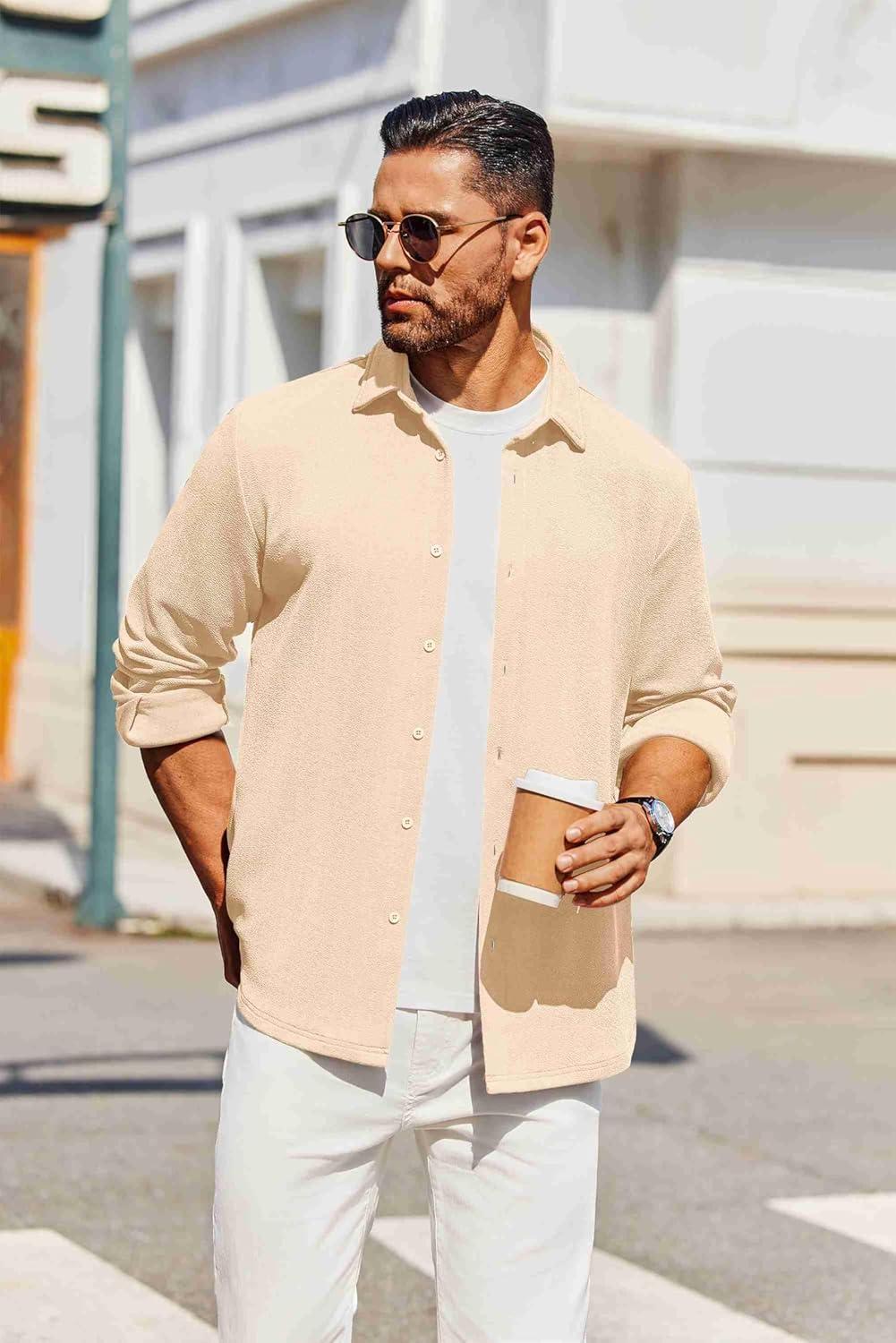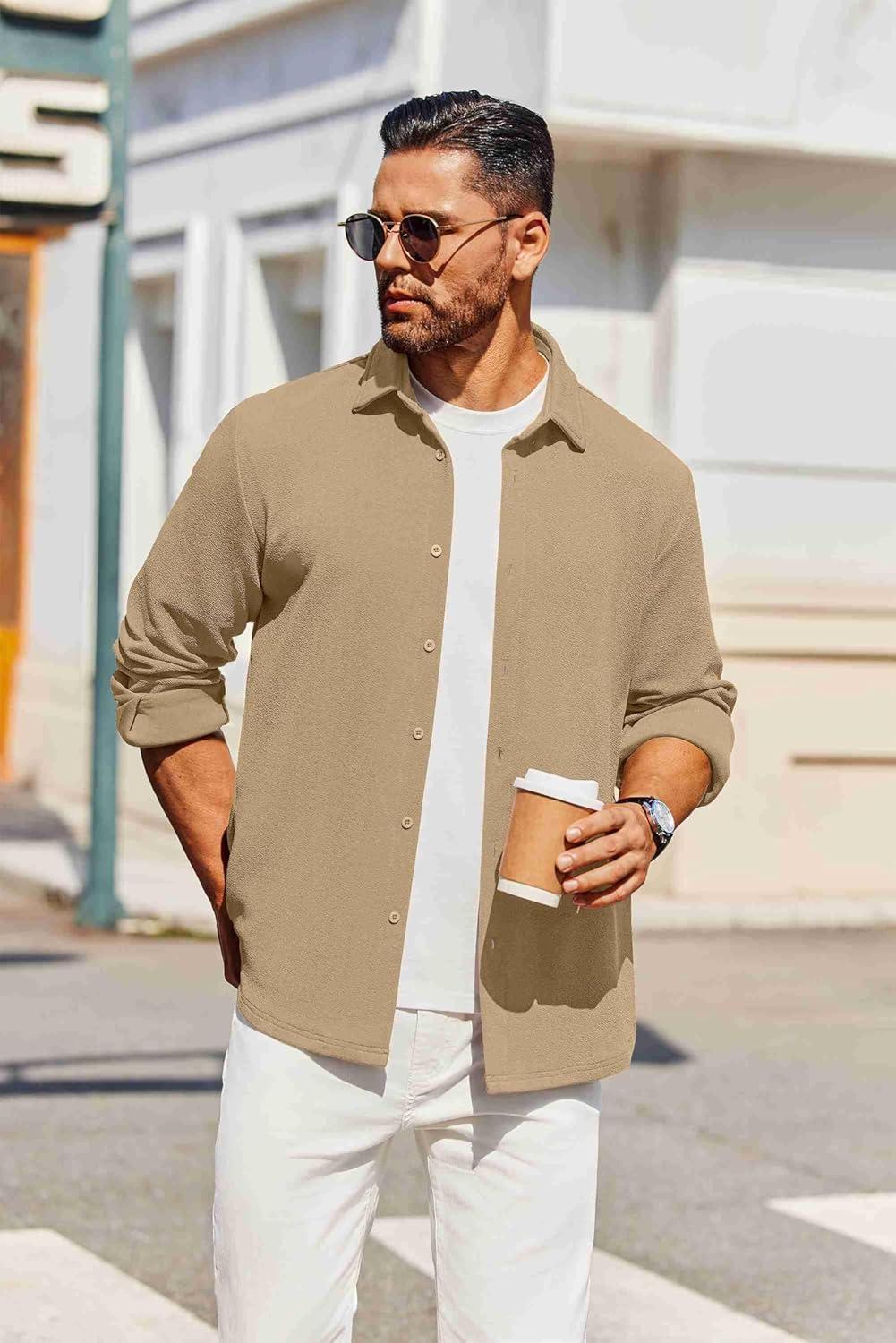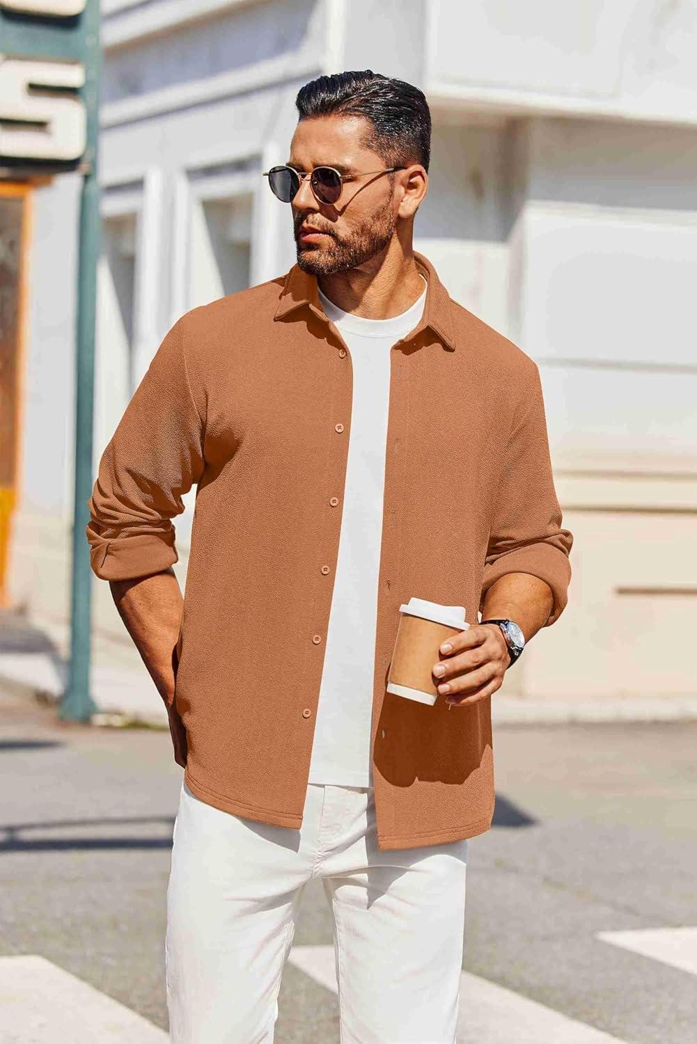 COOFANDY Men’s Casual Button Down Shirt Long Sleeve Wrinkle Free Shirts Loose fit Shirt Textured Stretch Shirts with Pocket(Light Brown)