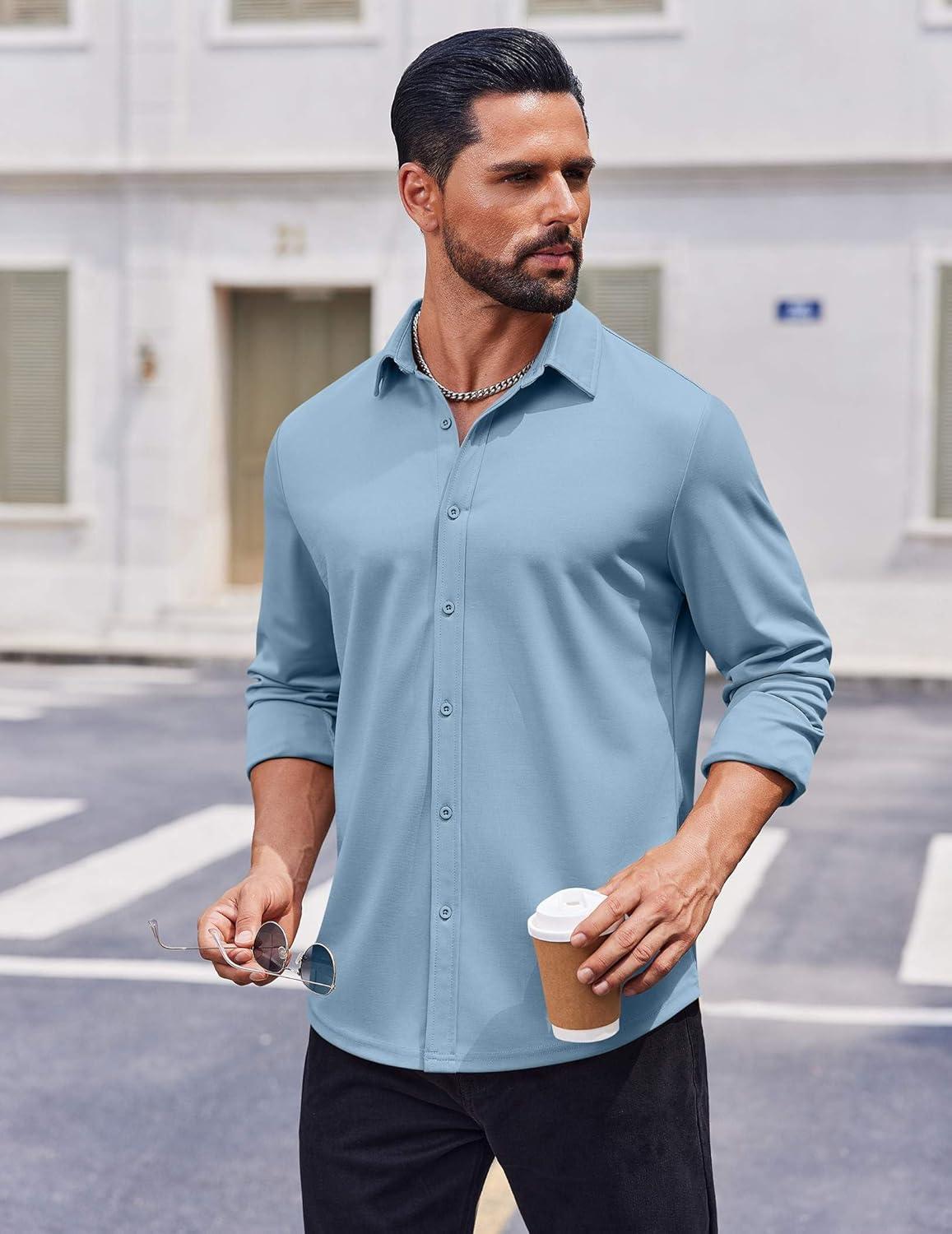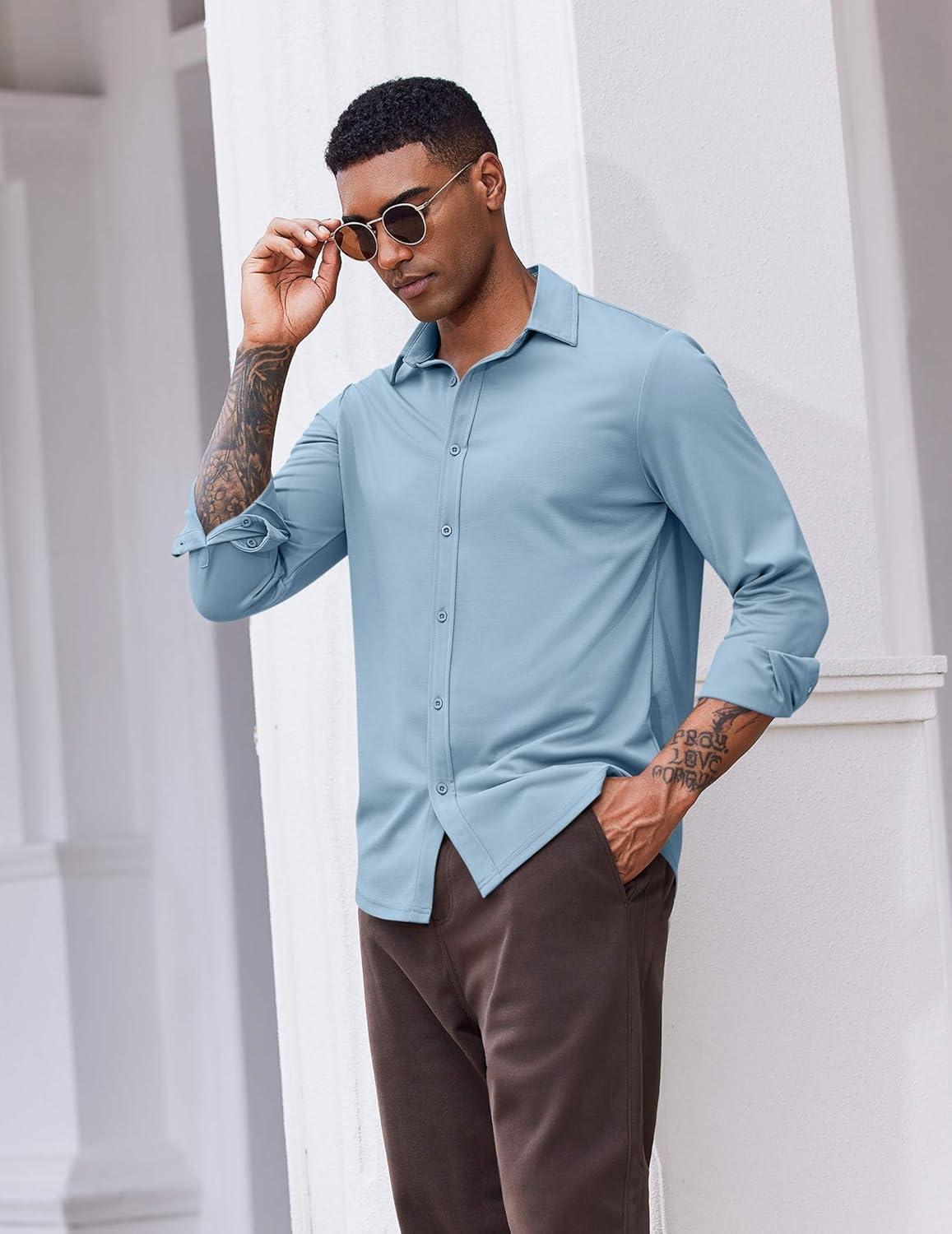 COOFANDY Men’s Casual Button Down Shirt Long Sleeve Untucked Shirt Stretch Denim Dress Shirt with Pockets(Denim Blue)