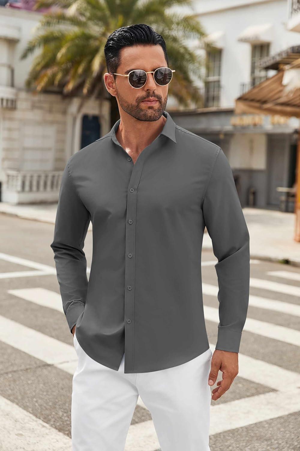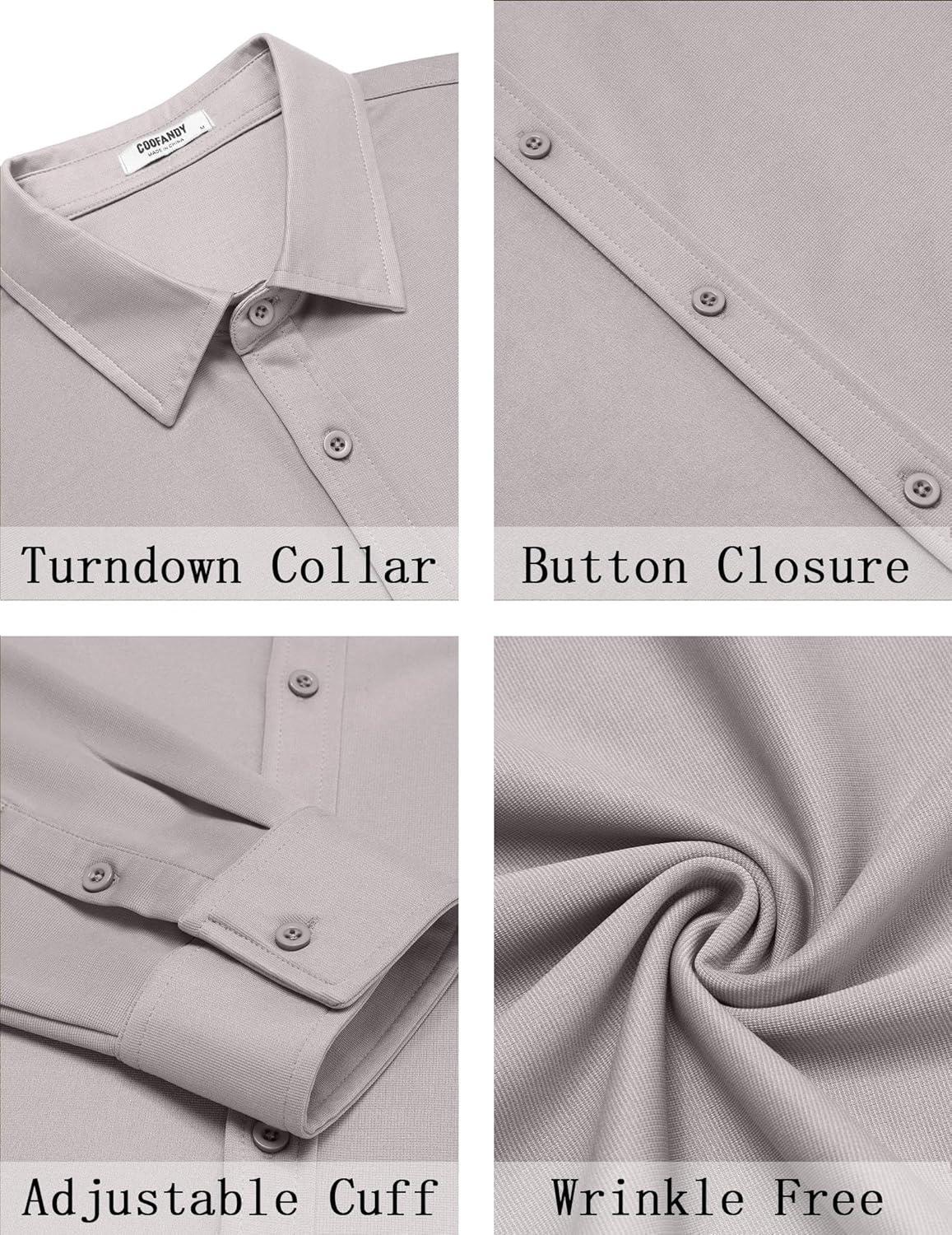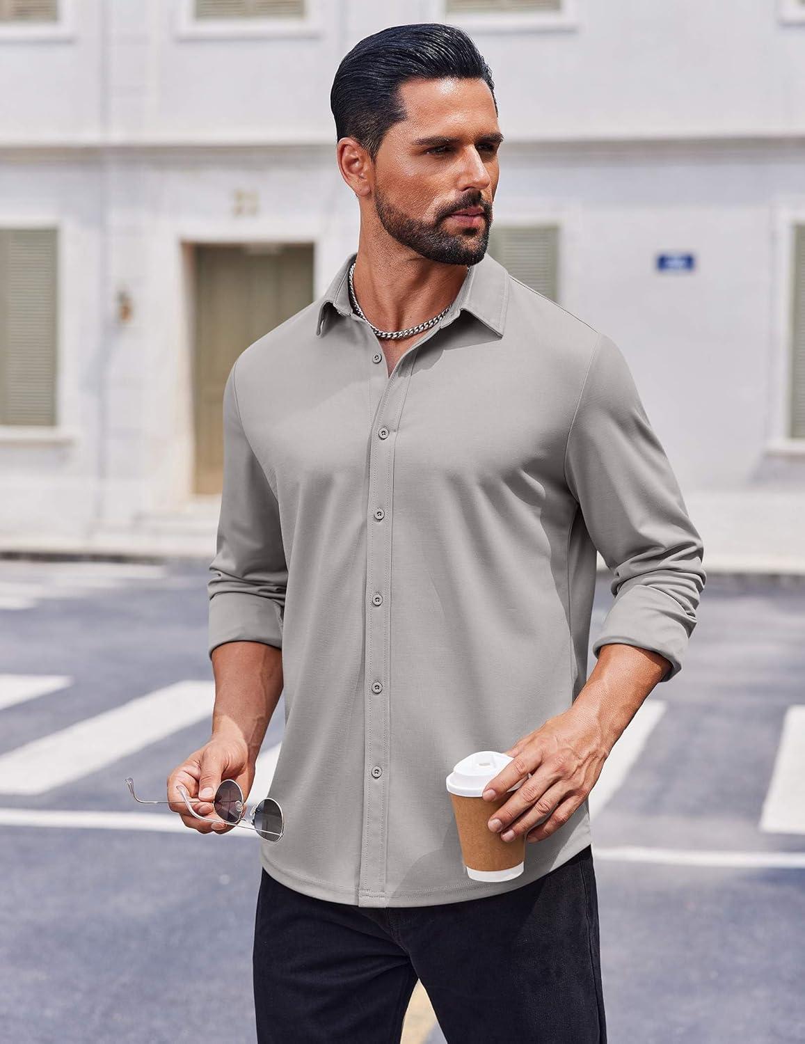 COOFANDY Men’s Casual Button Down Shirt Long Sleeve Untucked Shirt Stretch Denim Dress Shirt with Pockets(Grey)